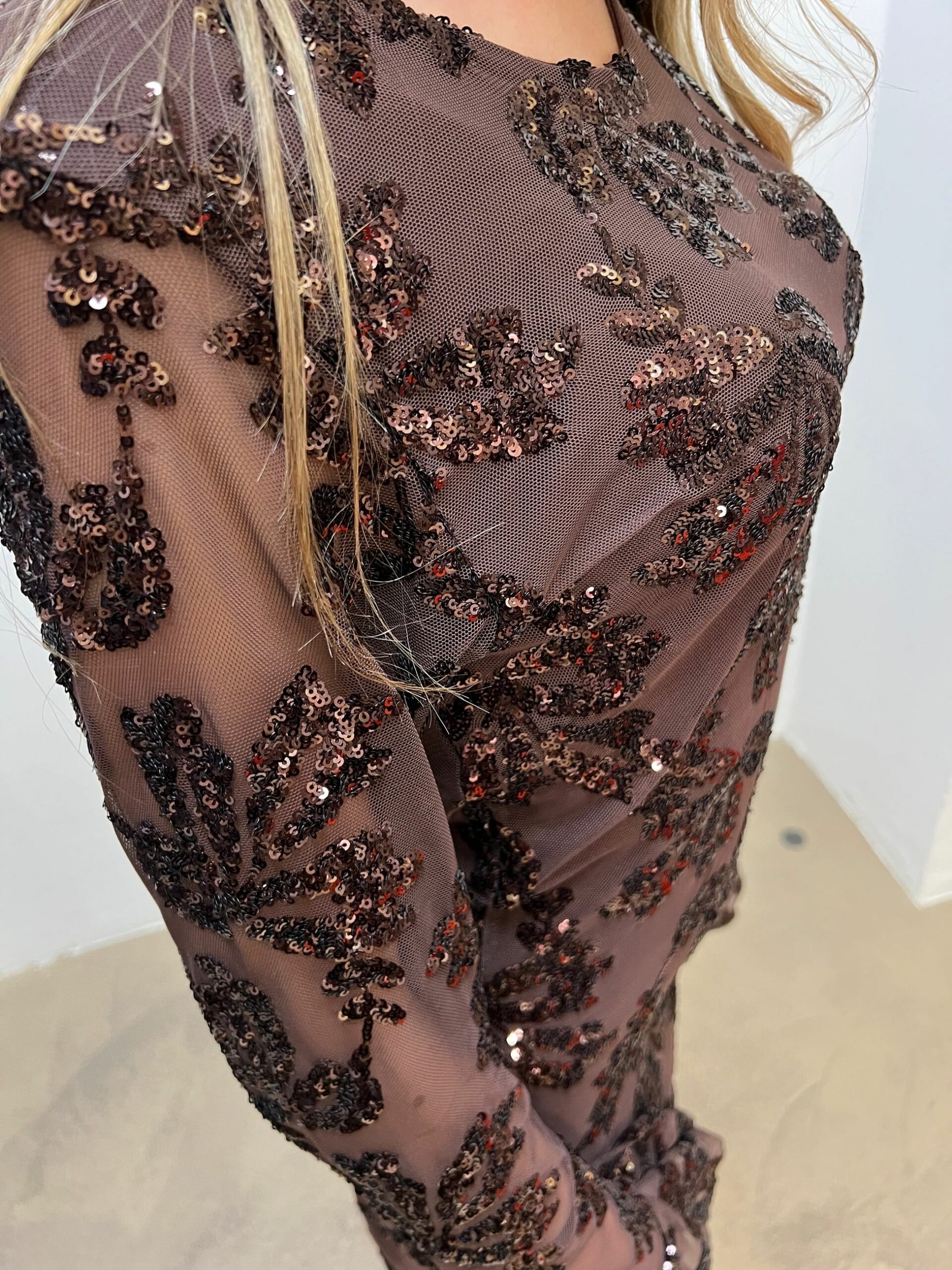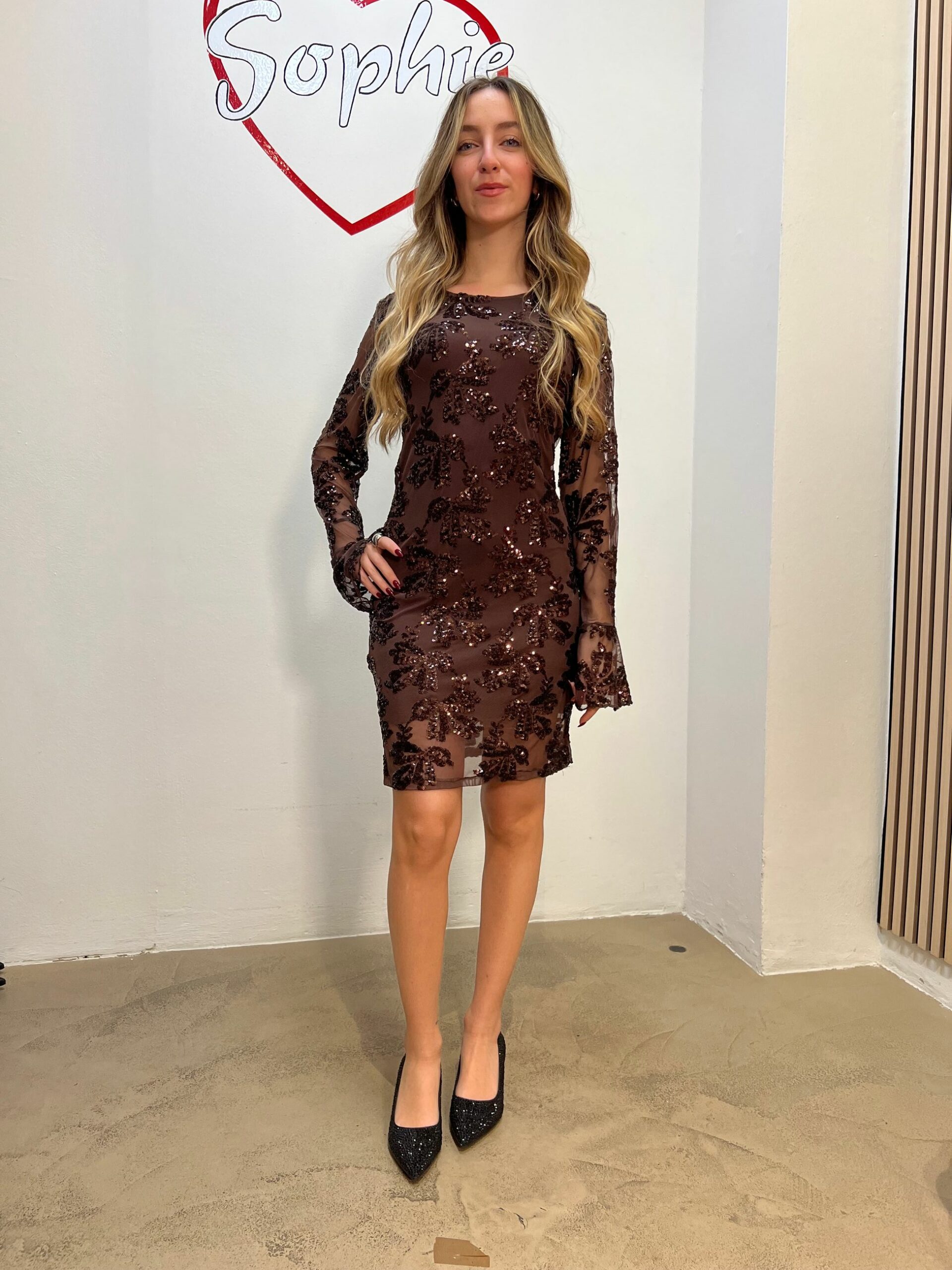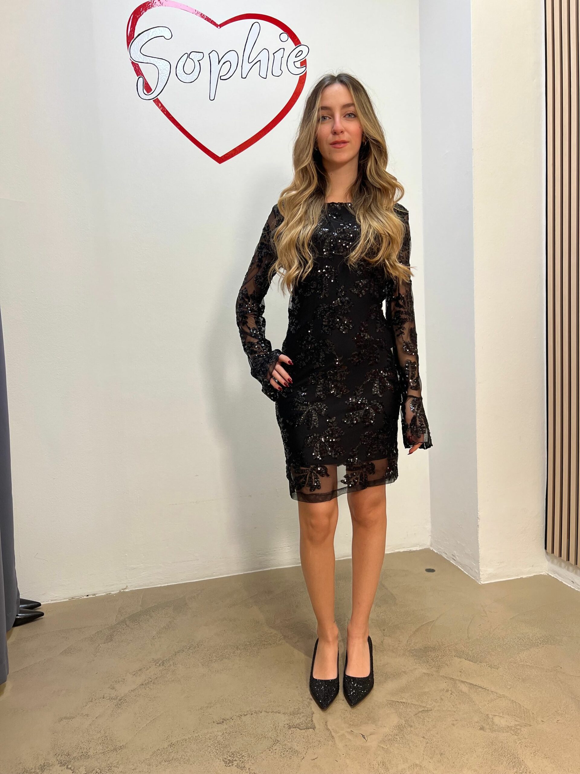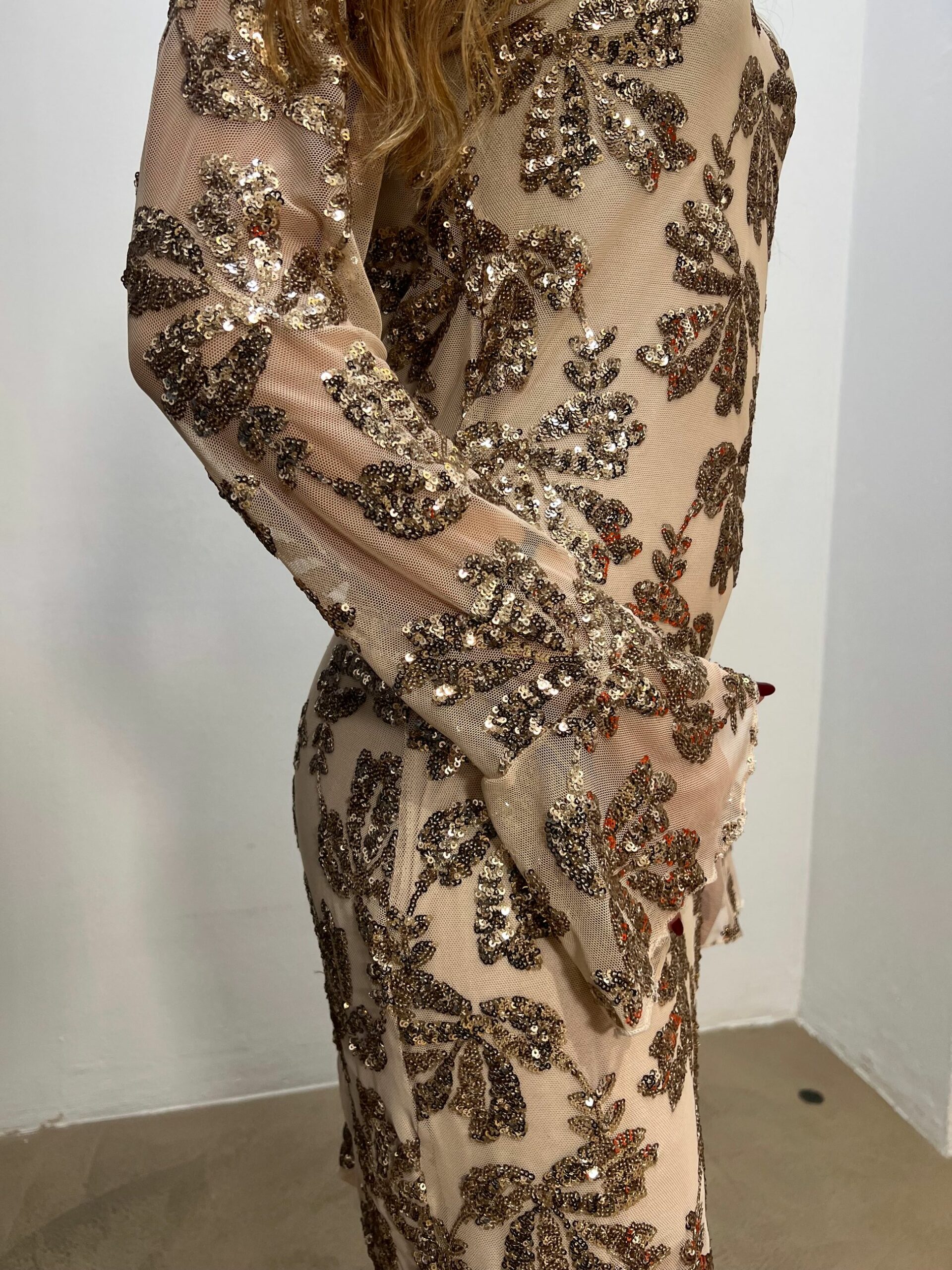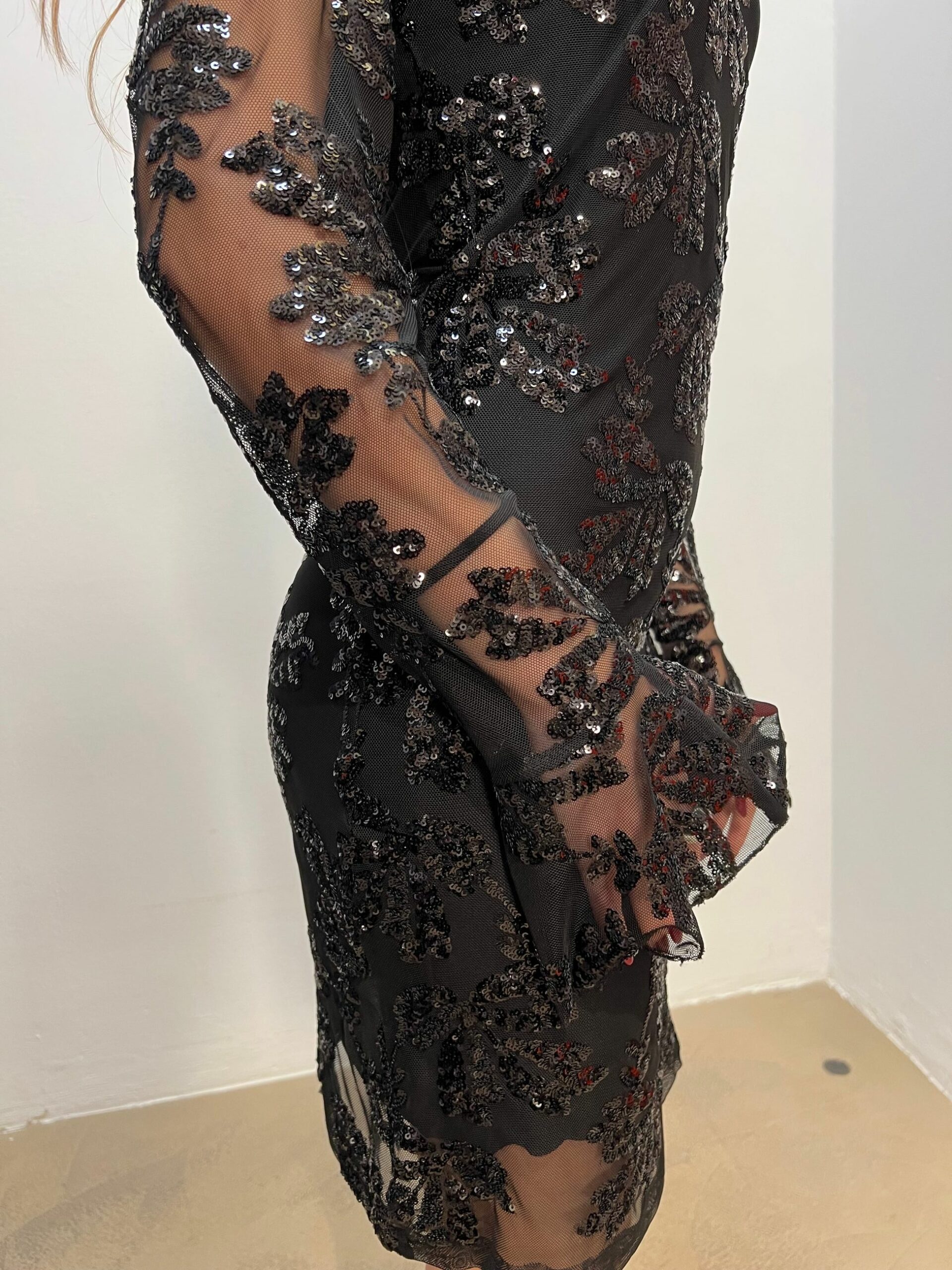 ABITO CORTO IN MICROTULLE FODERATO CON RICAMI IN PAILLETTES, MANICHE SEMITRASPARENTI.