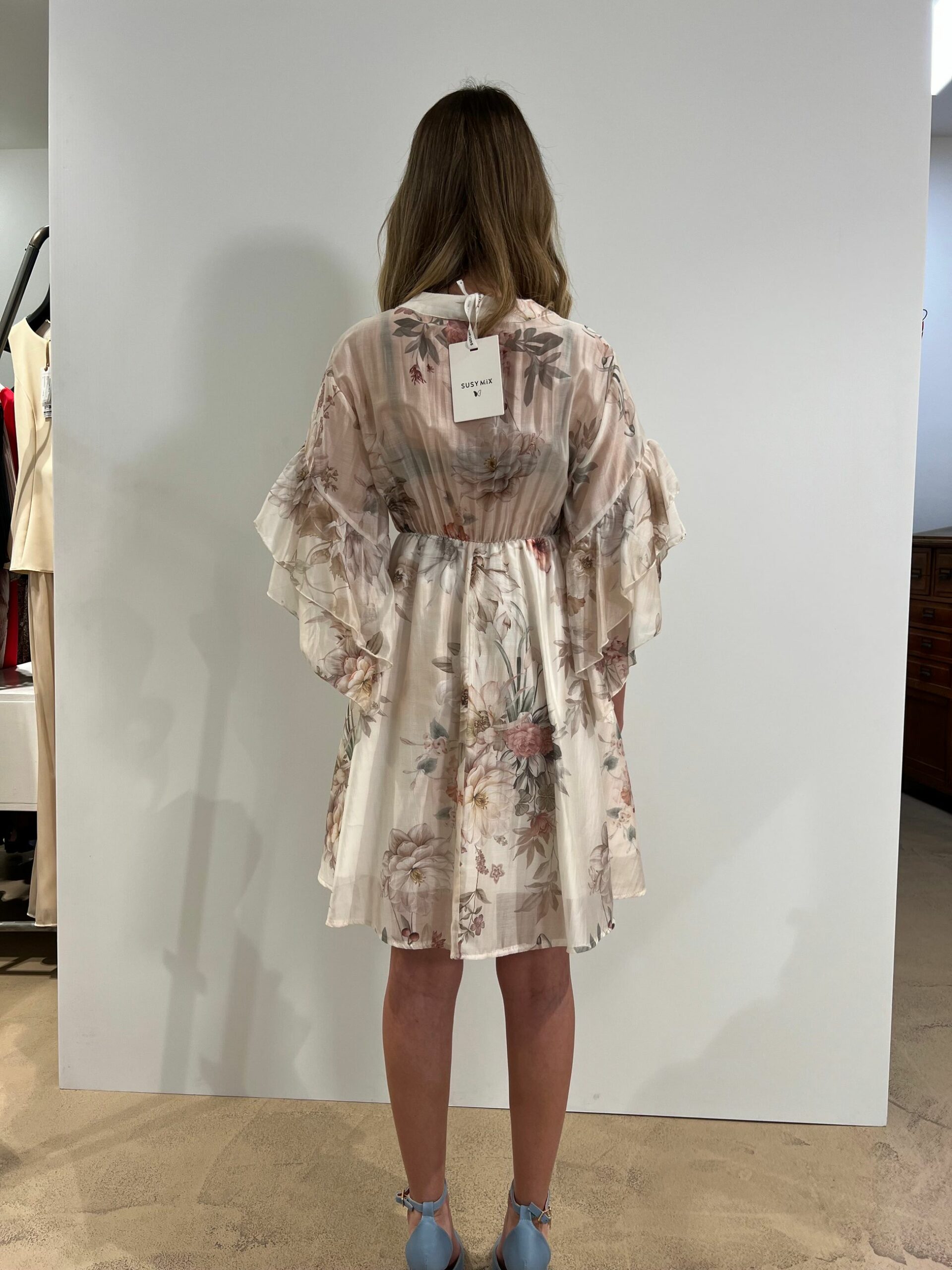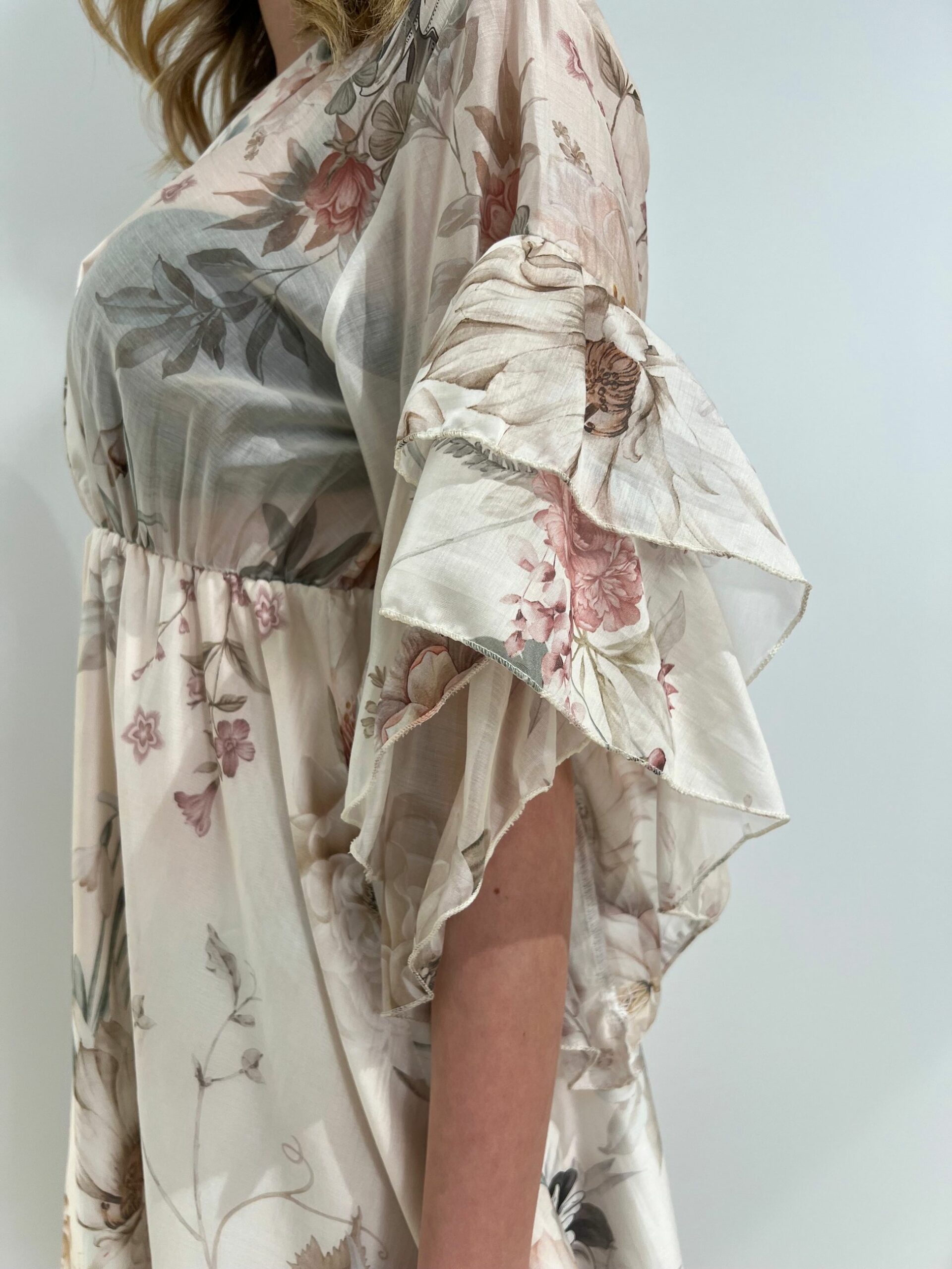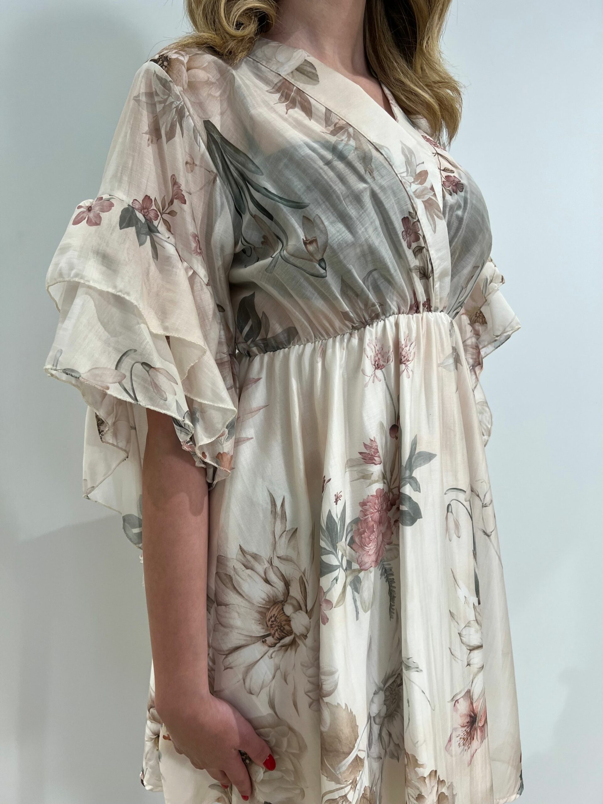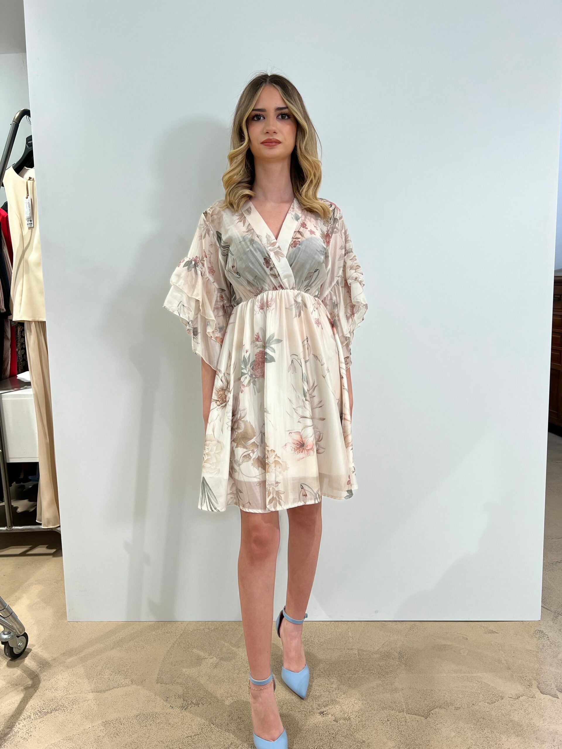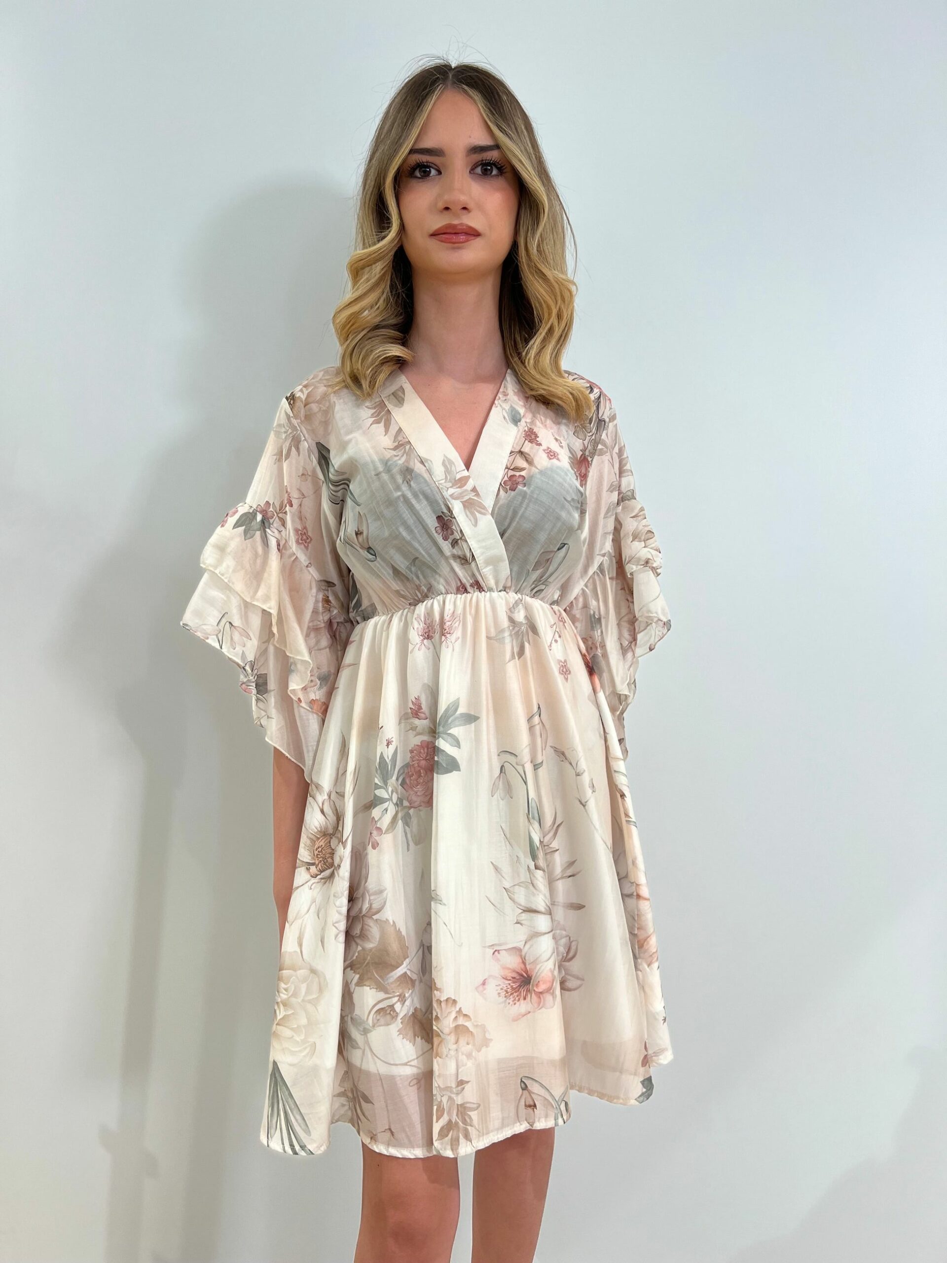 ABITO CORTO A VESTIBILITA’ MORBIDA IN FANTASIA, SCOLLO A V INCROCIATO