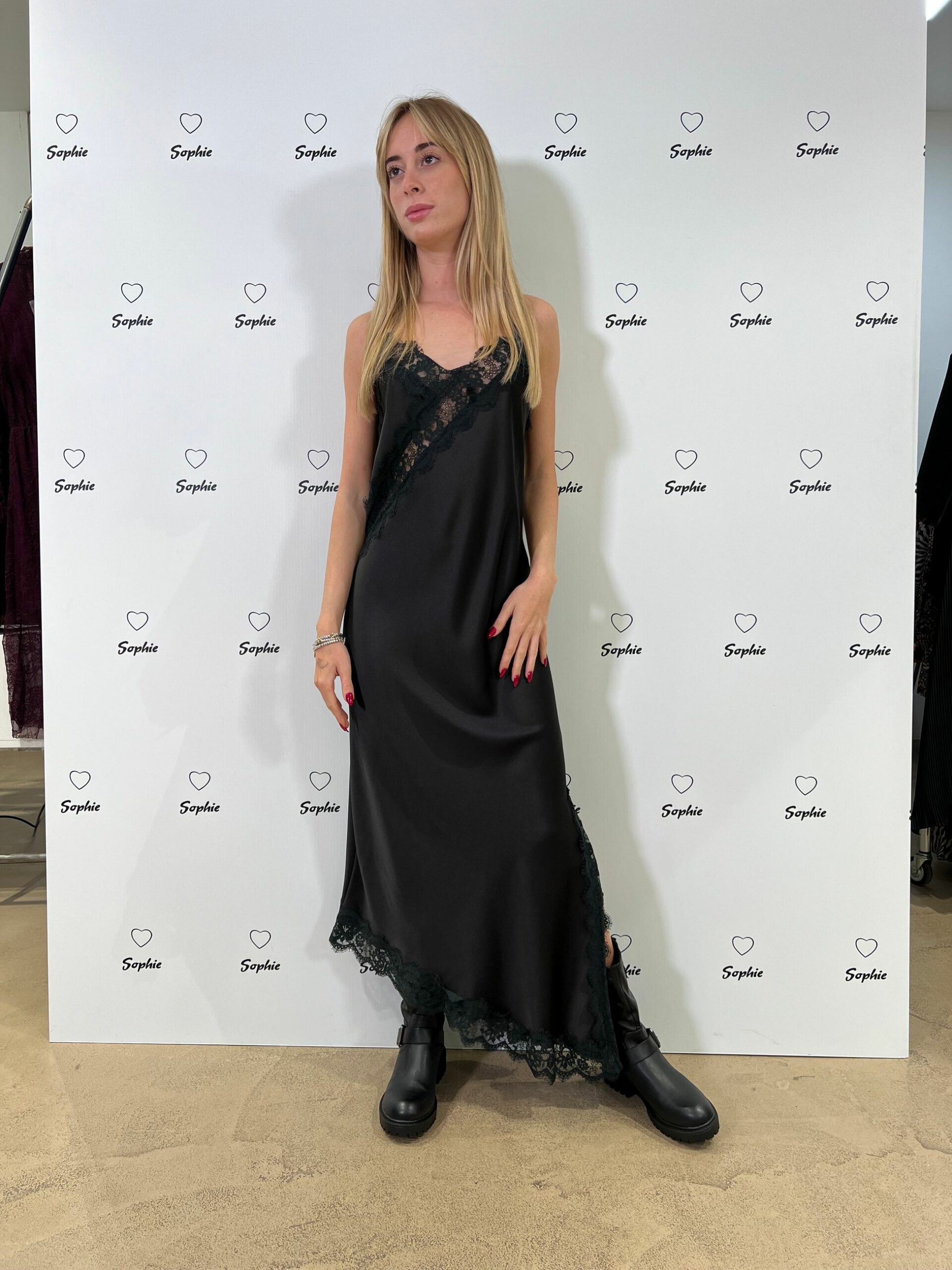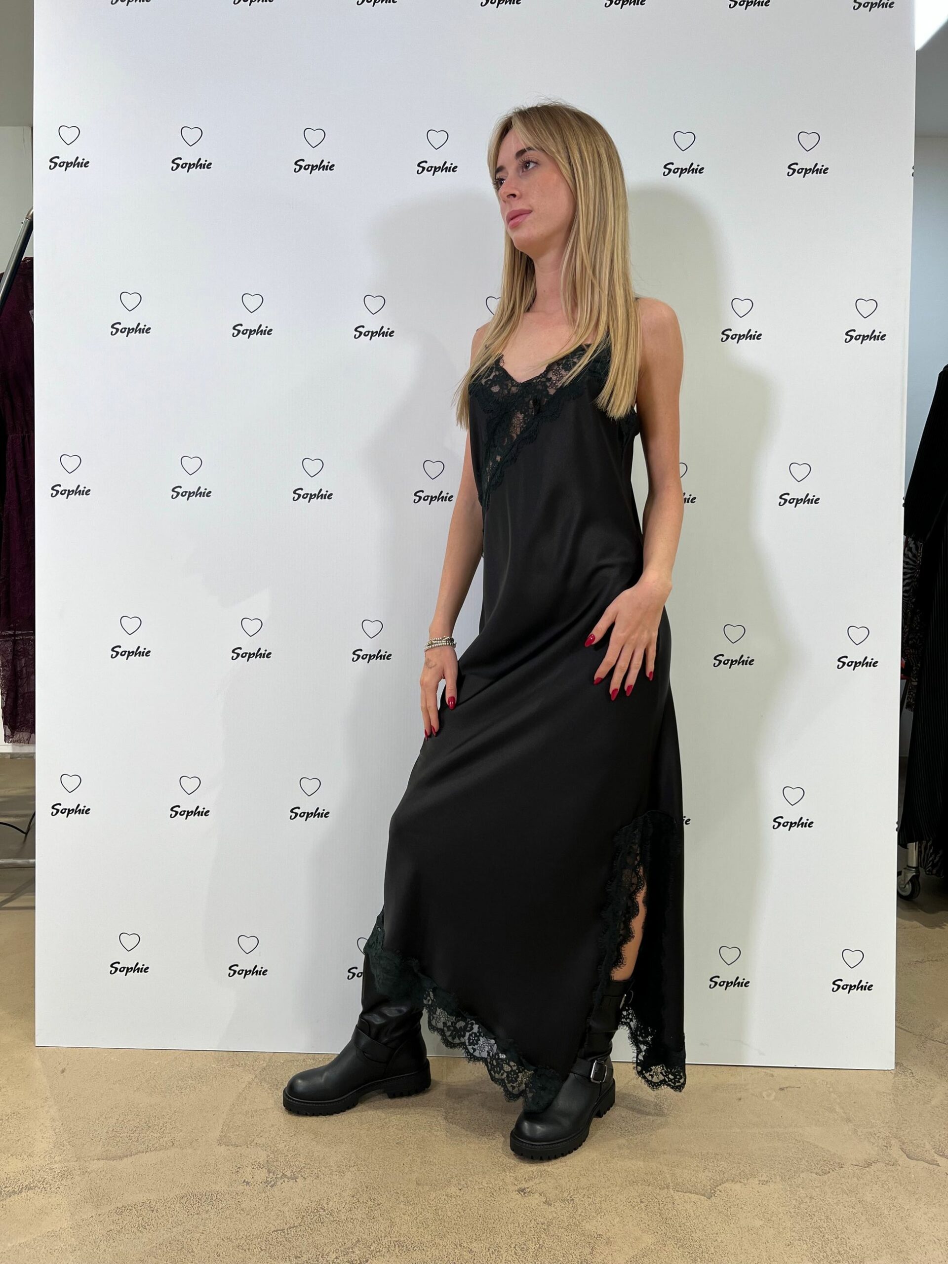 ABITO LUNGO IN RASO CON PIZZO E SPACCO LATERALE SUL LATO SINISTRO, SPALLINE REGOLABILI