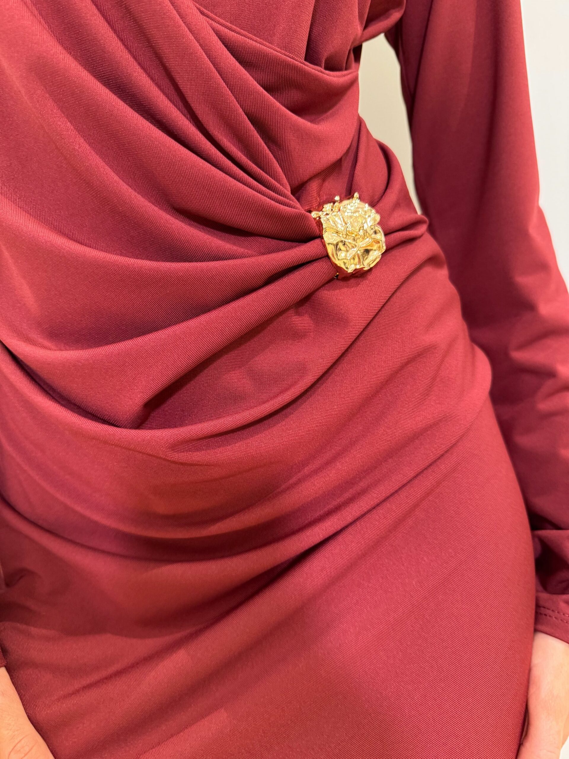 ABITO SCOLLO A V CON DRAPPEGGIO ED ELEMENTO COLOR ORO