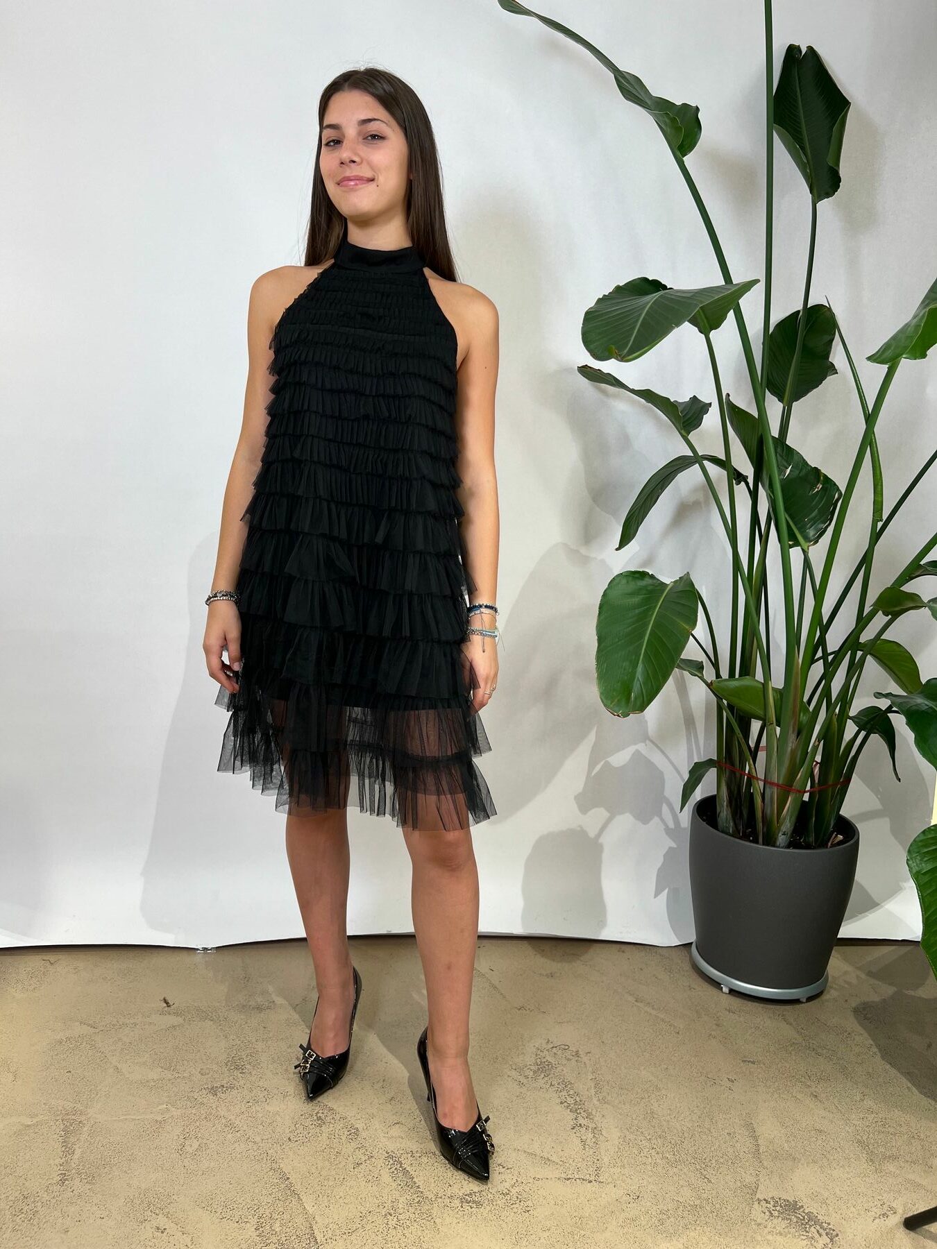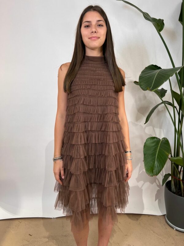 ABITO SMANICATO IN TULLE A BALZE, FODERATO. SCOLLATURA ALL’AMERICANA