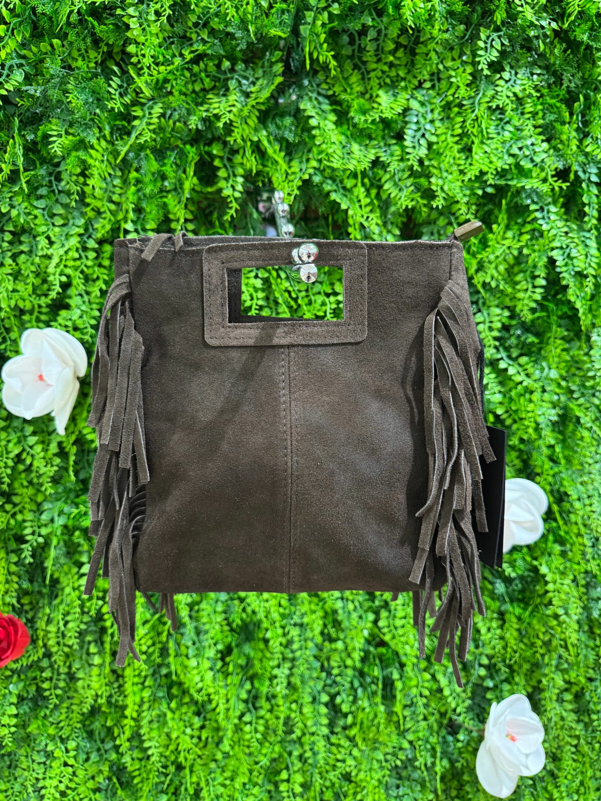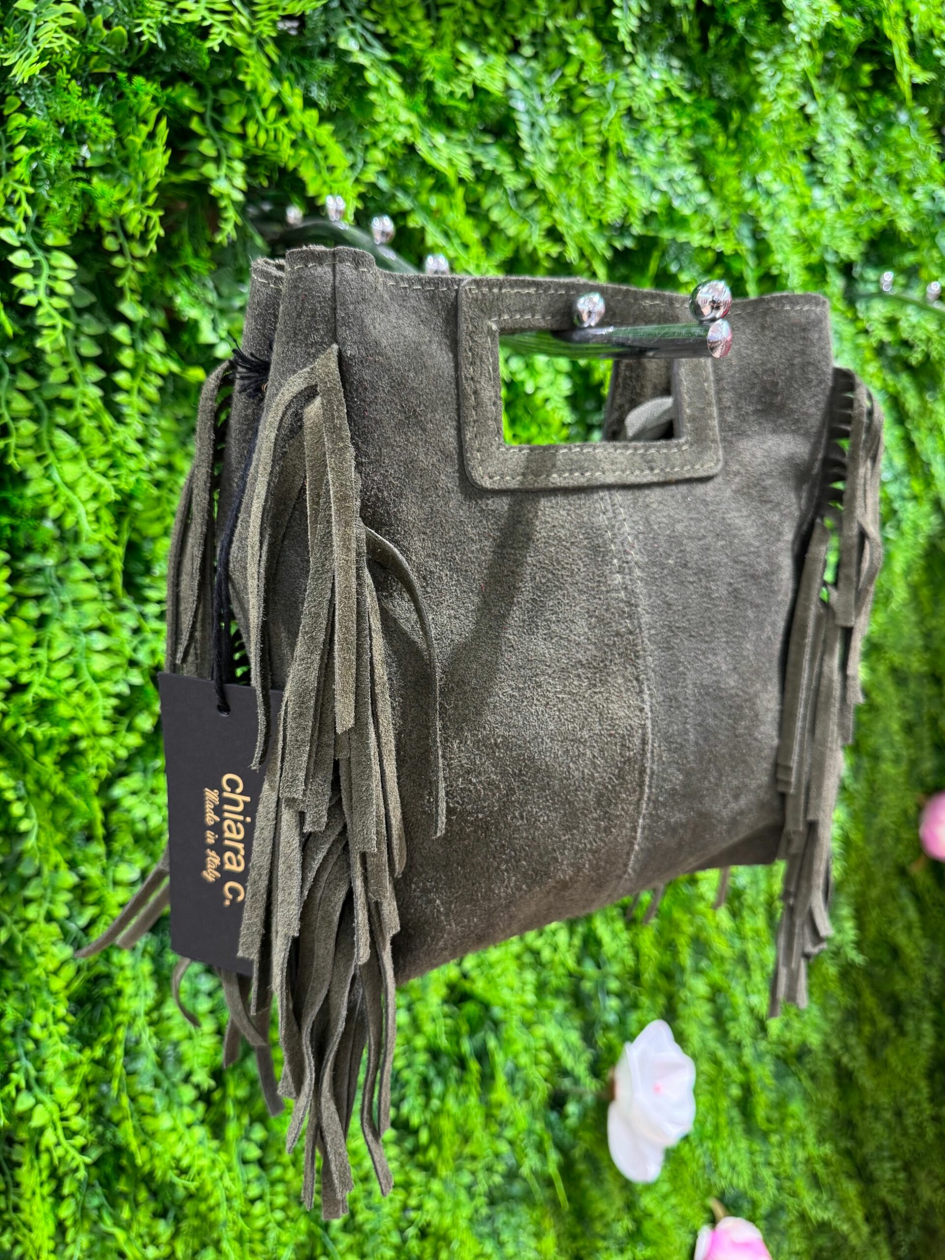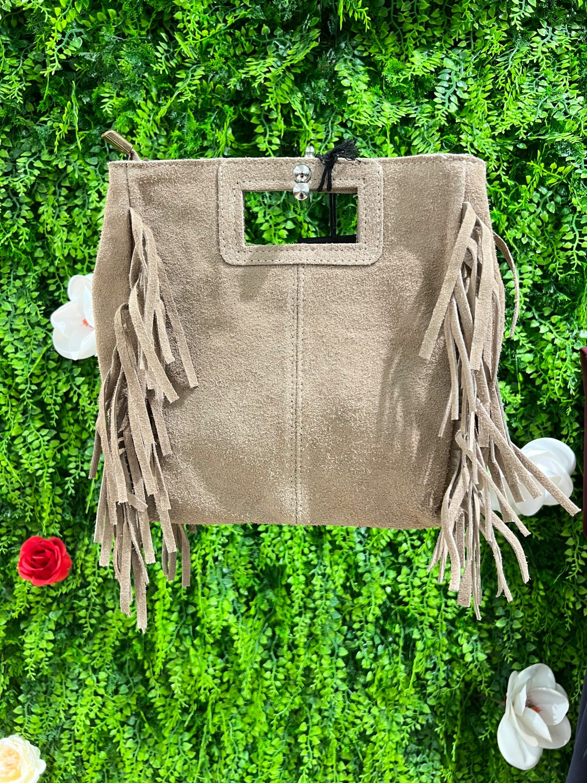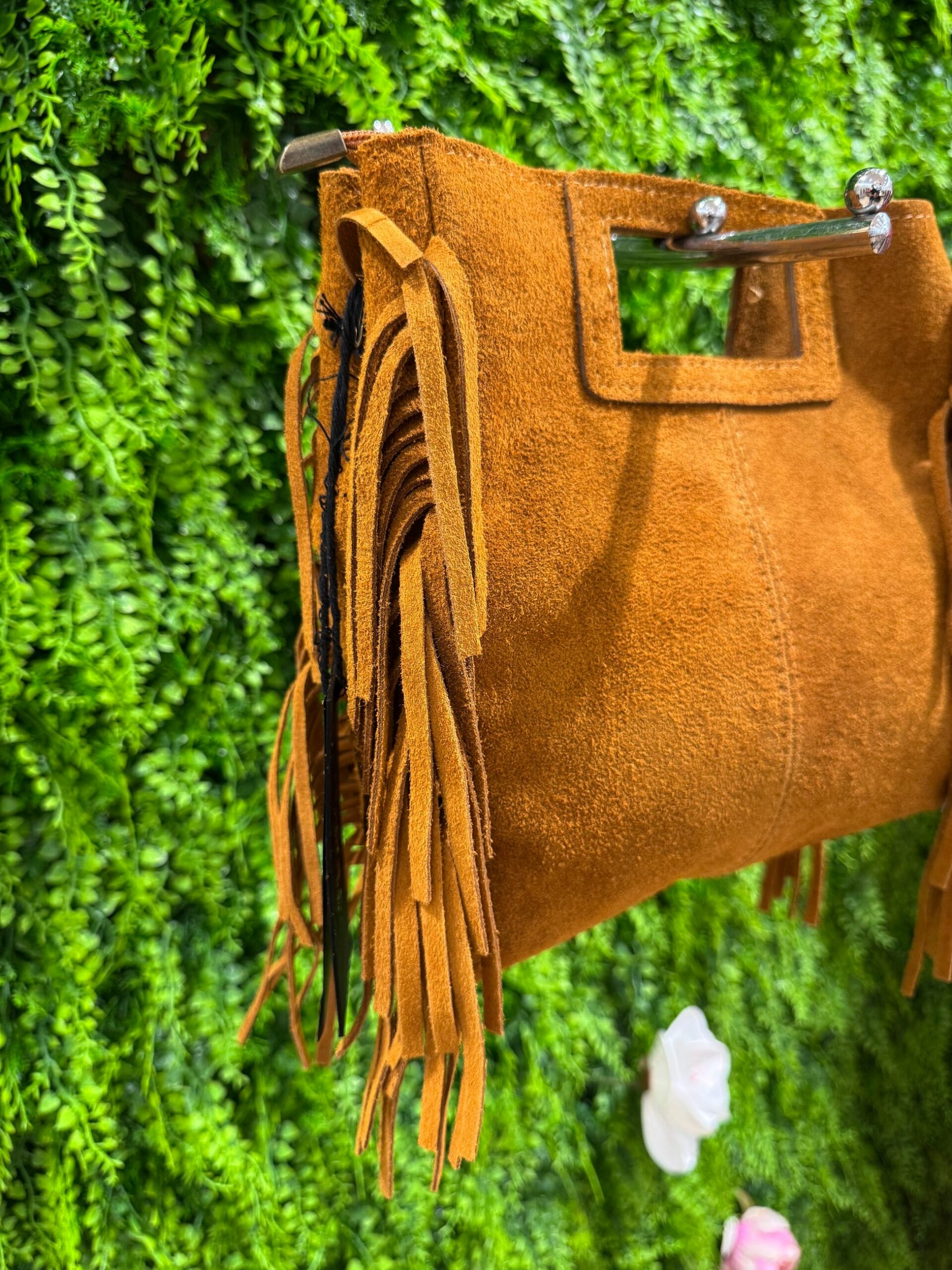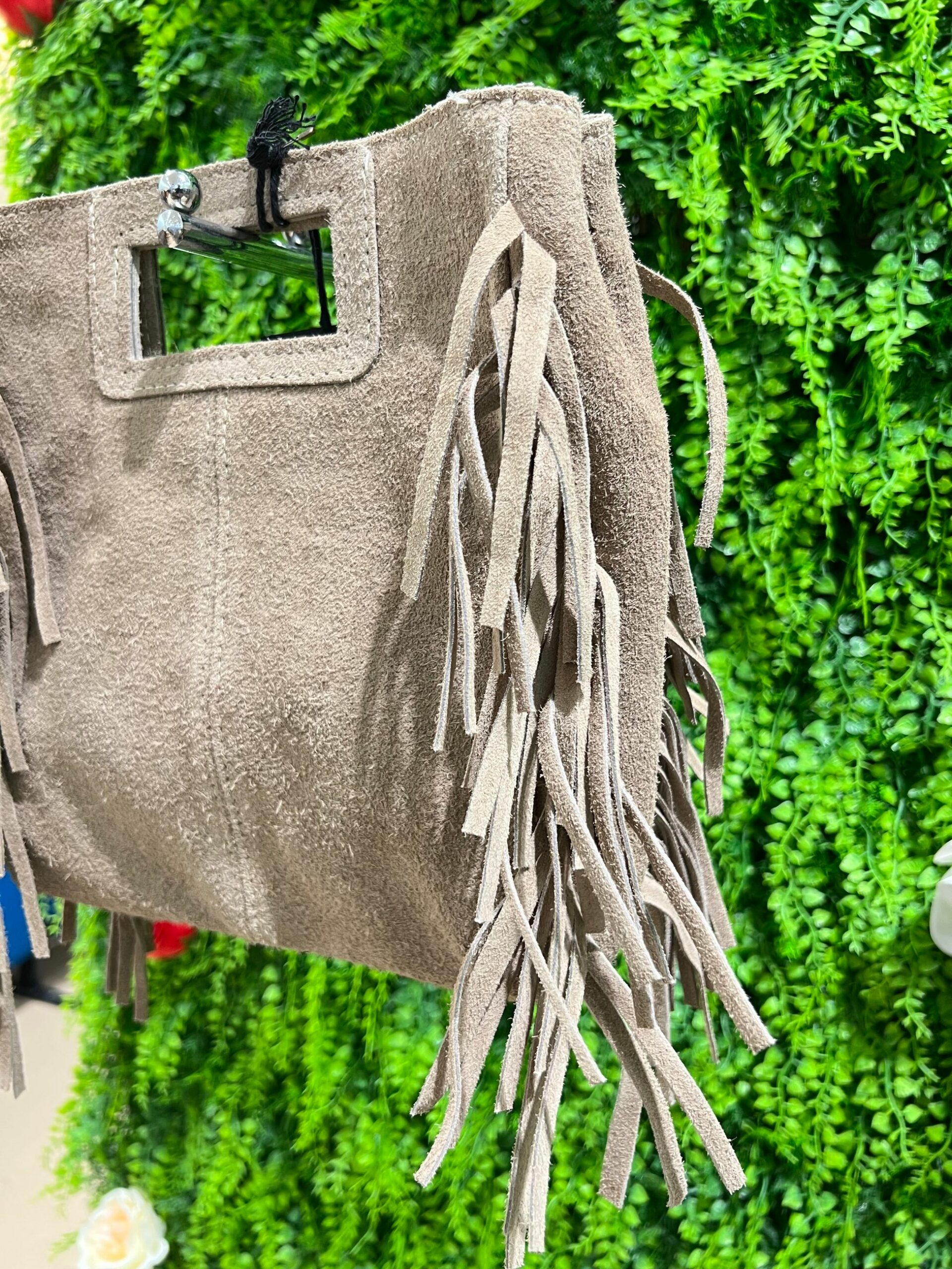 BORSA IN VERA PELLE SCAMOSCIATA CON FRANGE DIMENSIONE 23X23 CM DISPONE ANCHE DI TRACOLLA