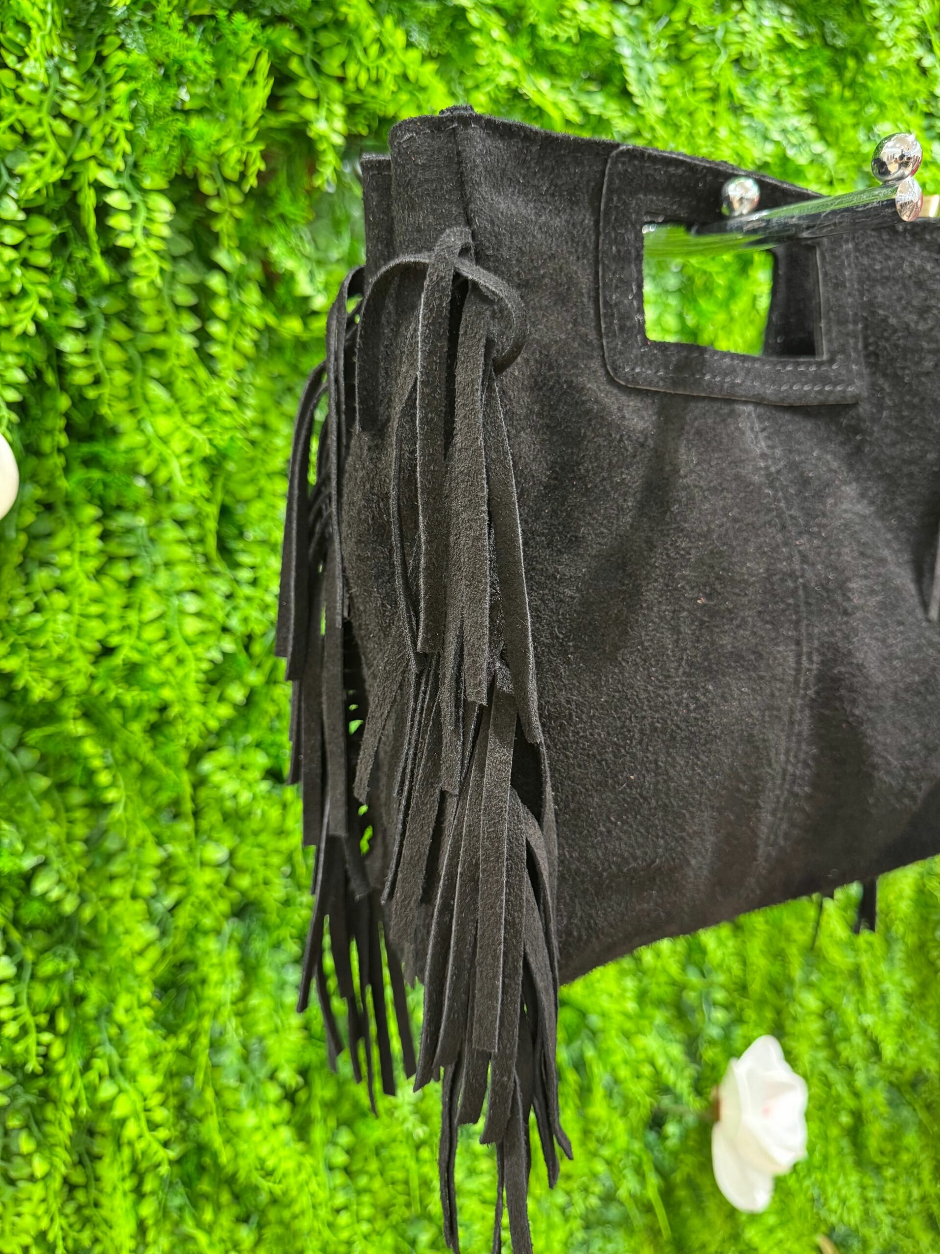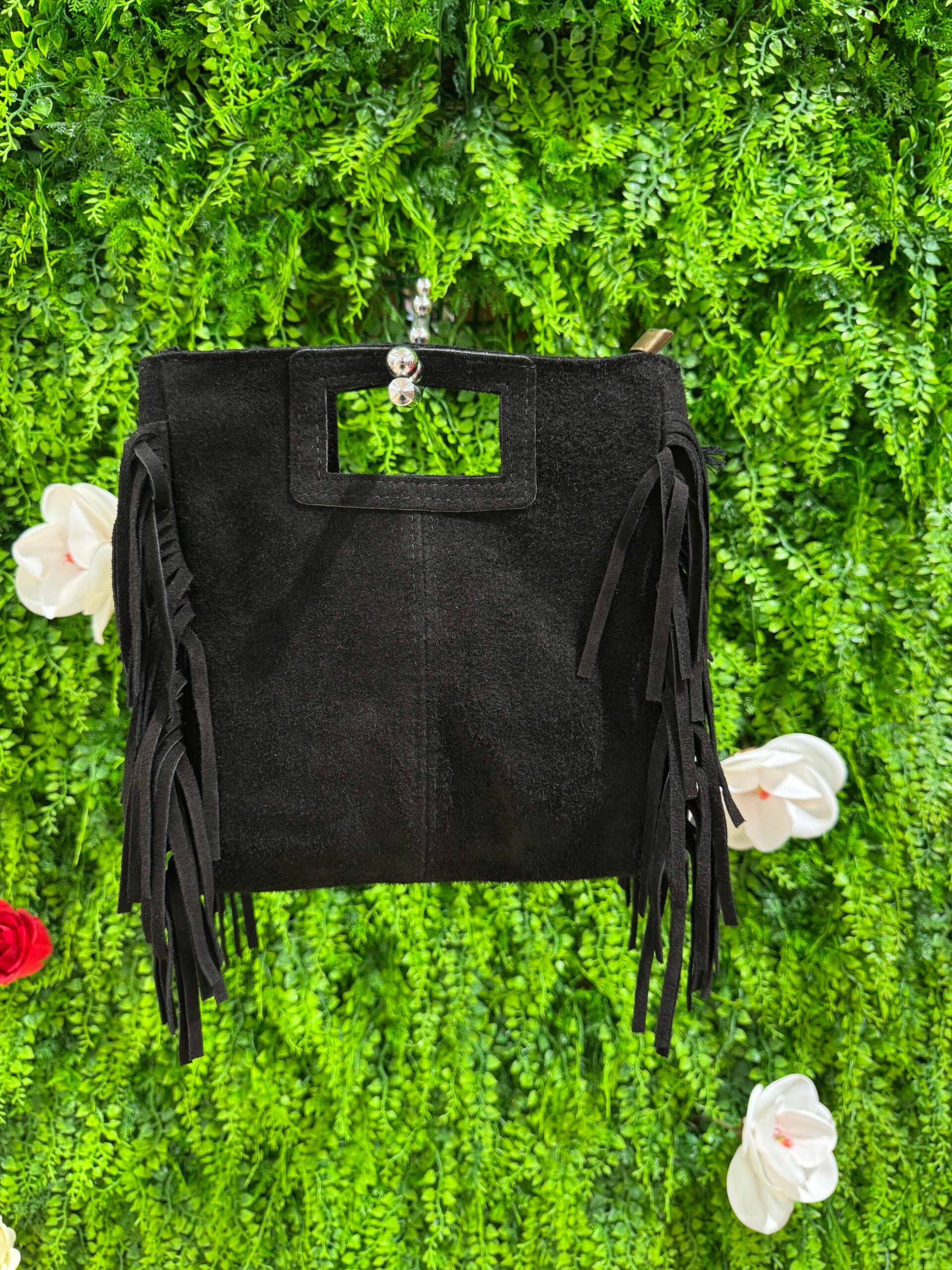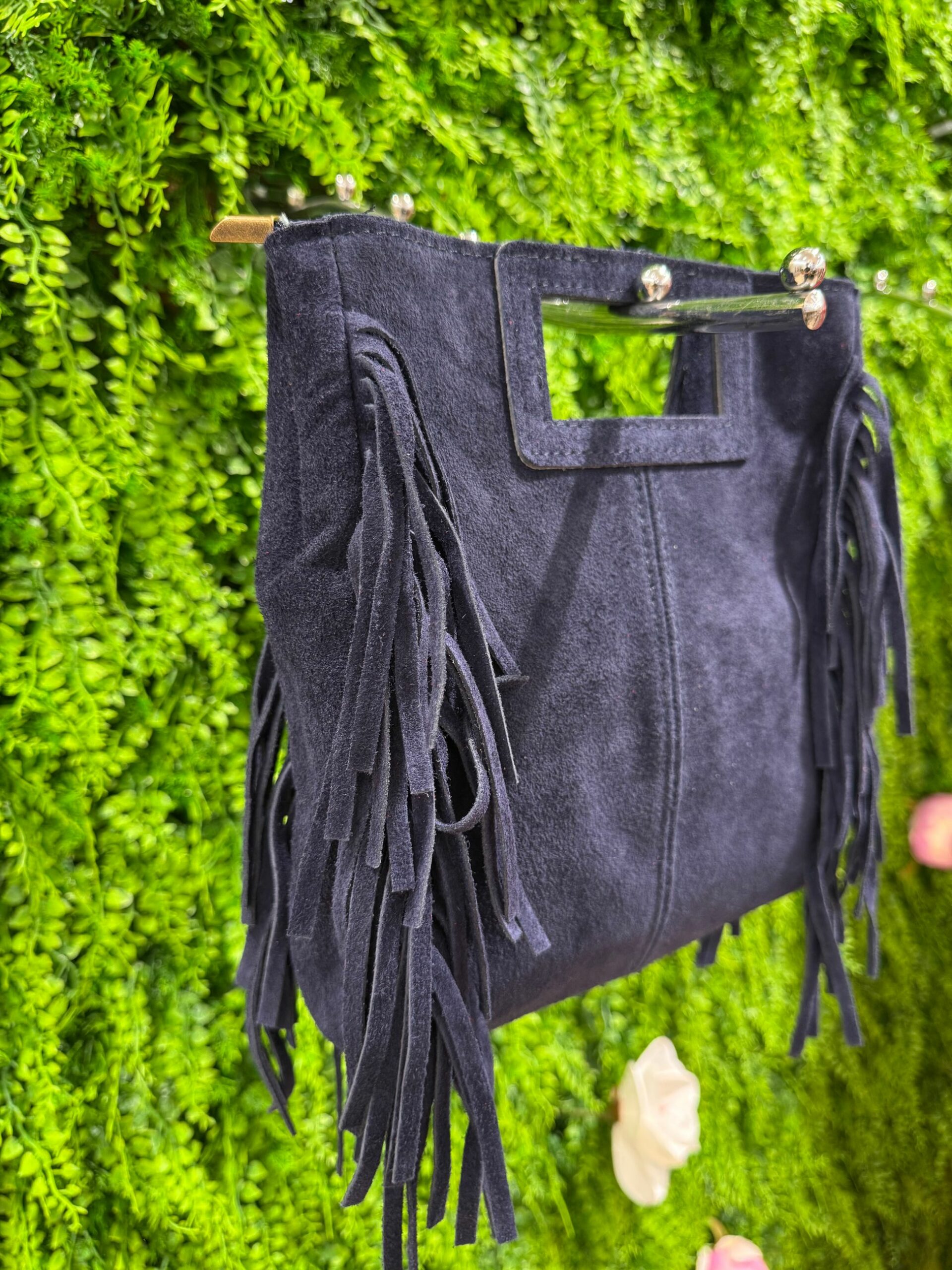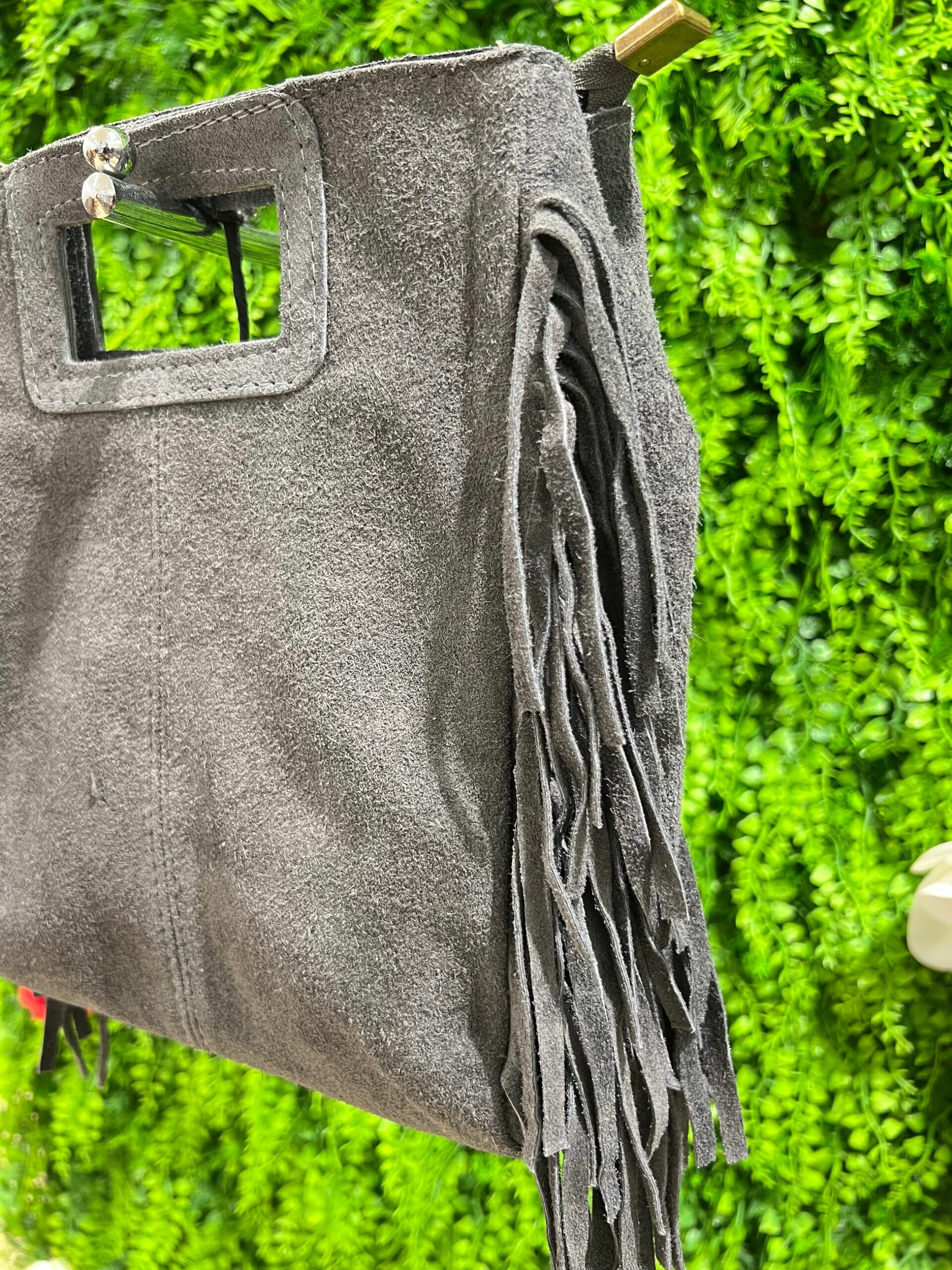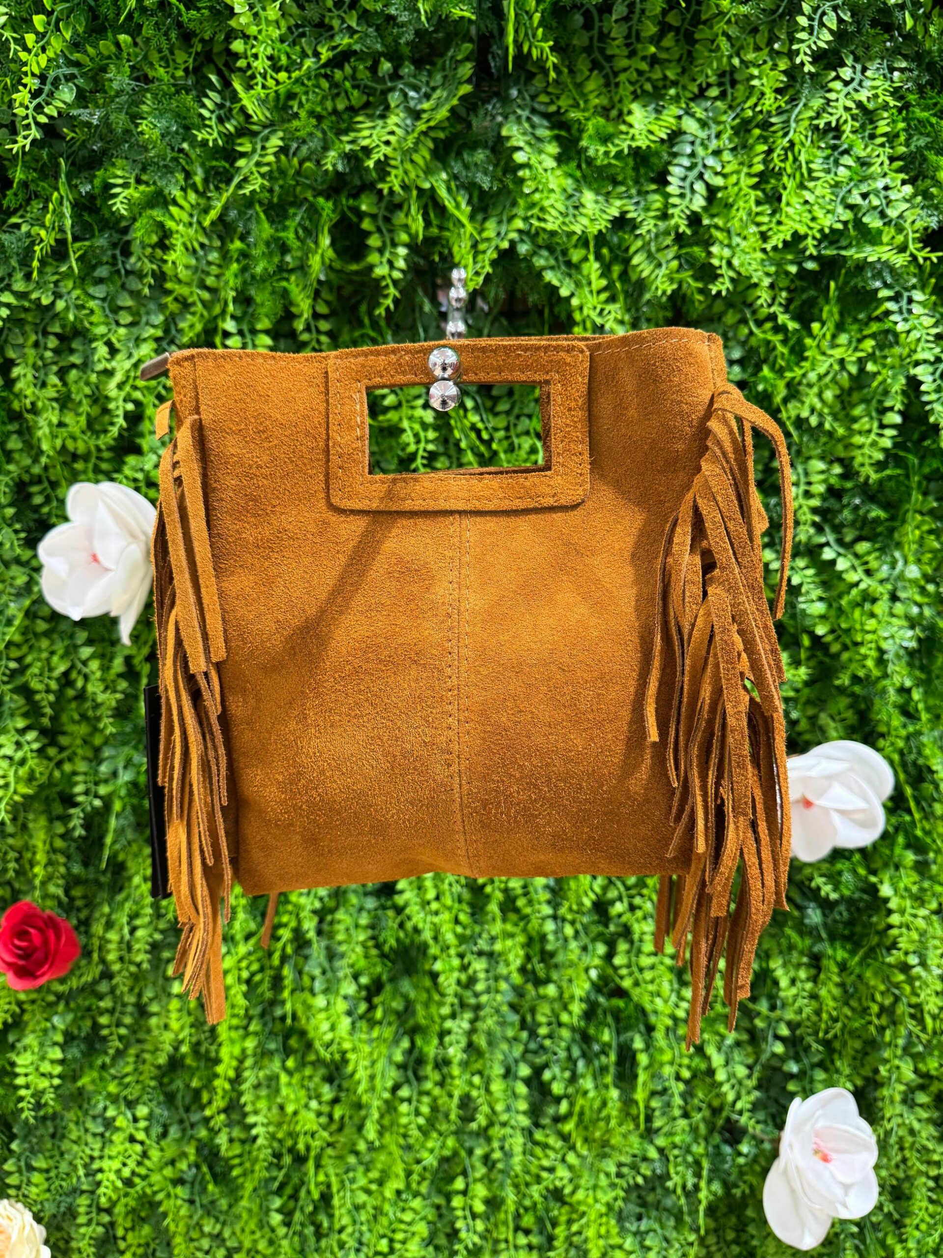 BORSA IN VERA PELLE SCAMOSCIATA CON FRANGE DIMENSIONE 23X23 CM DISPONE ANCHE DI TRACOLLA