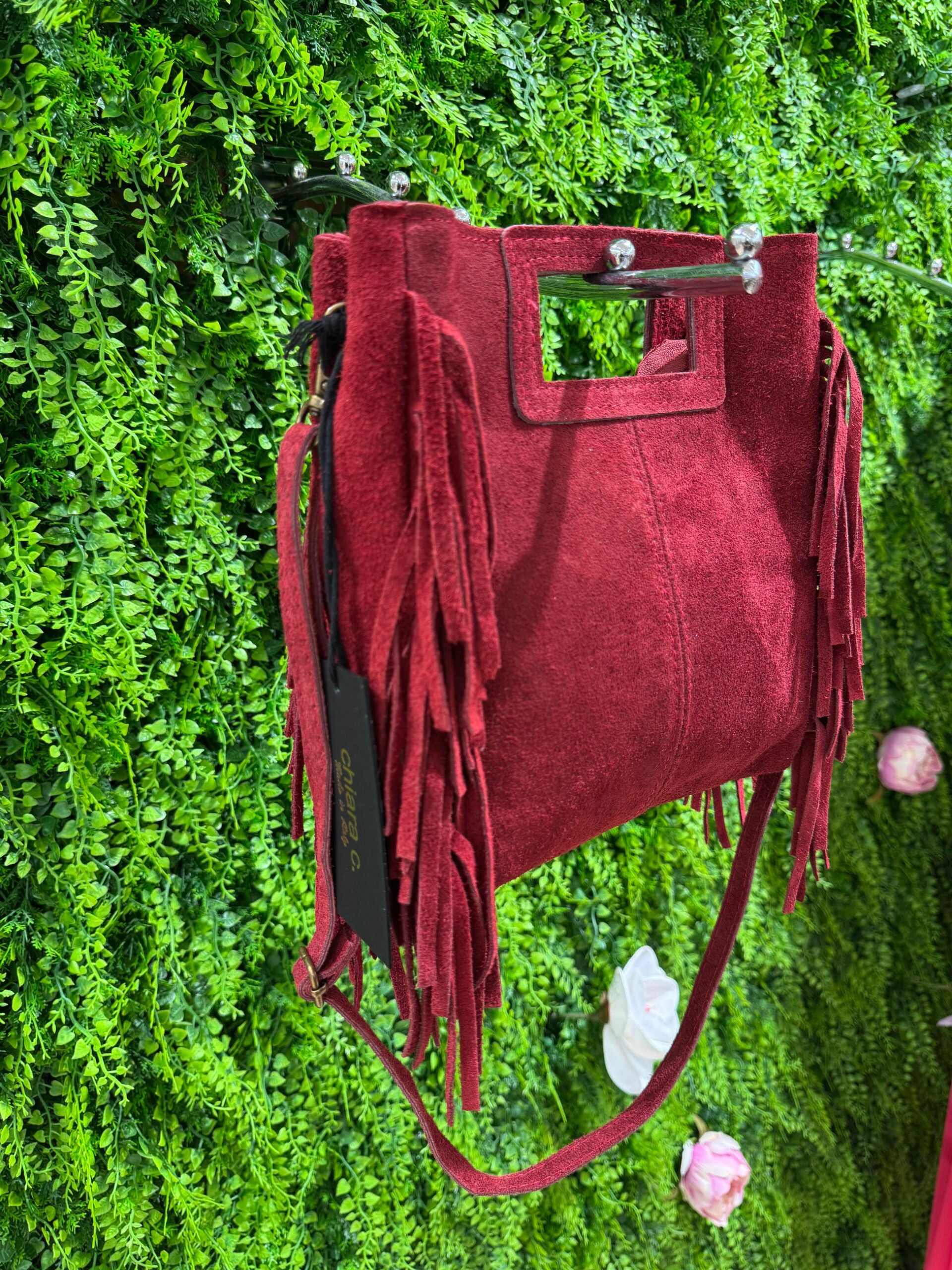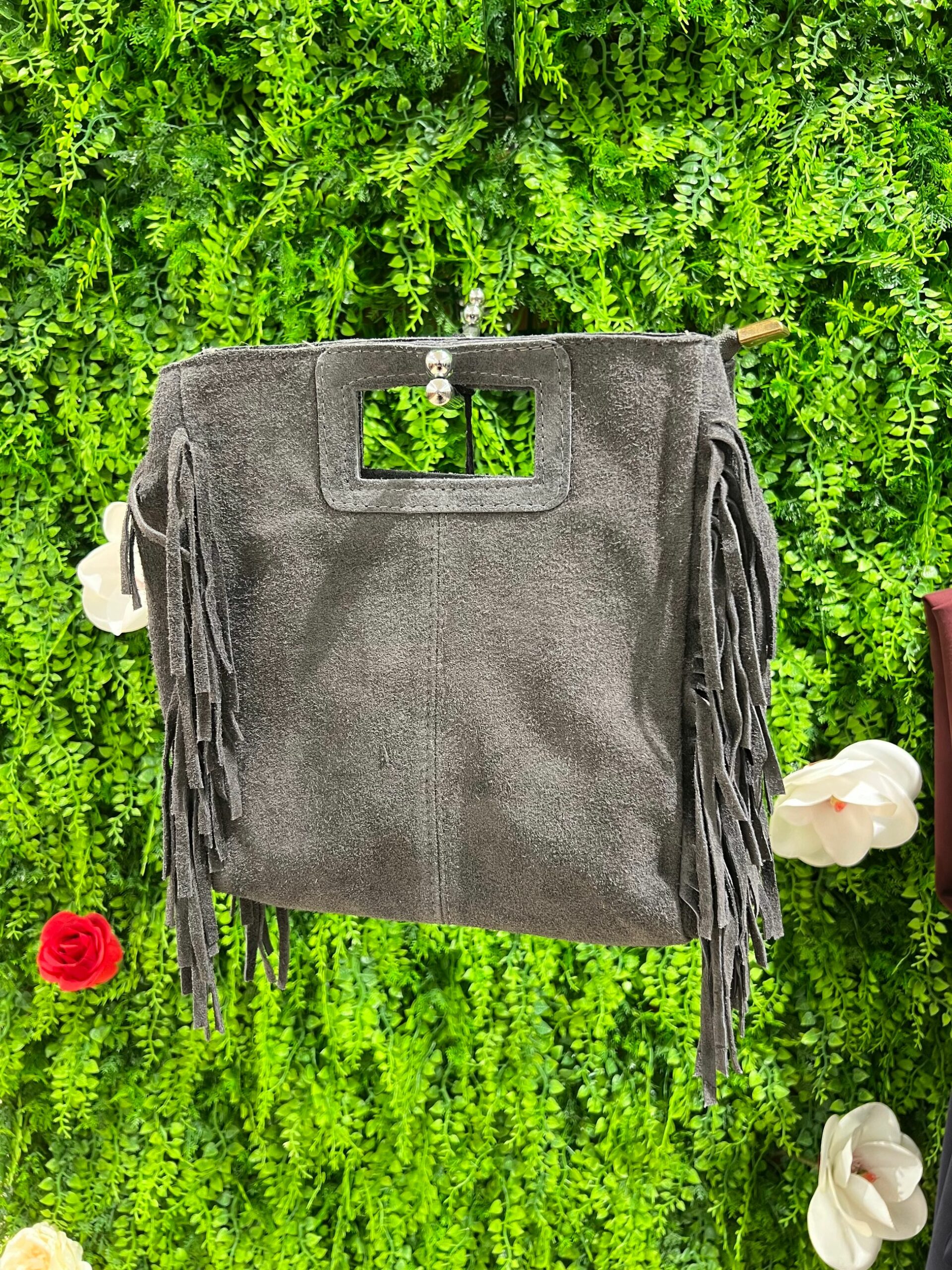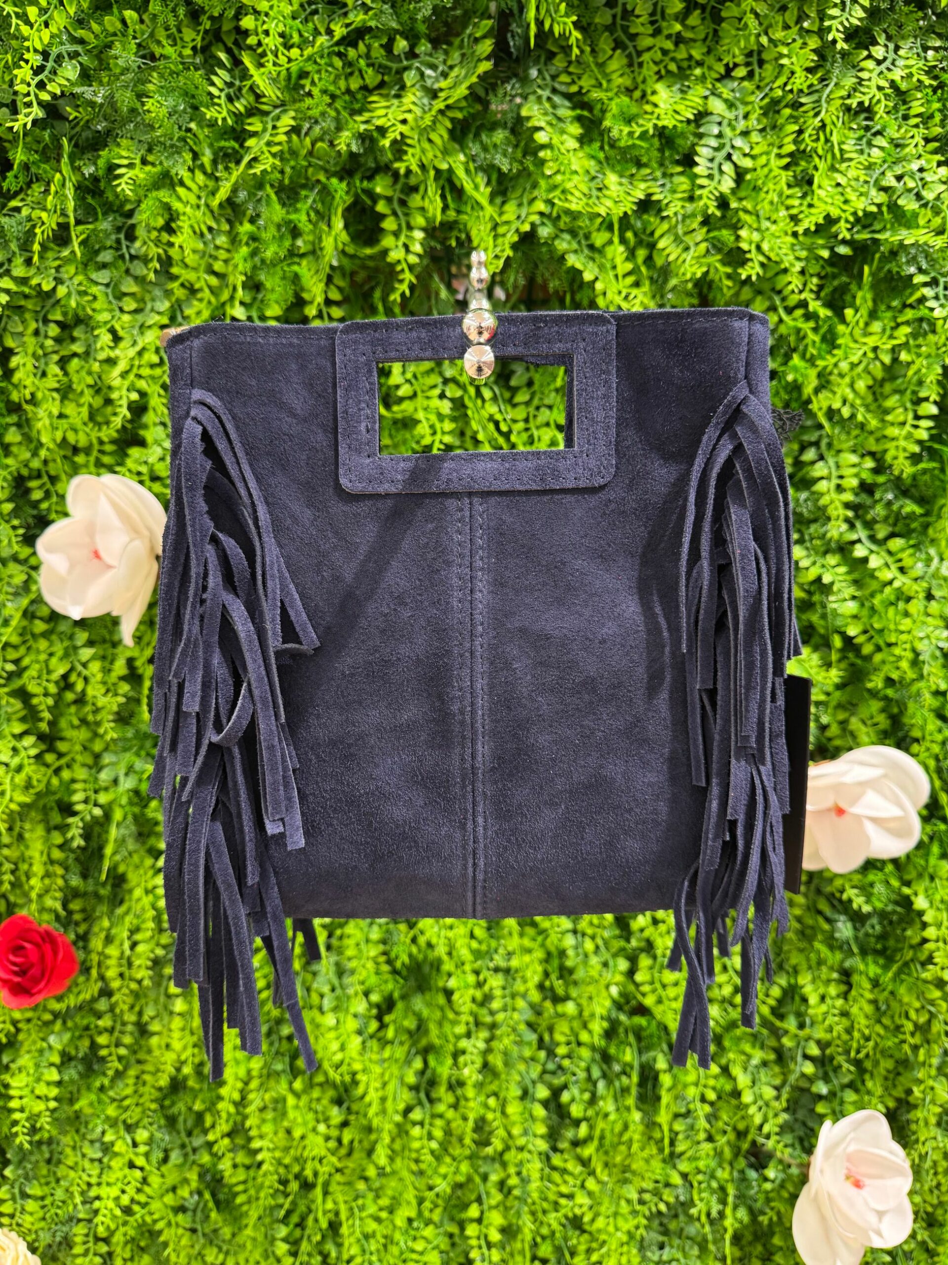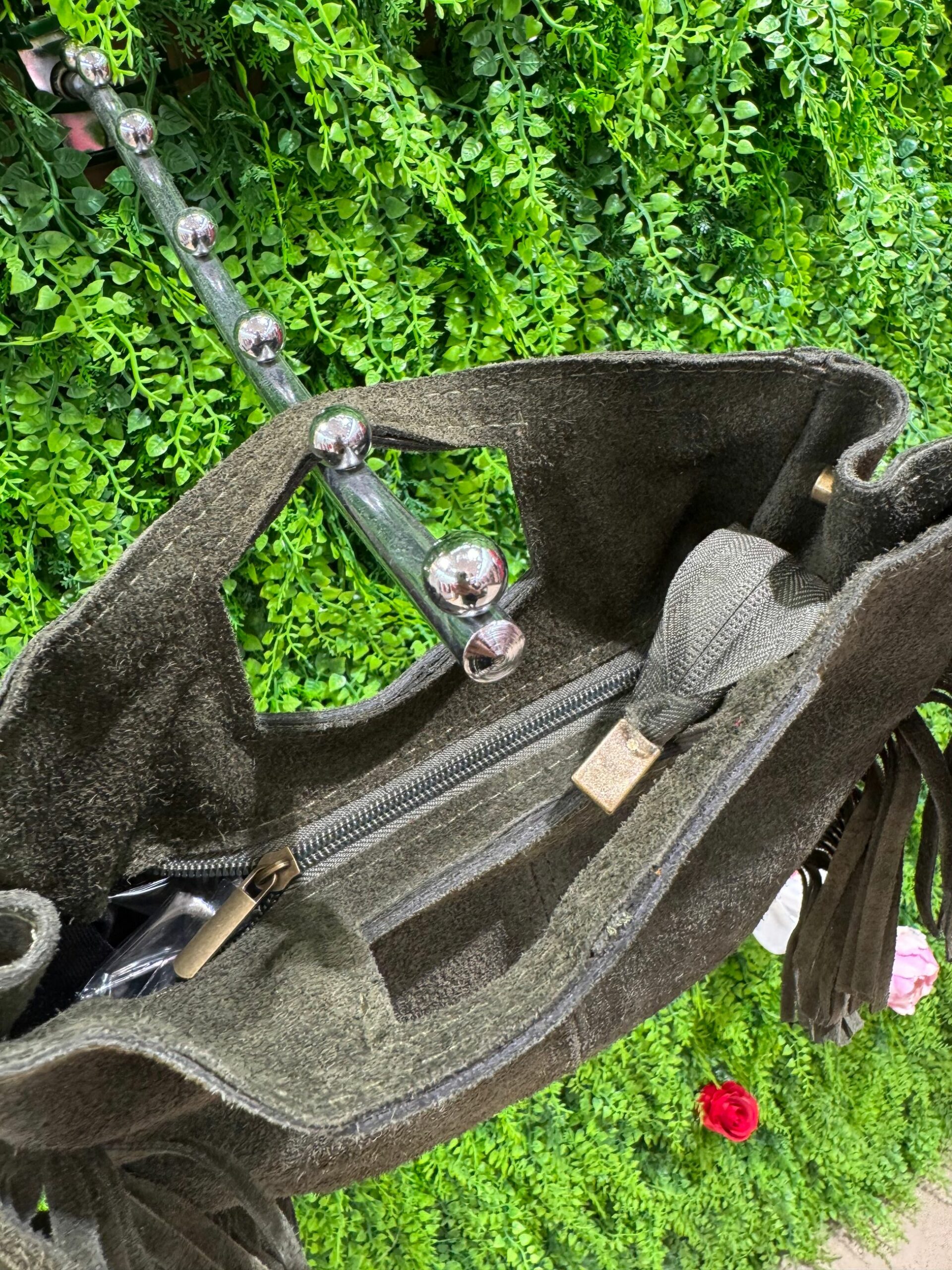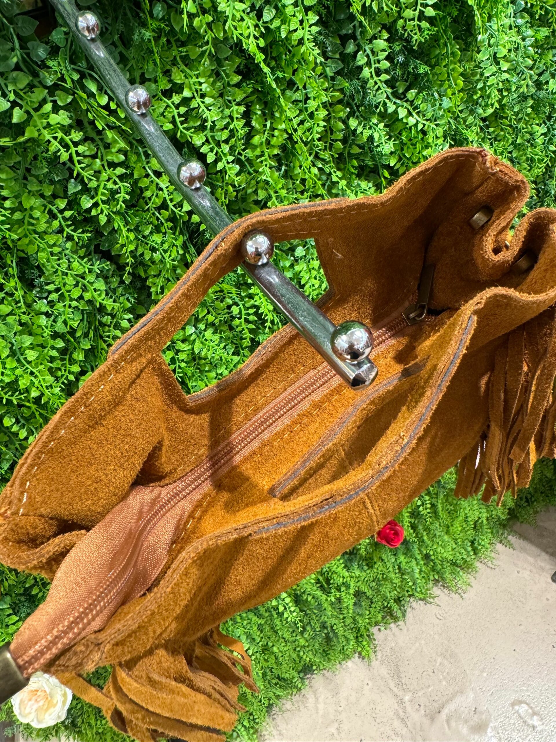 BORSA IN VERA PELLE SCAMOSCIATA CON FRANGE DIMENSIONE 23X23 CM DISPONE ANCHE DI TRACOLLA