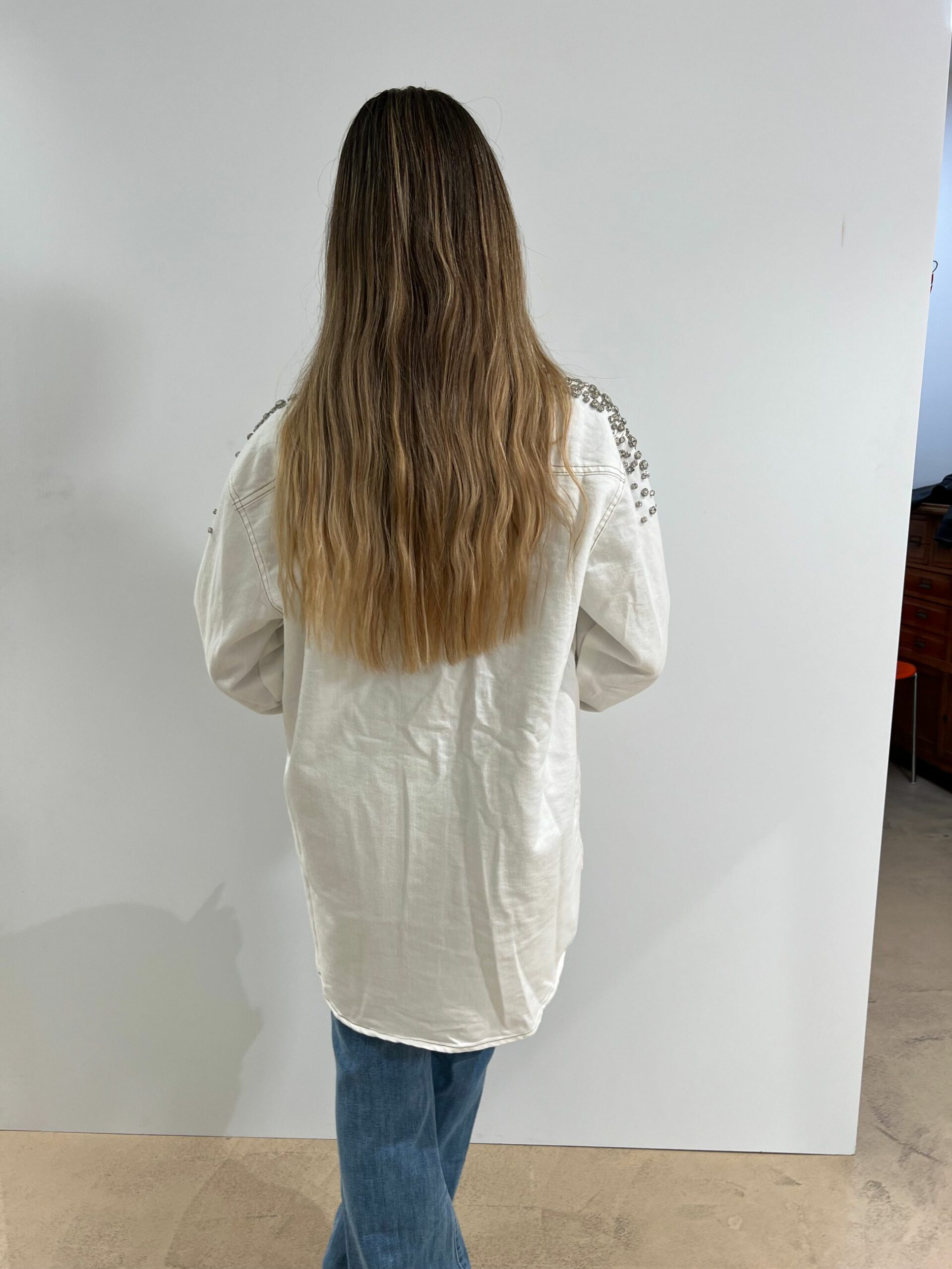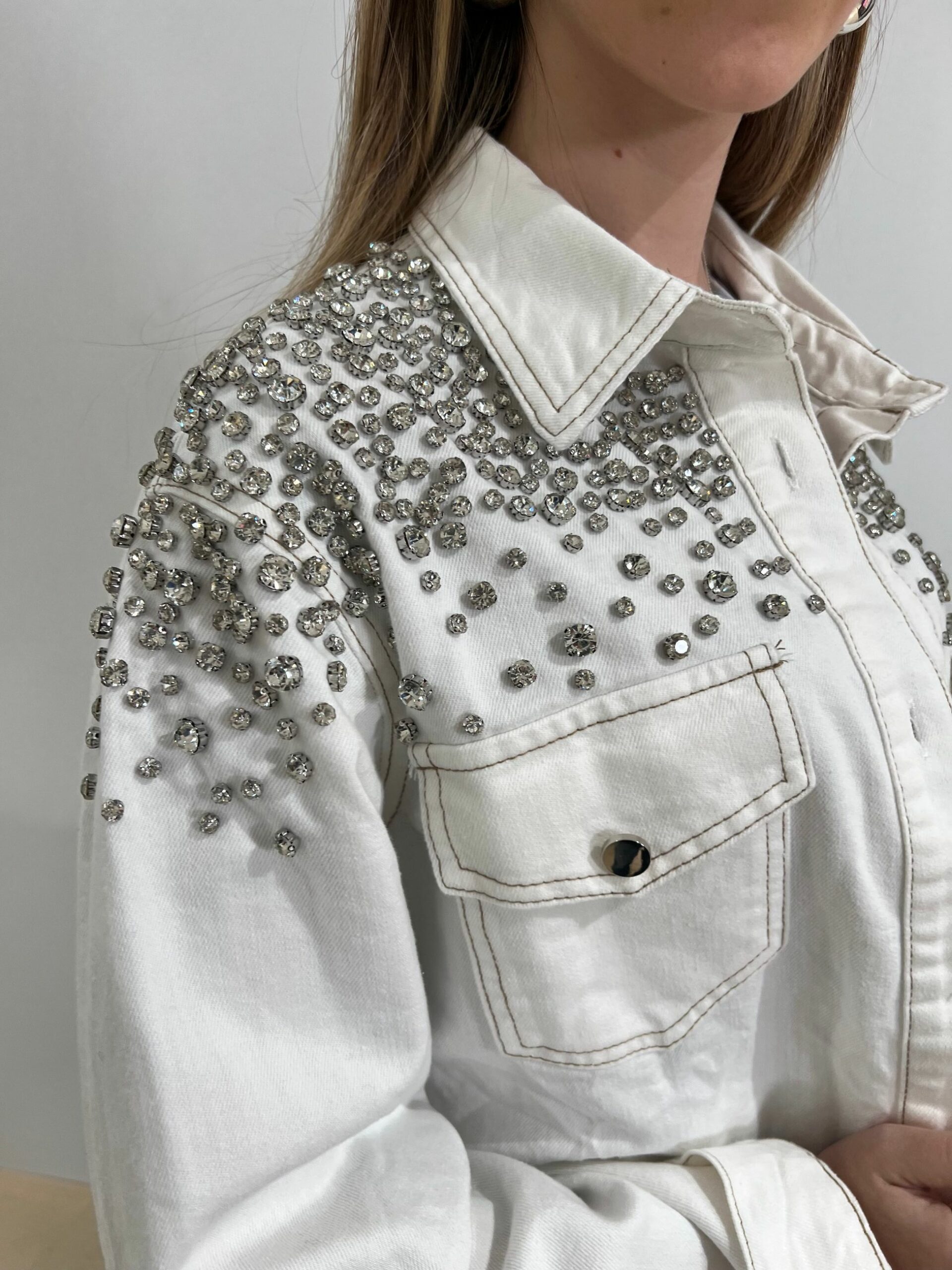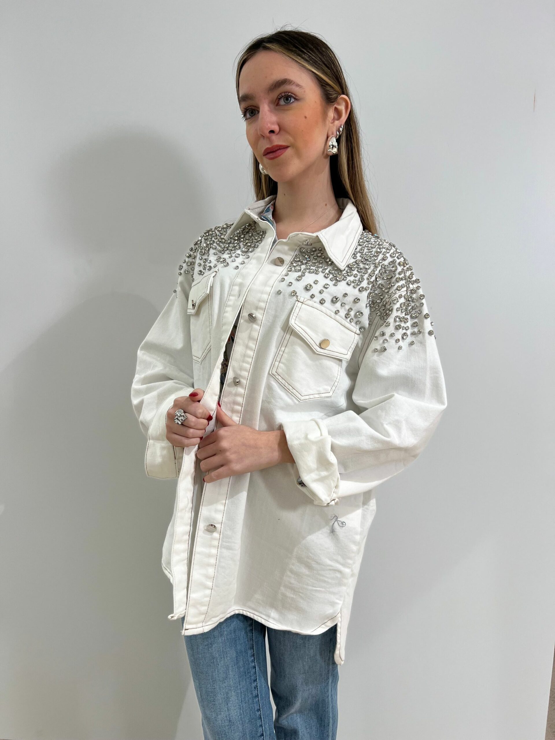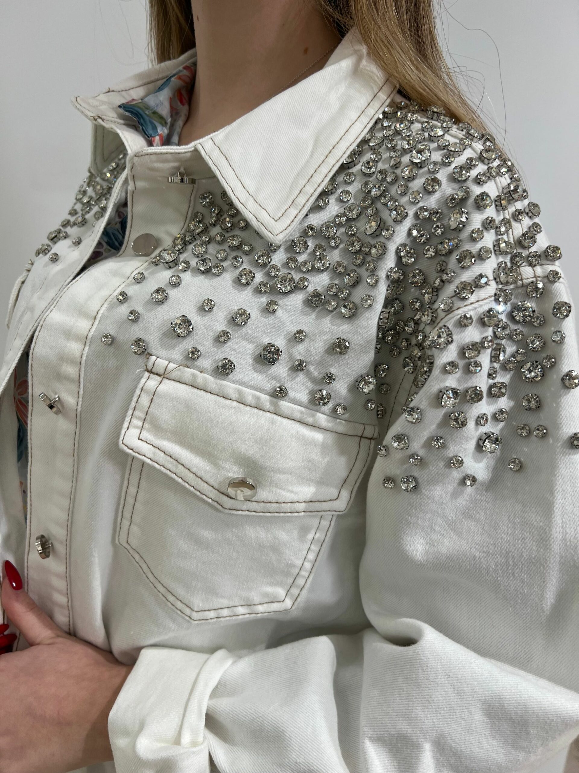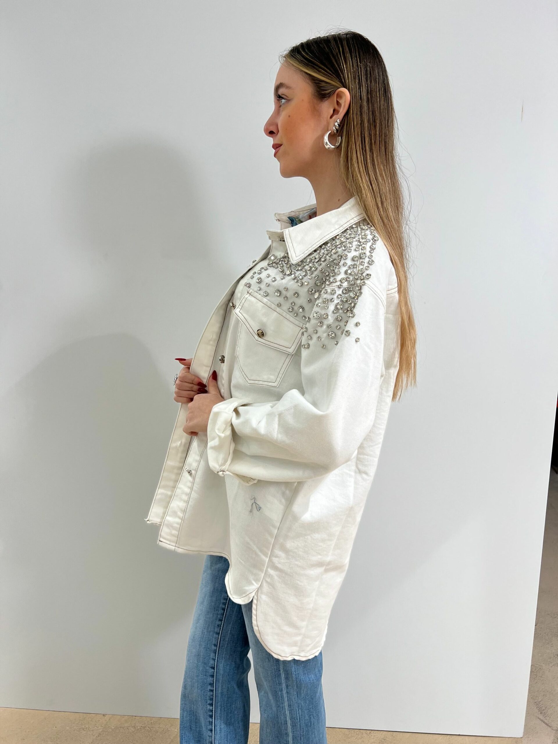 CAMICIA IN COTONE TIPO JEANS BIANCO CON APPLICAZIONE DI STRASS SULLE SPALLE