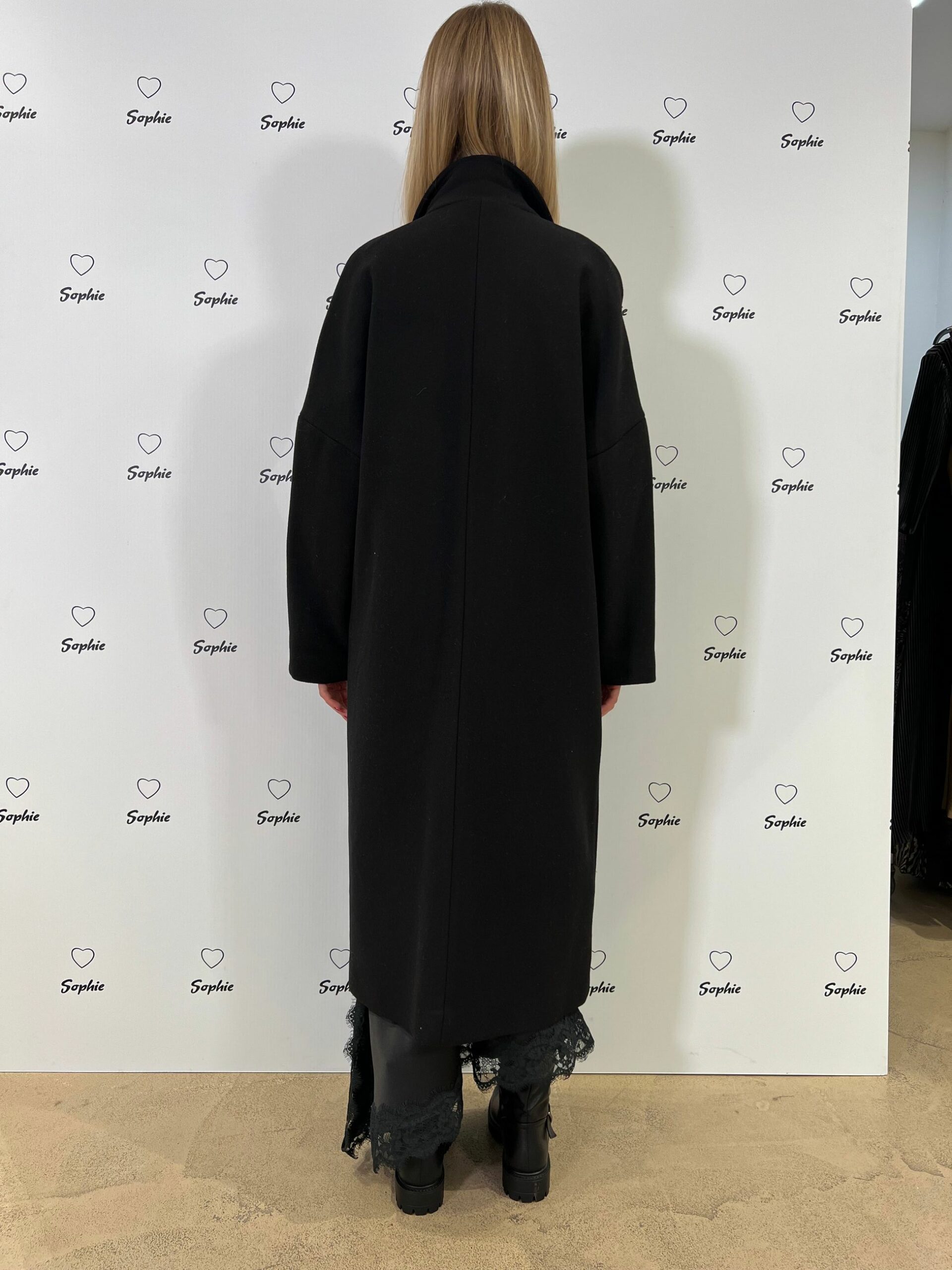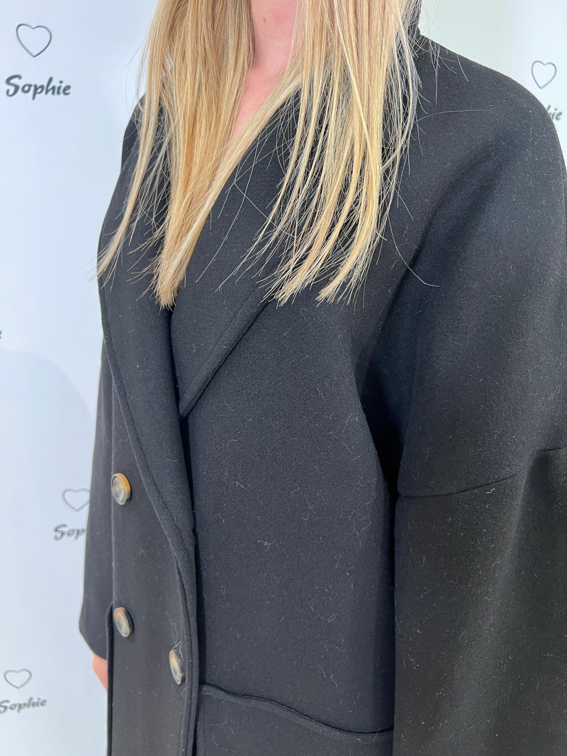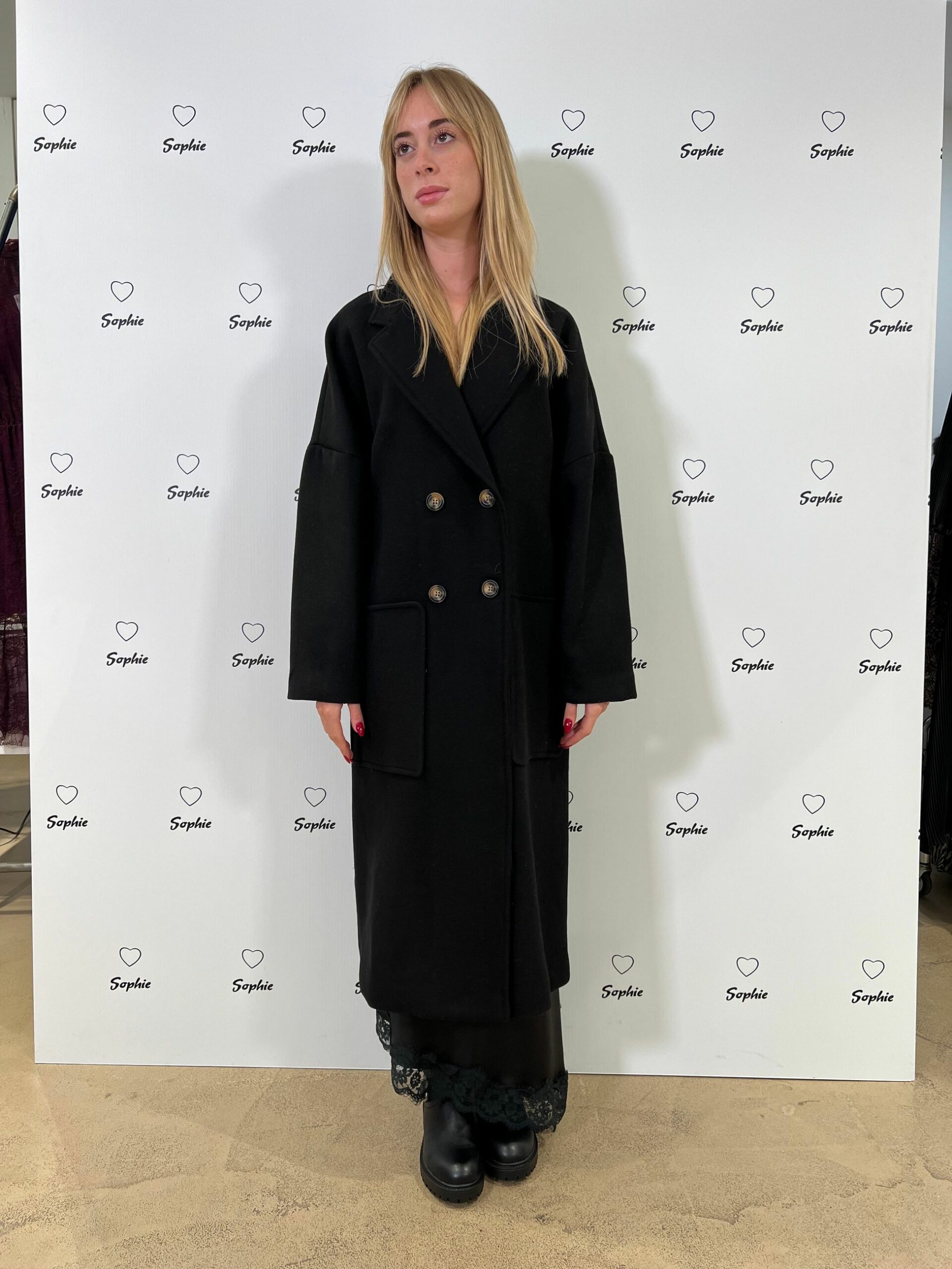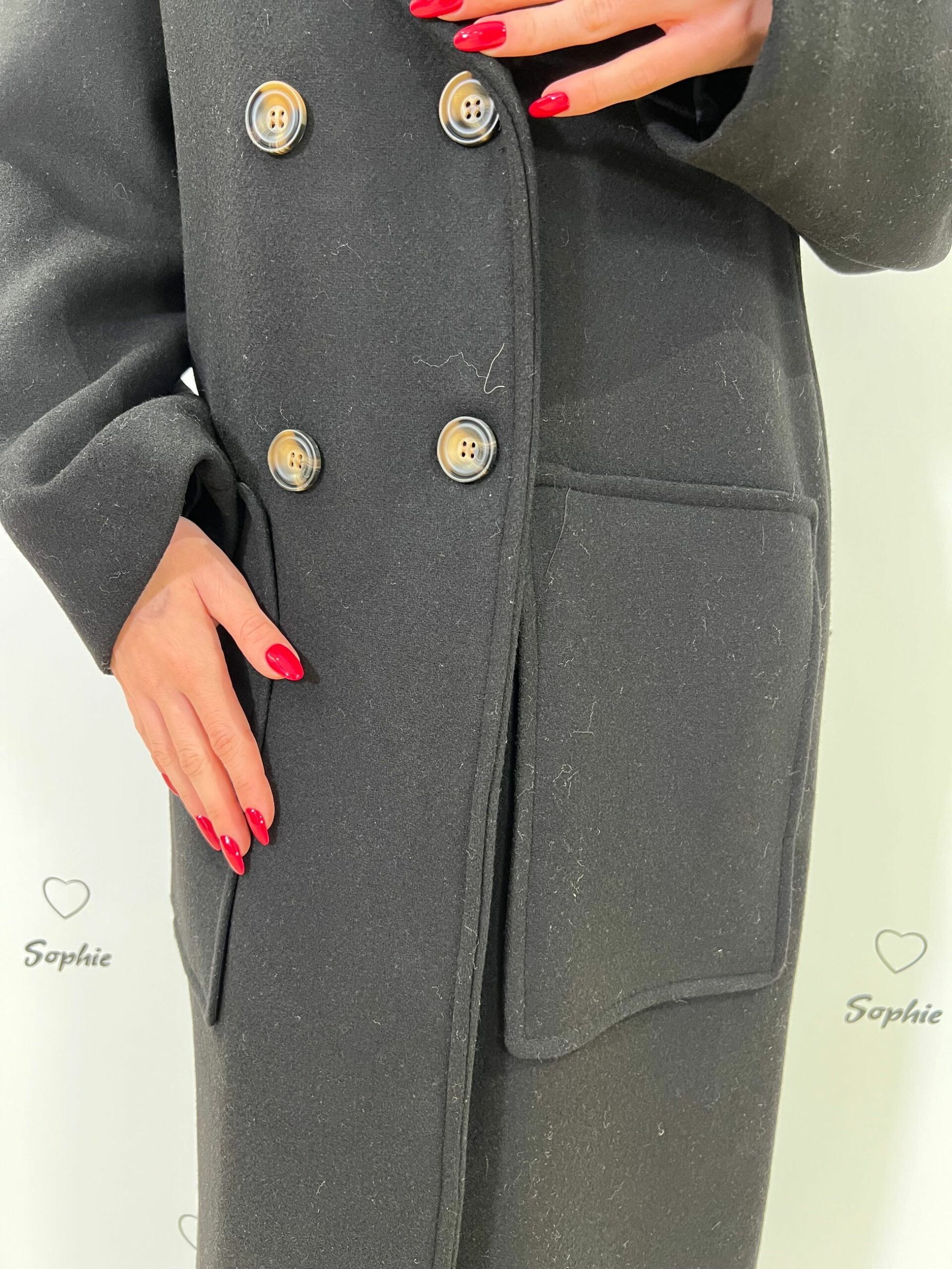 CAPPOTTO FODERATO CON COLLO A REVER, TAGLIO A SPALLA SCESA, CHIUSO A DOPPIO PETTO, TASCHE FRONTALI APPLICATE