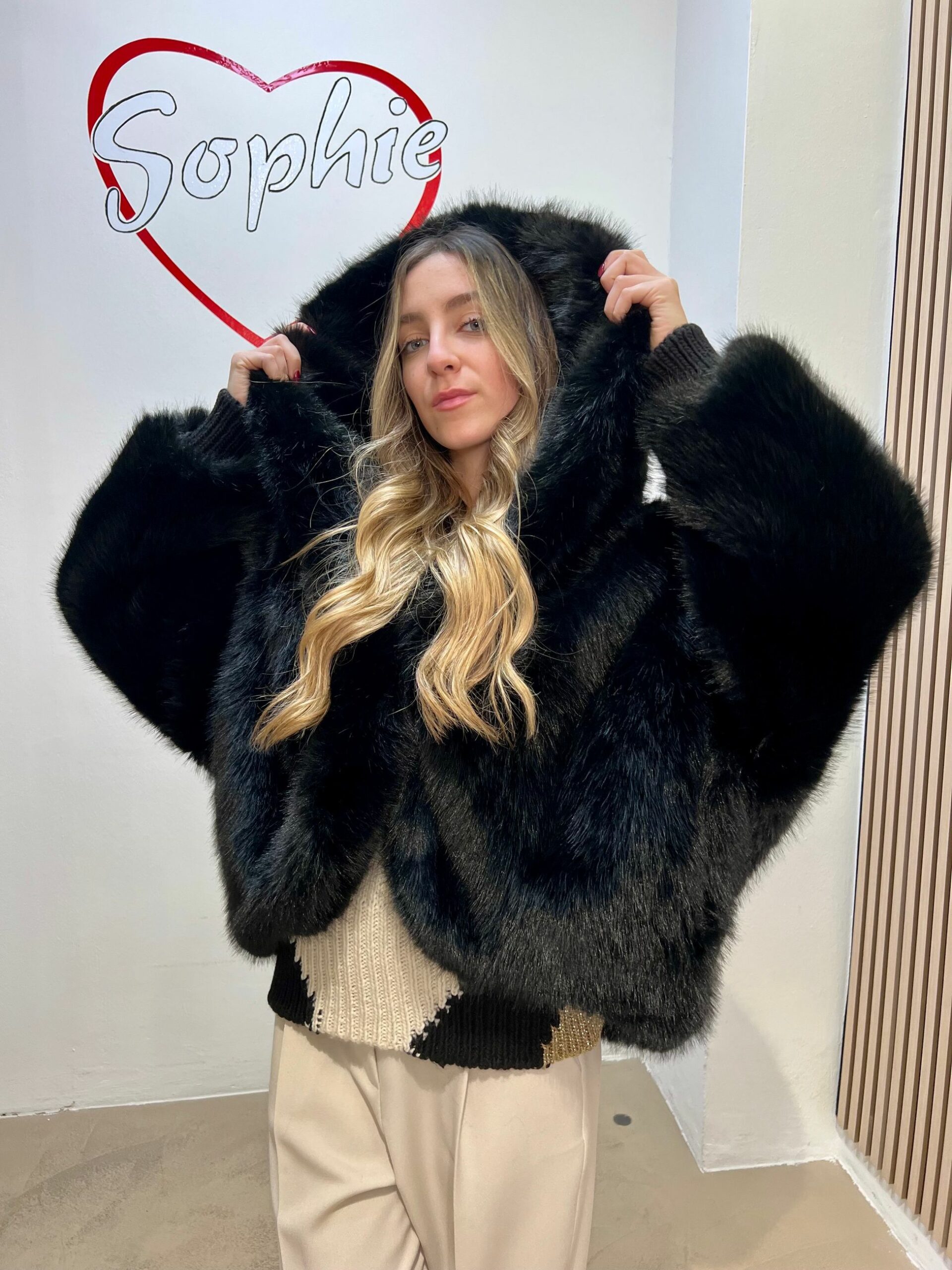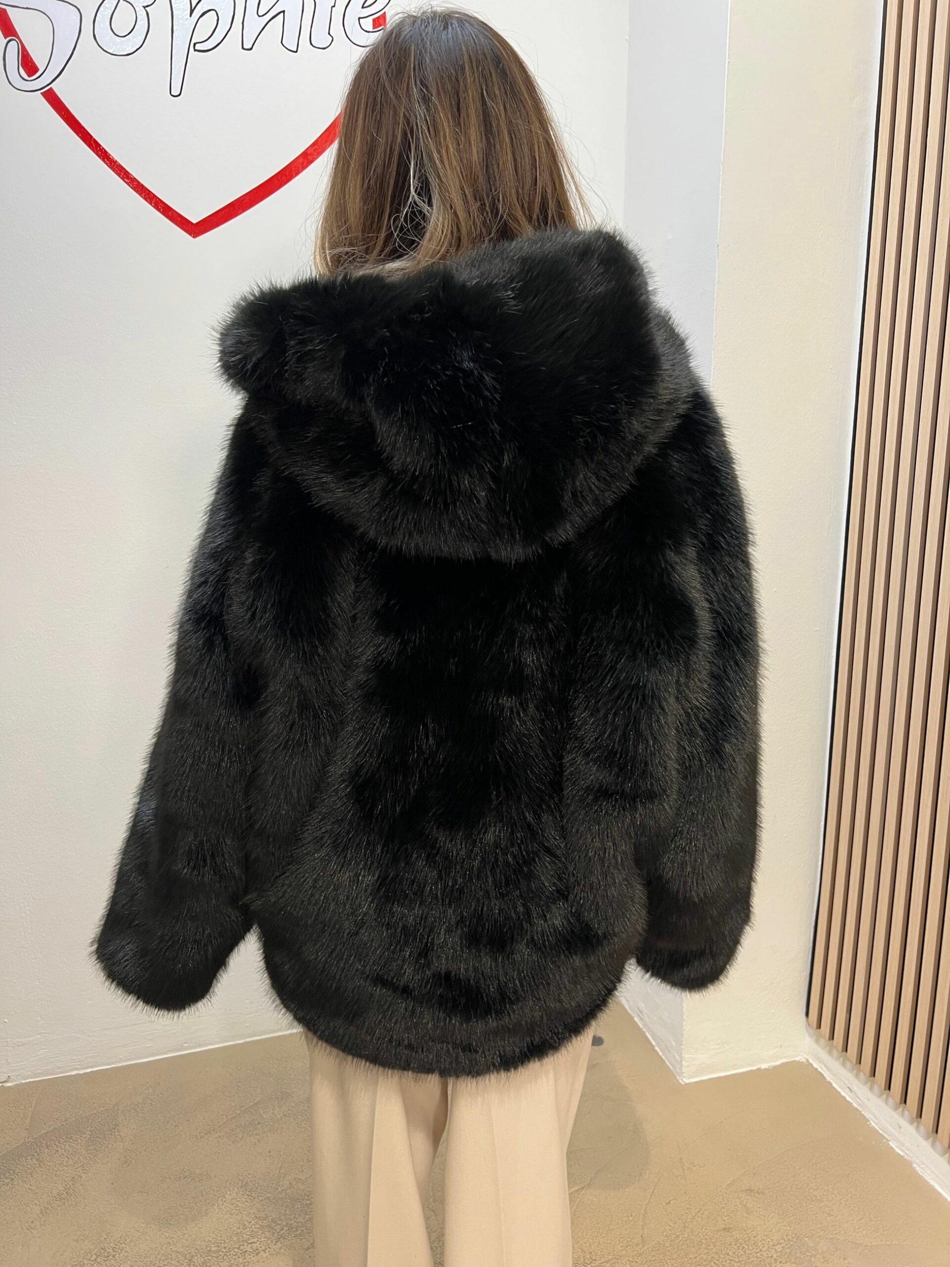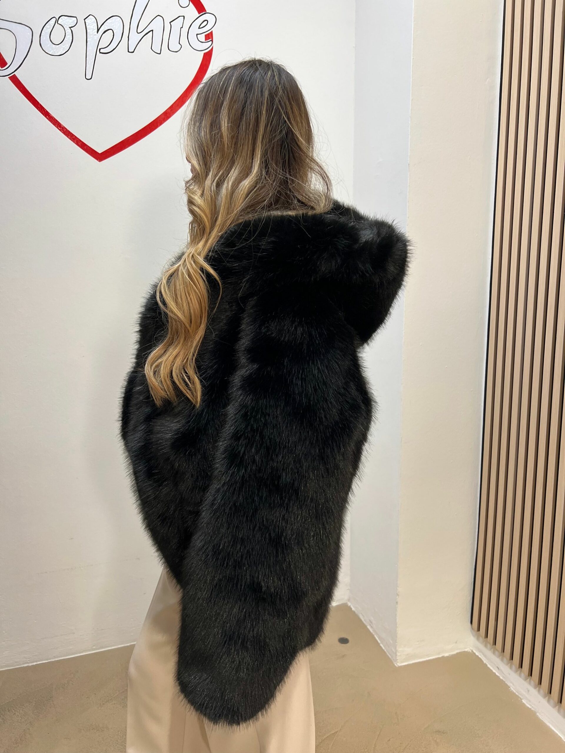 ECOPELLICCIA CON CAPPUCCIO STONDATA E CORTA SUL DAVANTI PIù LUNGA DIETRO