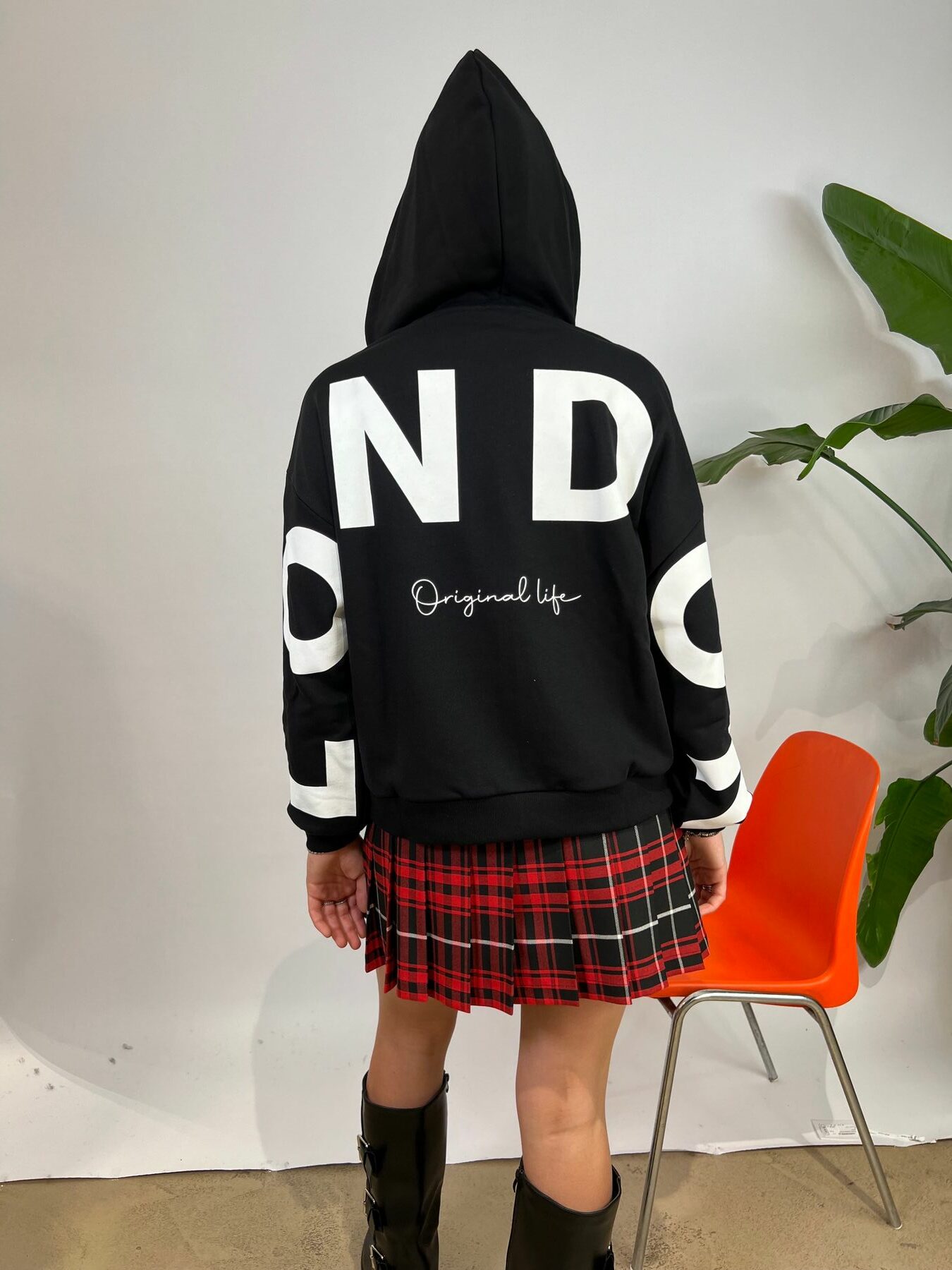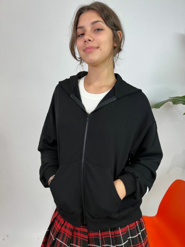 GIUBBINO FELPA CON CAPPUCCIO E ZIP, TASCHE SUL DAVENTI , POLSINI E FONDO IN MAGLINA,SCRITTA BIANCA SULLE MANICHE E DIETRO, VESTIBILITA OVER