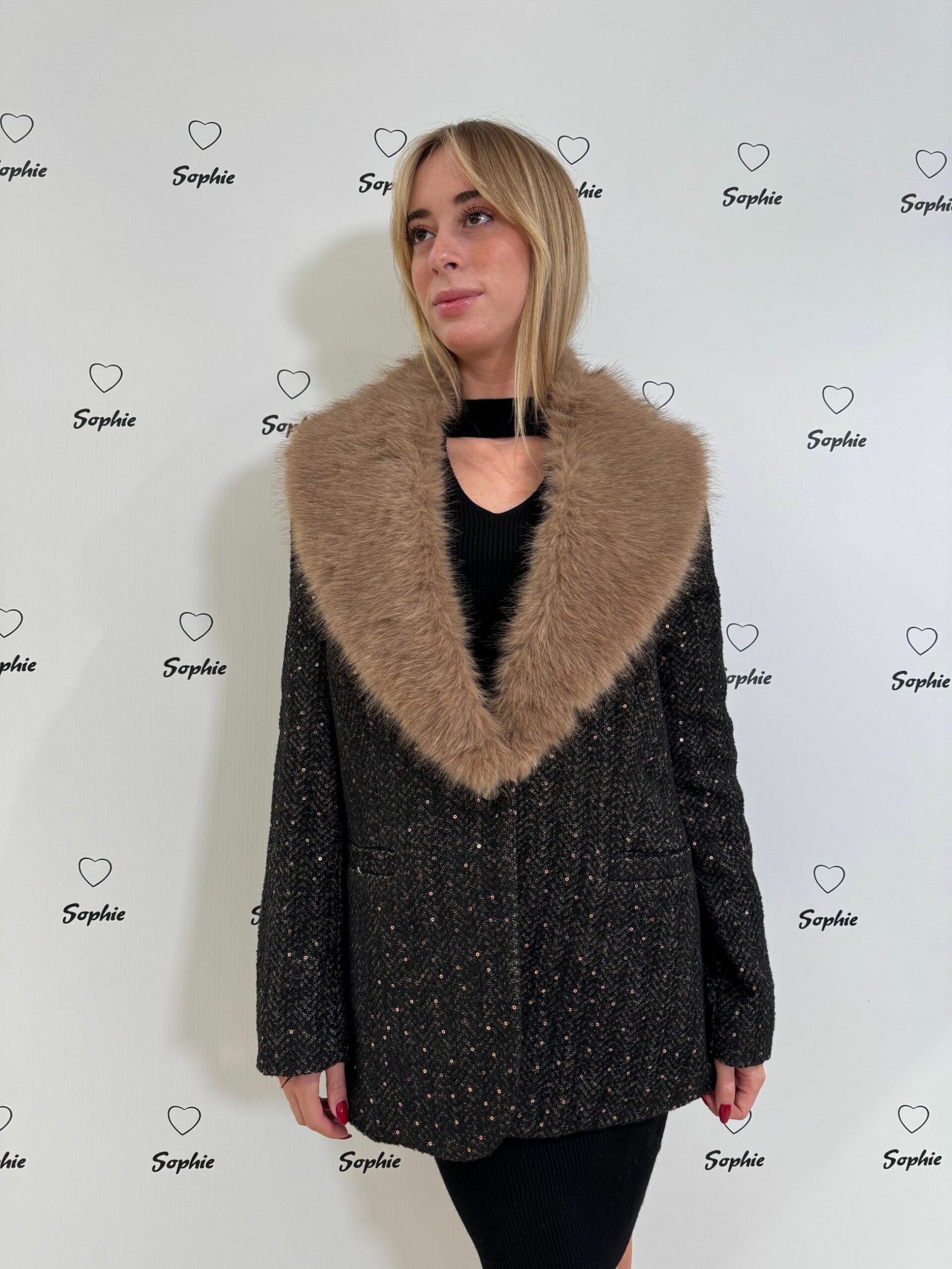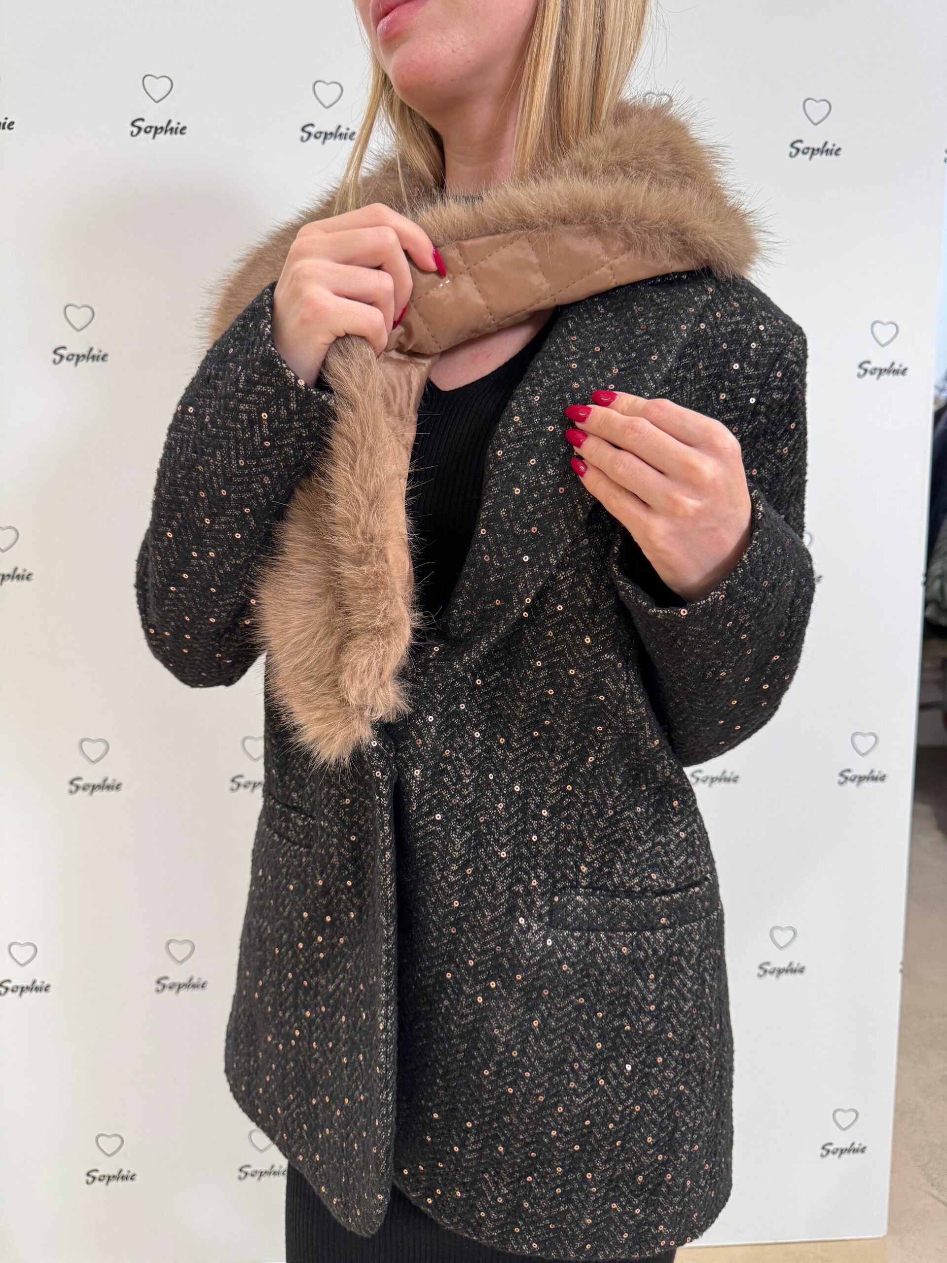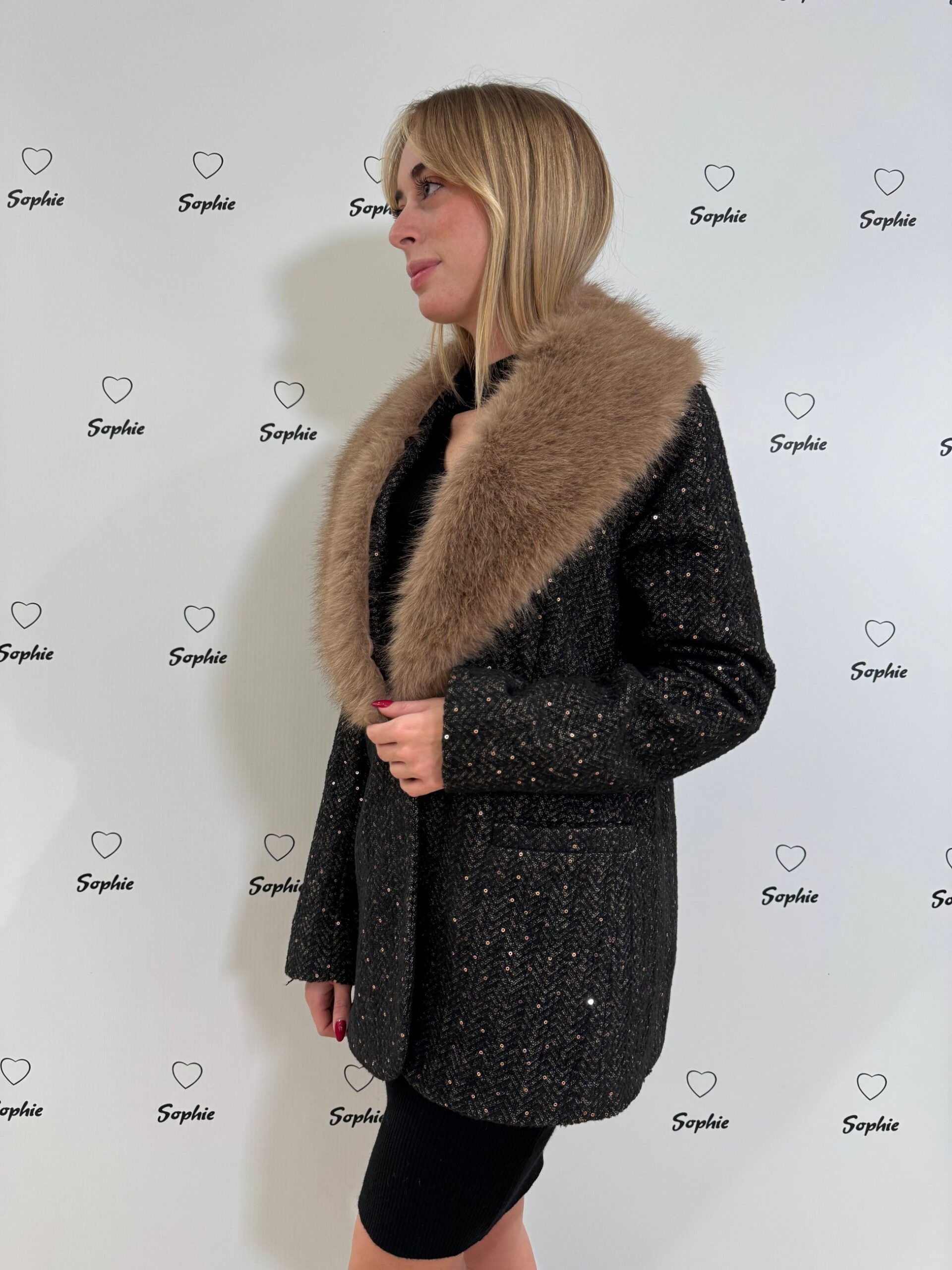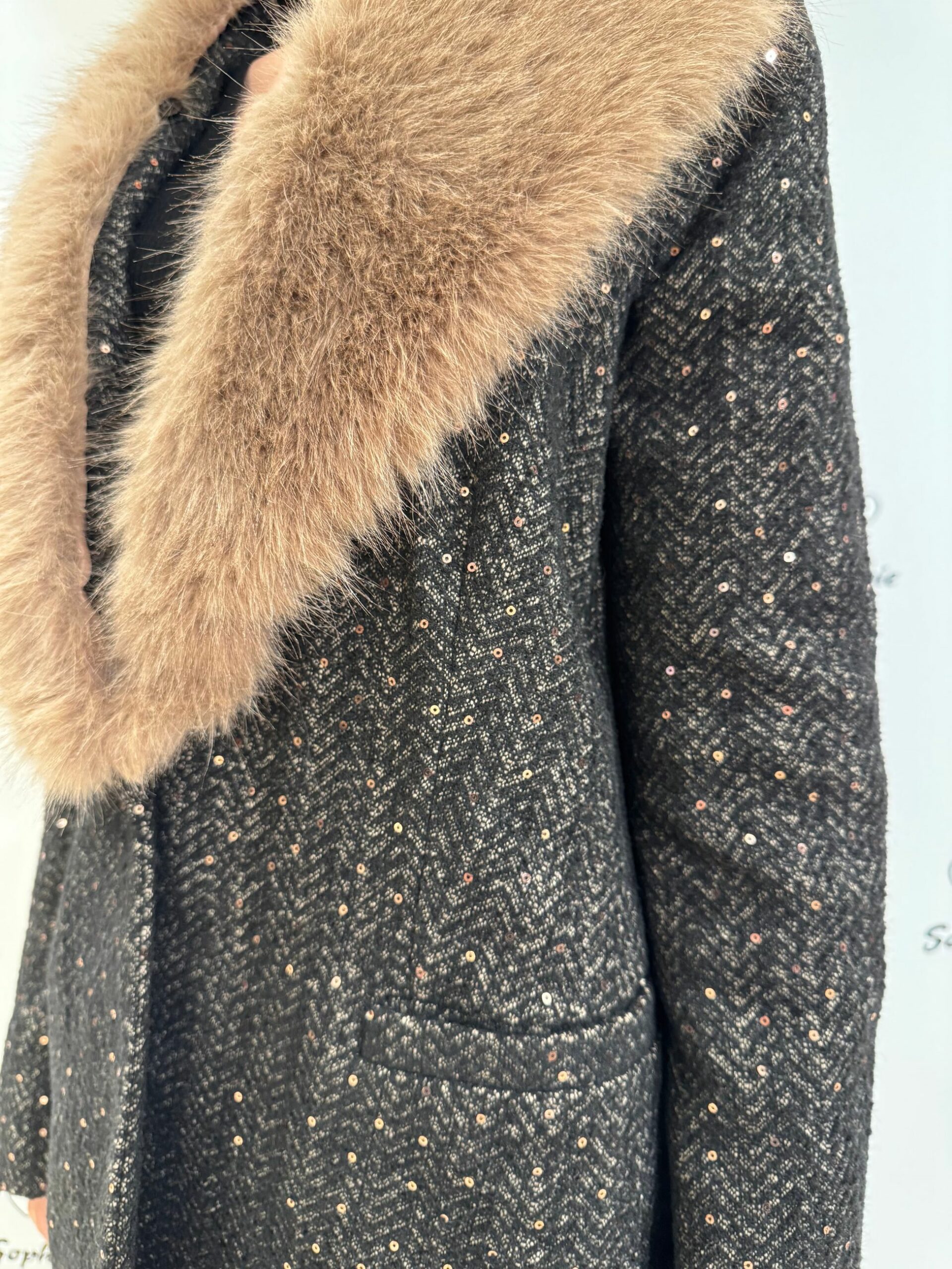 GIACCA CON COLLO IN ECOPELLICCIA ASPORTABILE. TESSUTO SPINATO CON PICCOLE PAILETTES