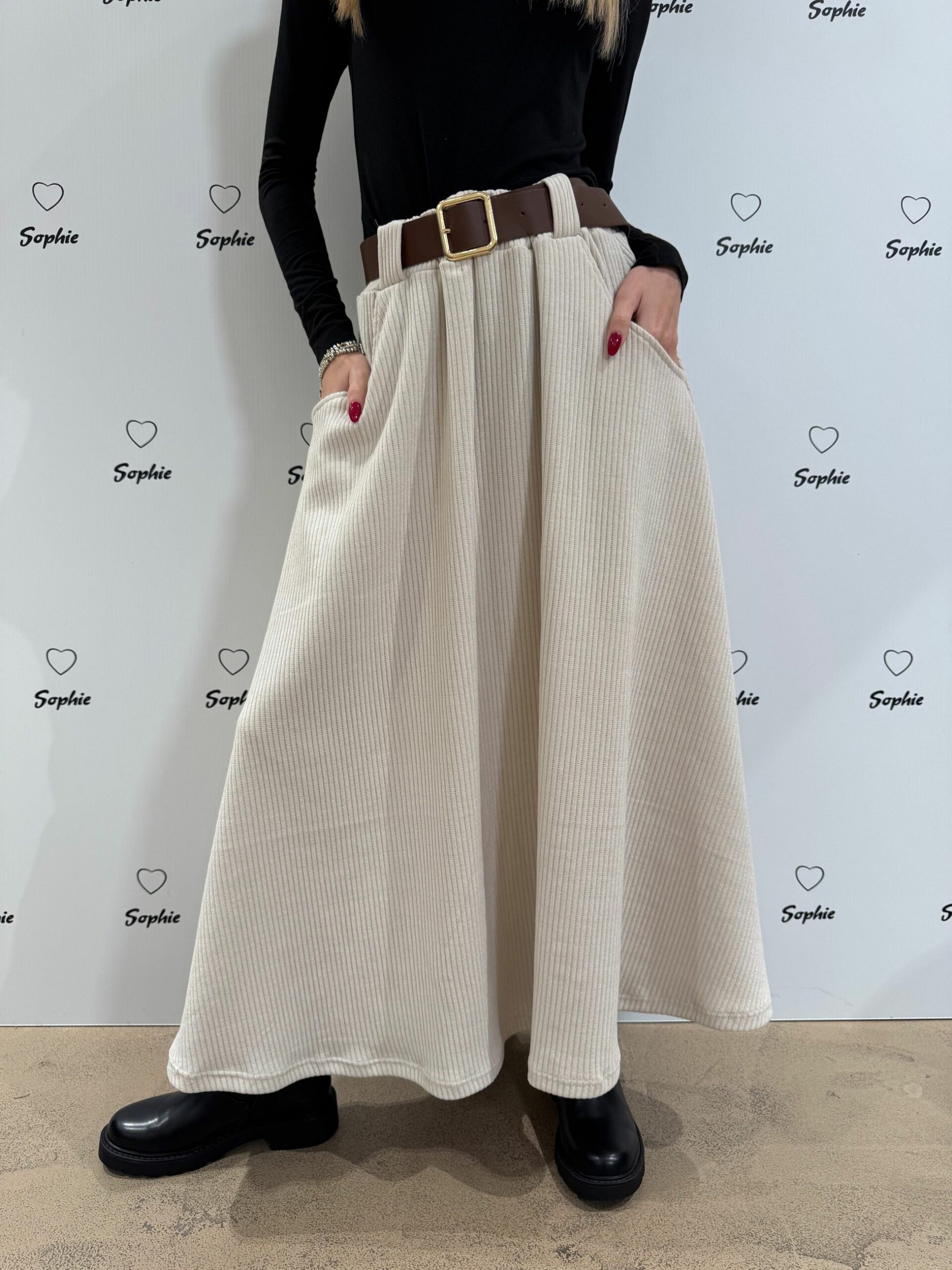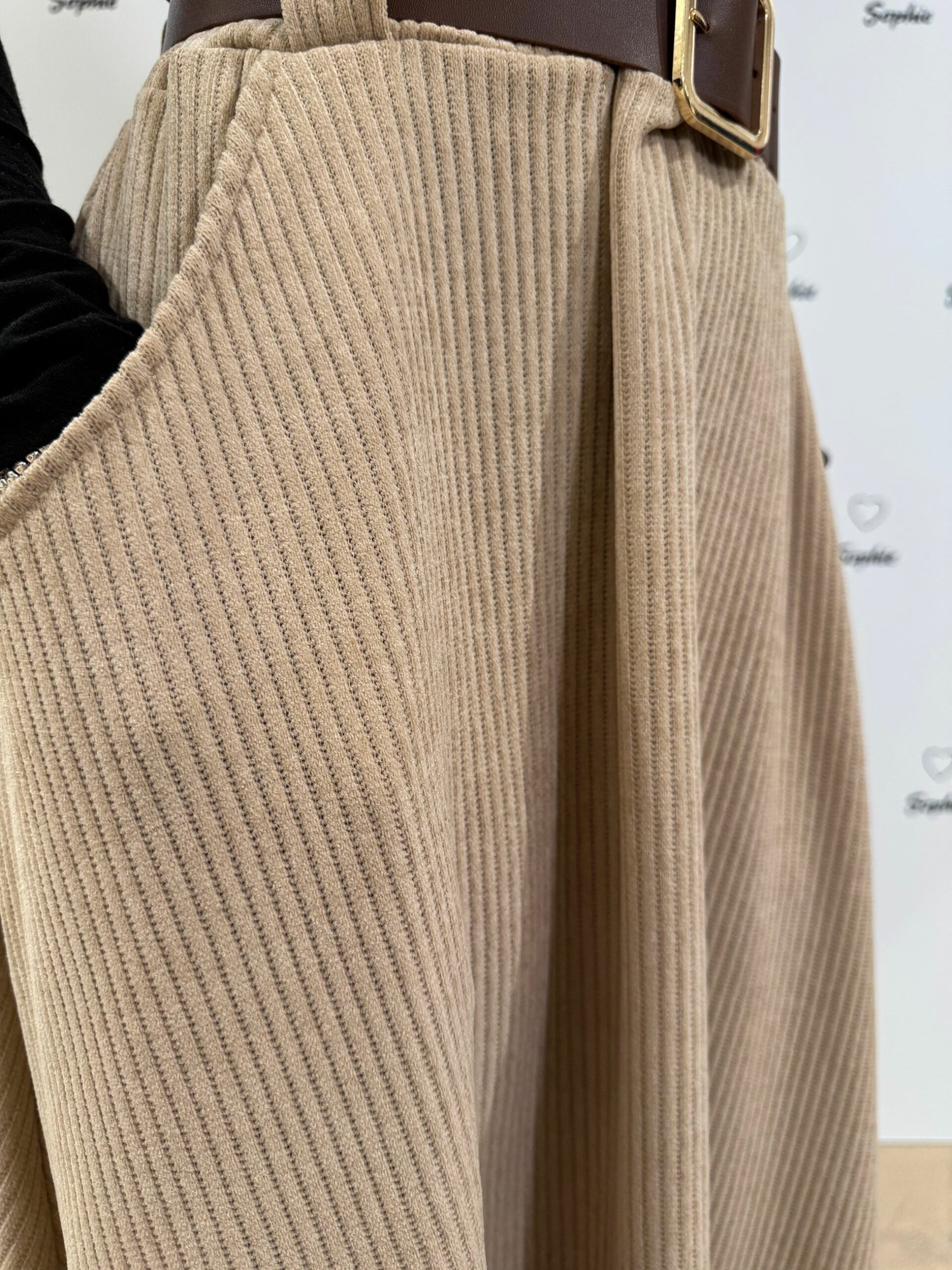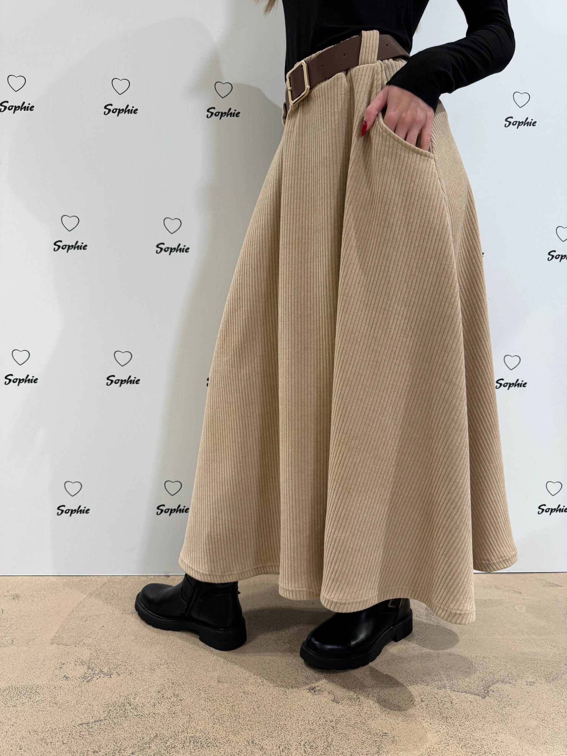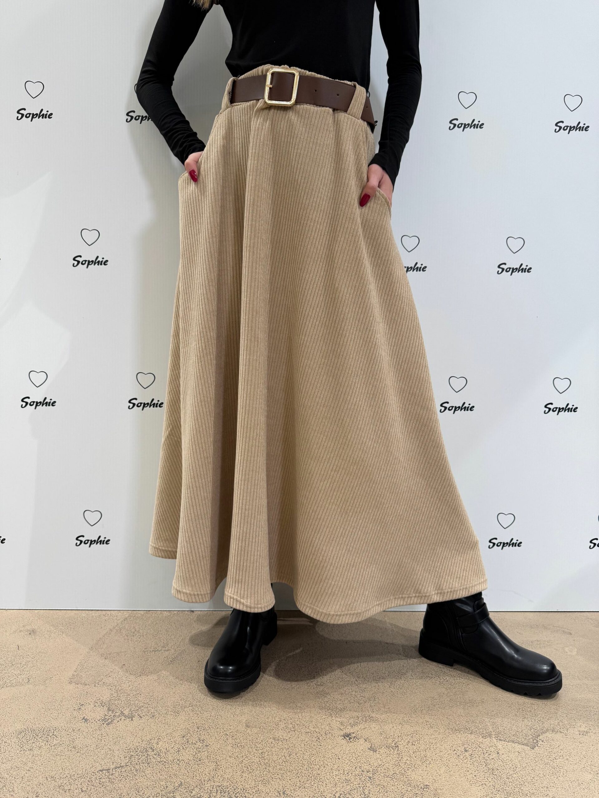 GONNA LUNGA SVASATA CON ELASTICO IN VITA IN TESSUTO EFFETTO VELLUTO A COSTE SOTTILI