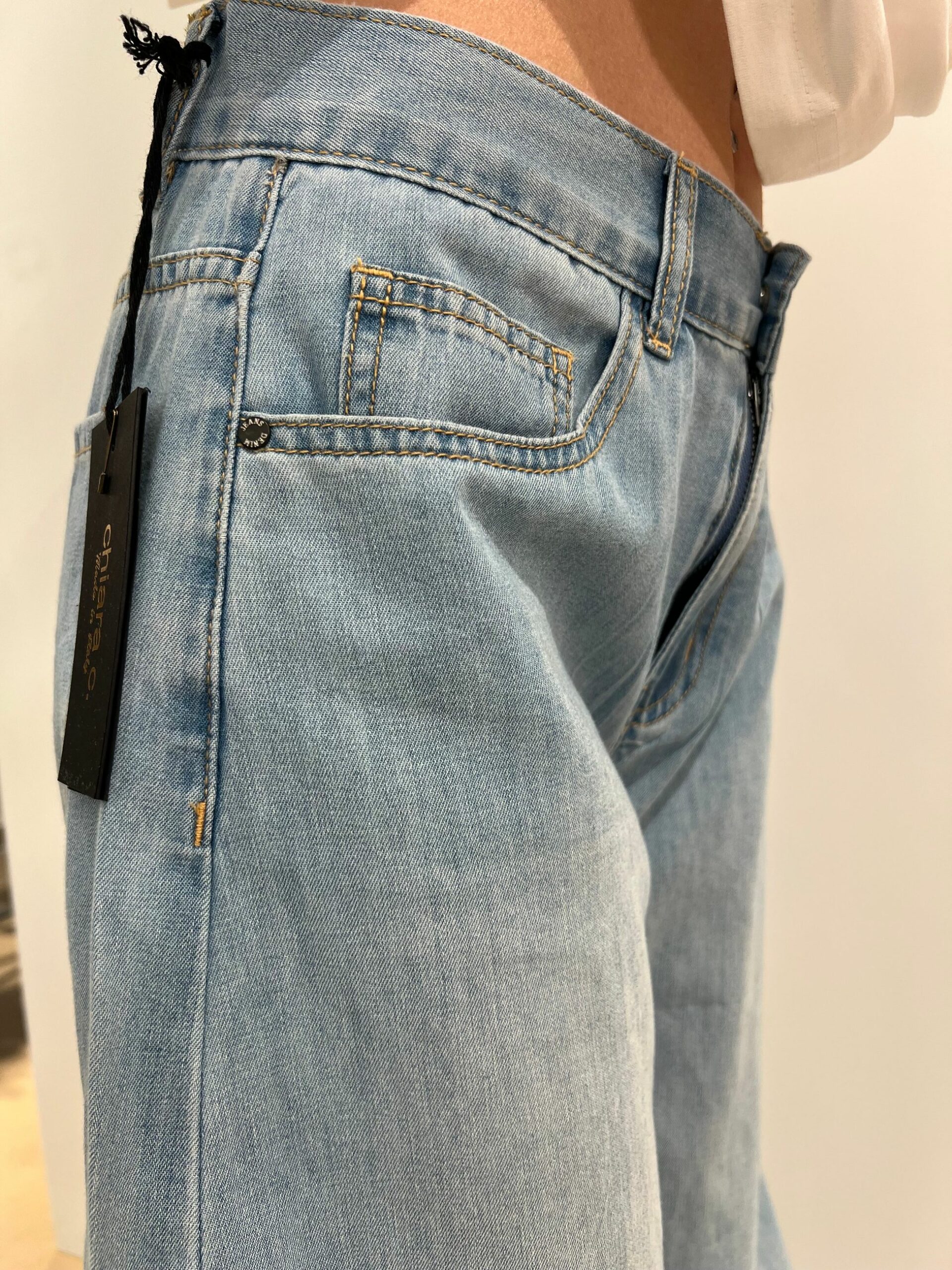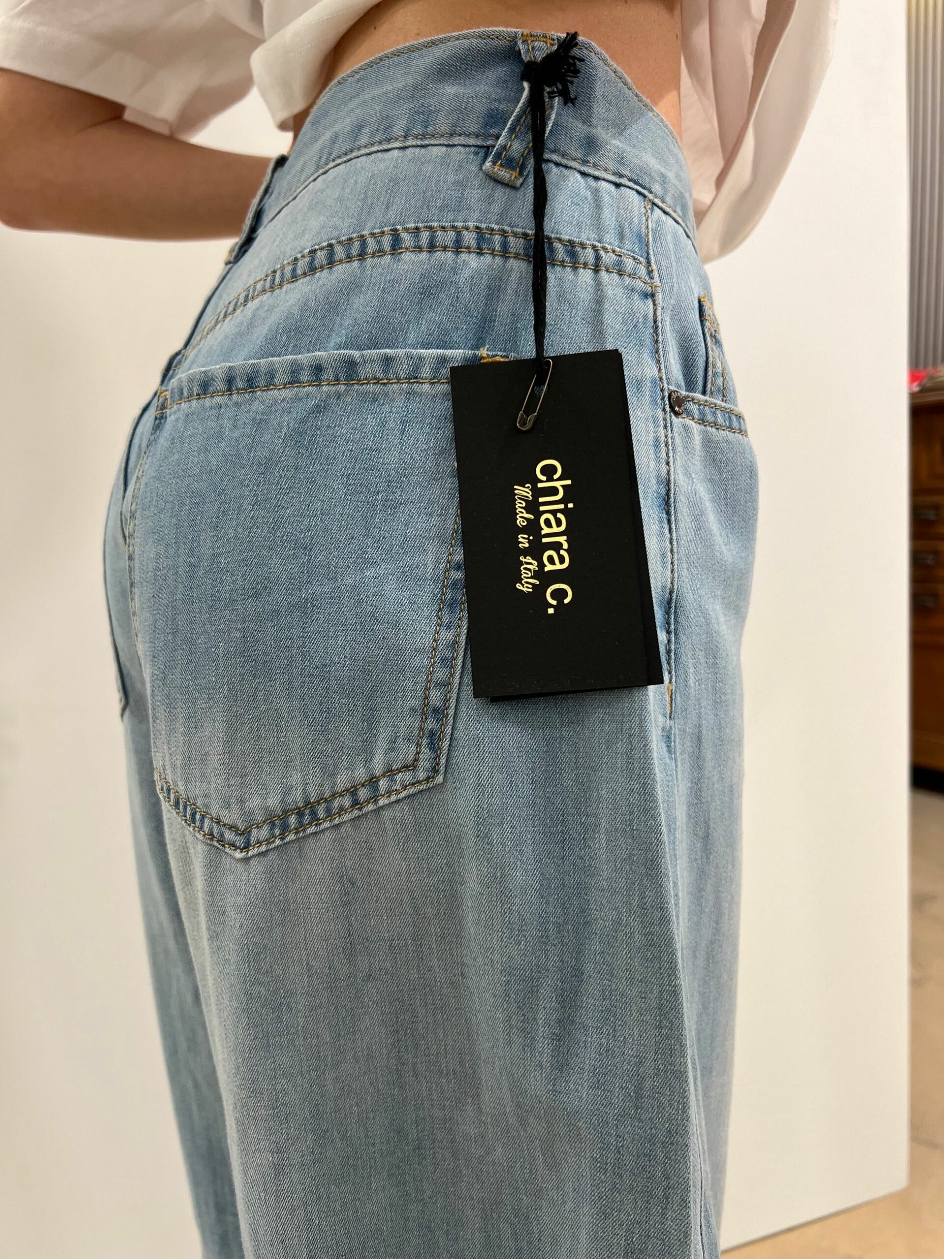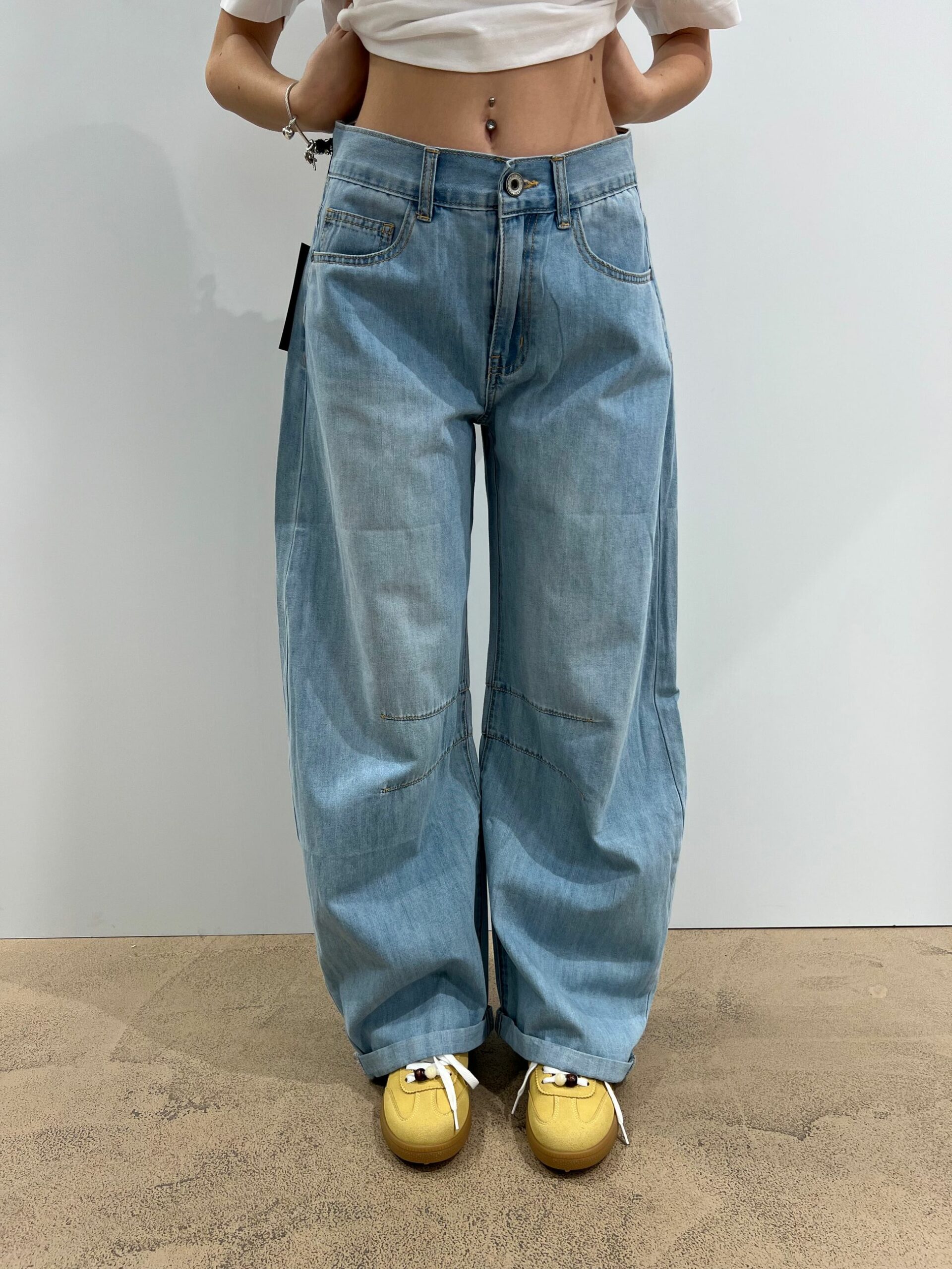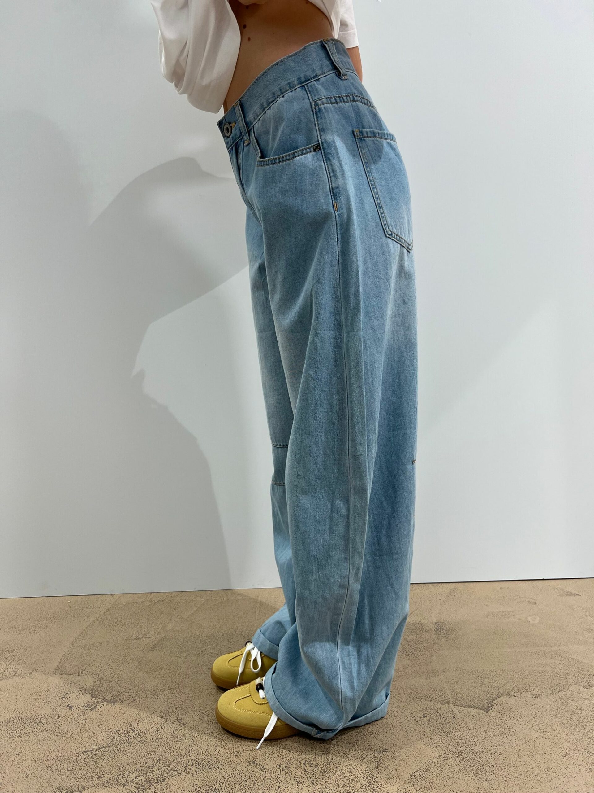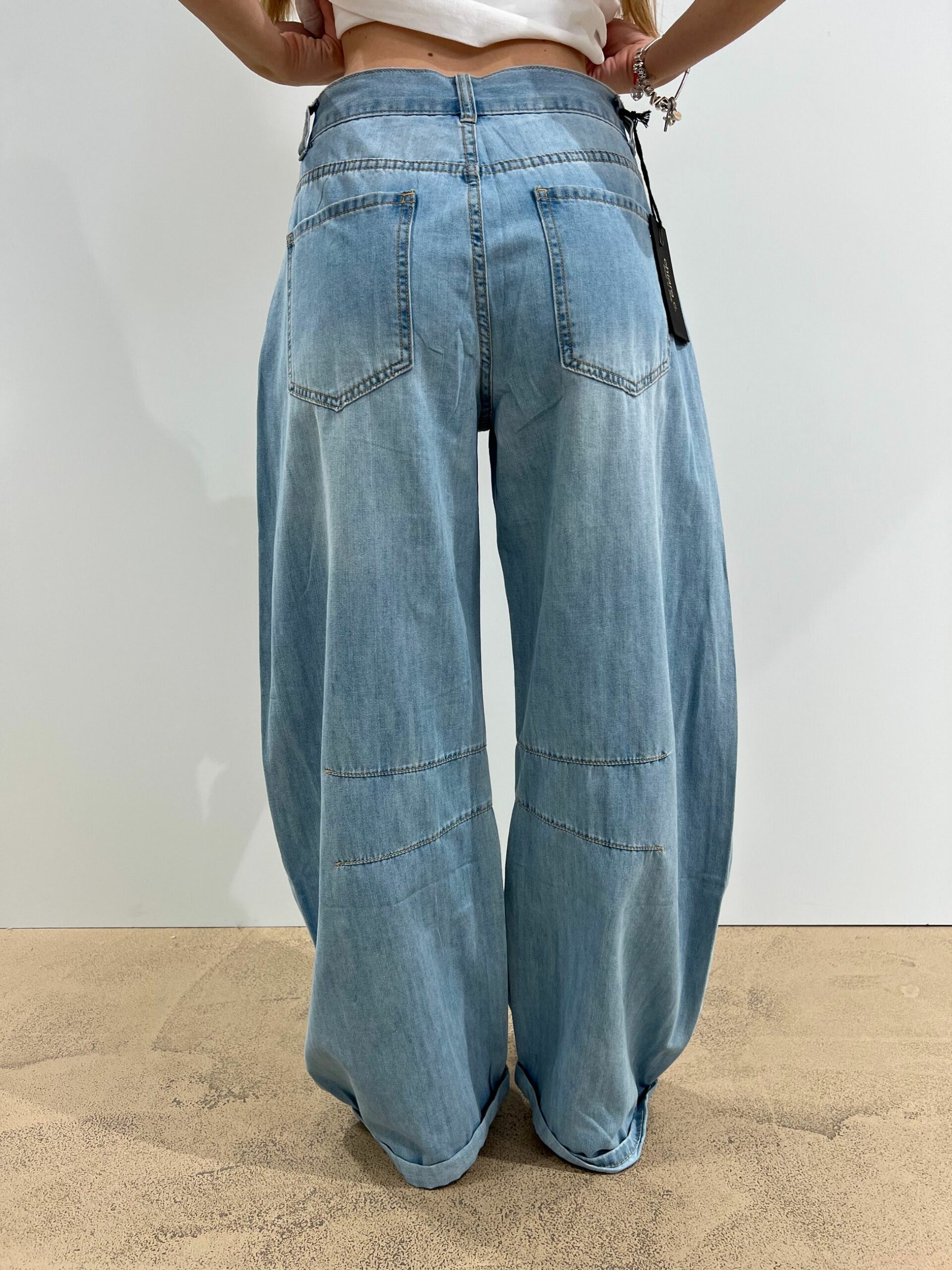 PANTALONE IN JEANS LEGGERO LAVAGGIO CHIARO. MODELLO BARREL CON RISVOLTO AL FONDO