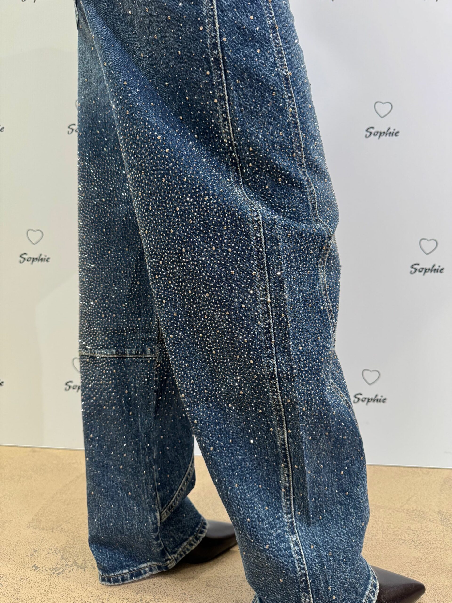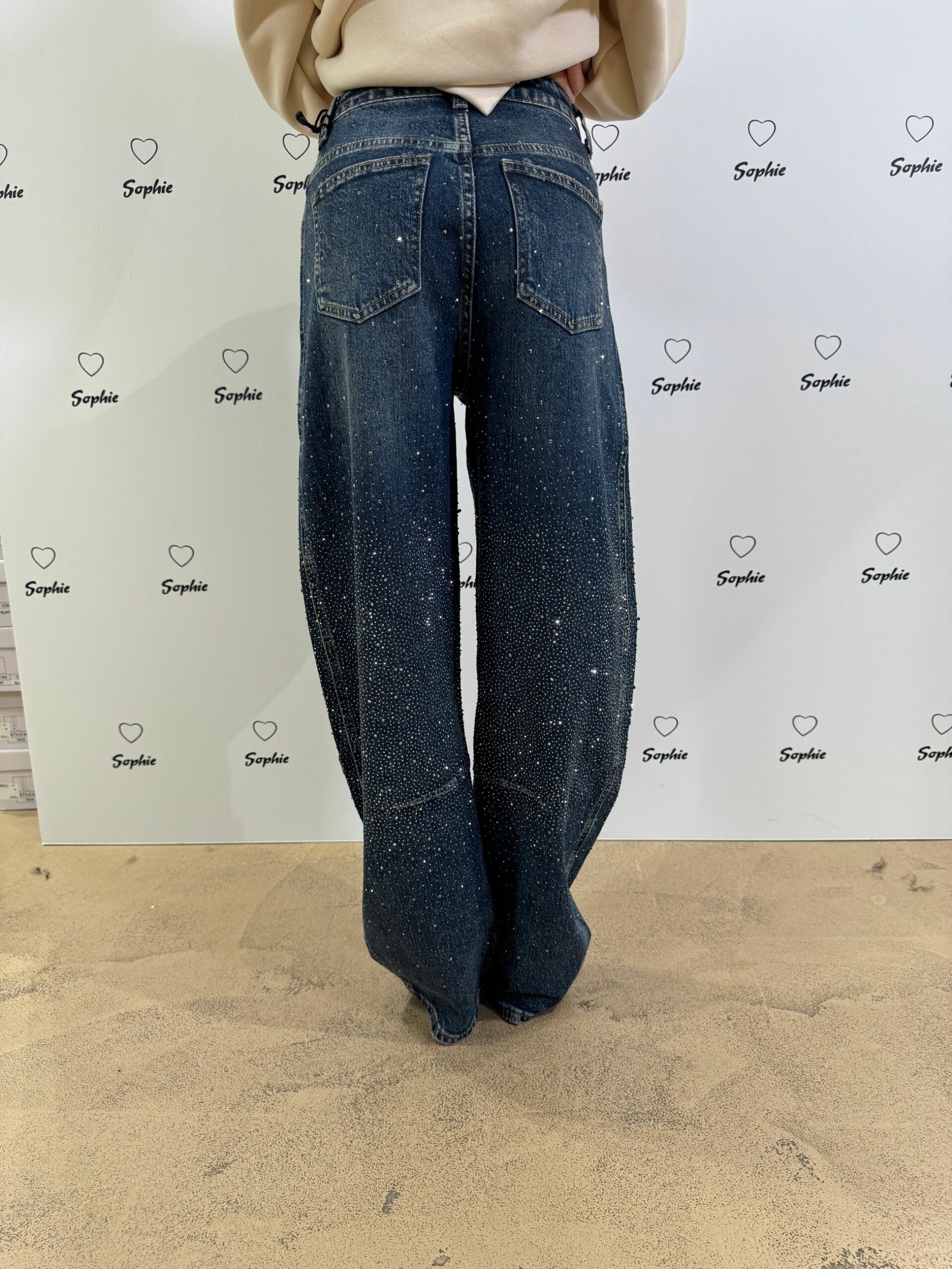 PANTALONE IN JEANS GAMBA LARGA BALLOON CON STRASS DAVANTI E DIETRO