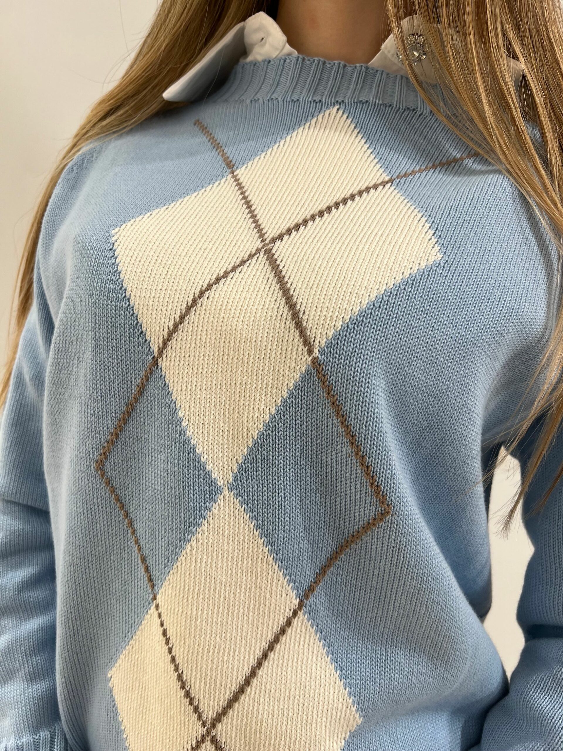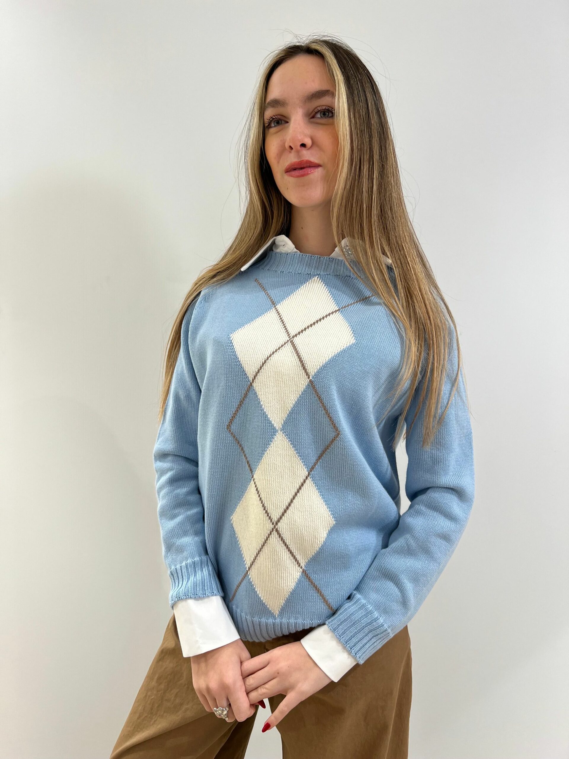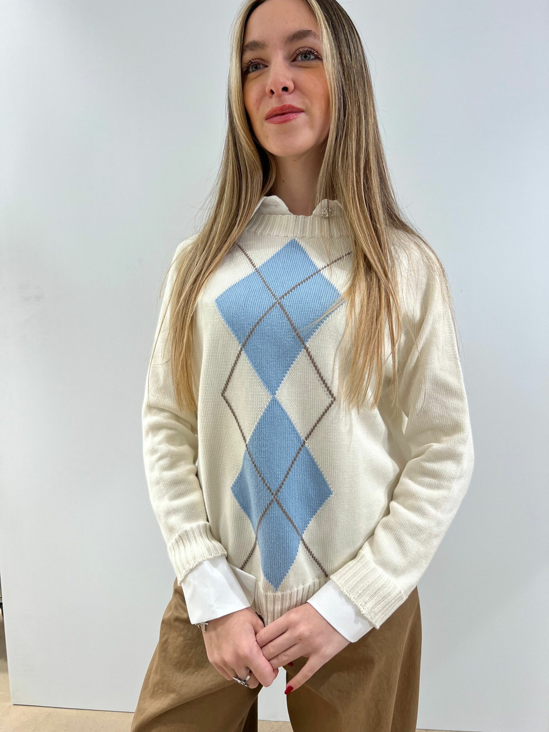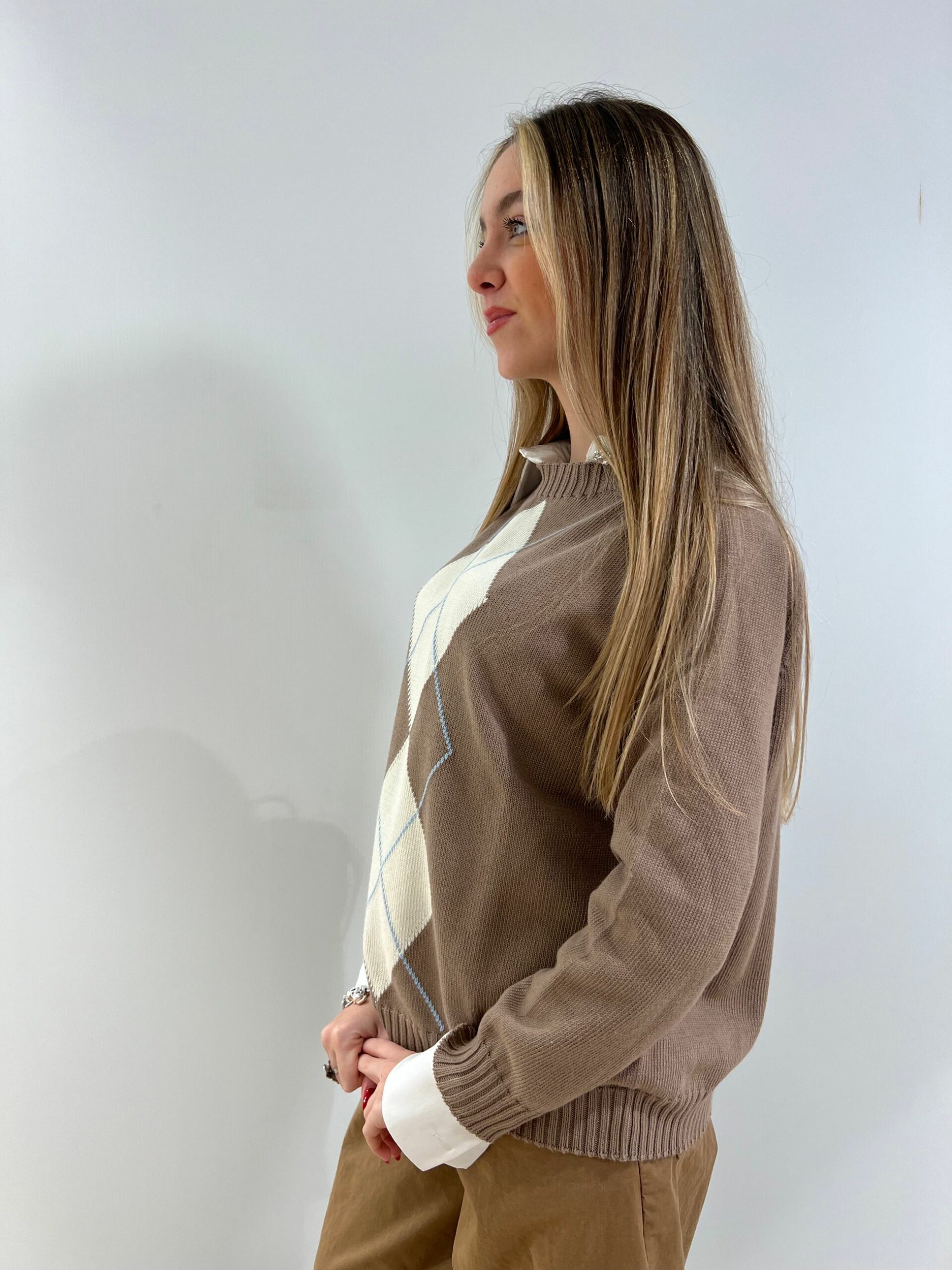 MAGLIA 100% COTONE CON DISEGNO A LOSANGA, LUNGHEZZA MEDIA, MANICA LUNGA