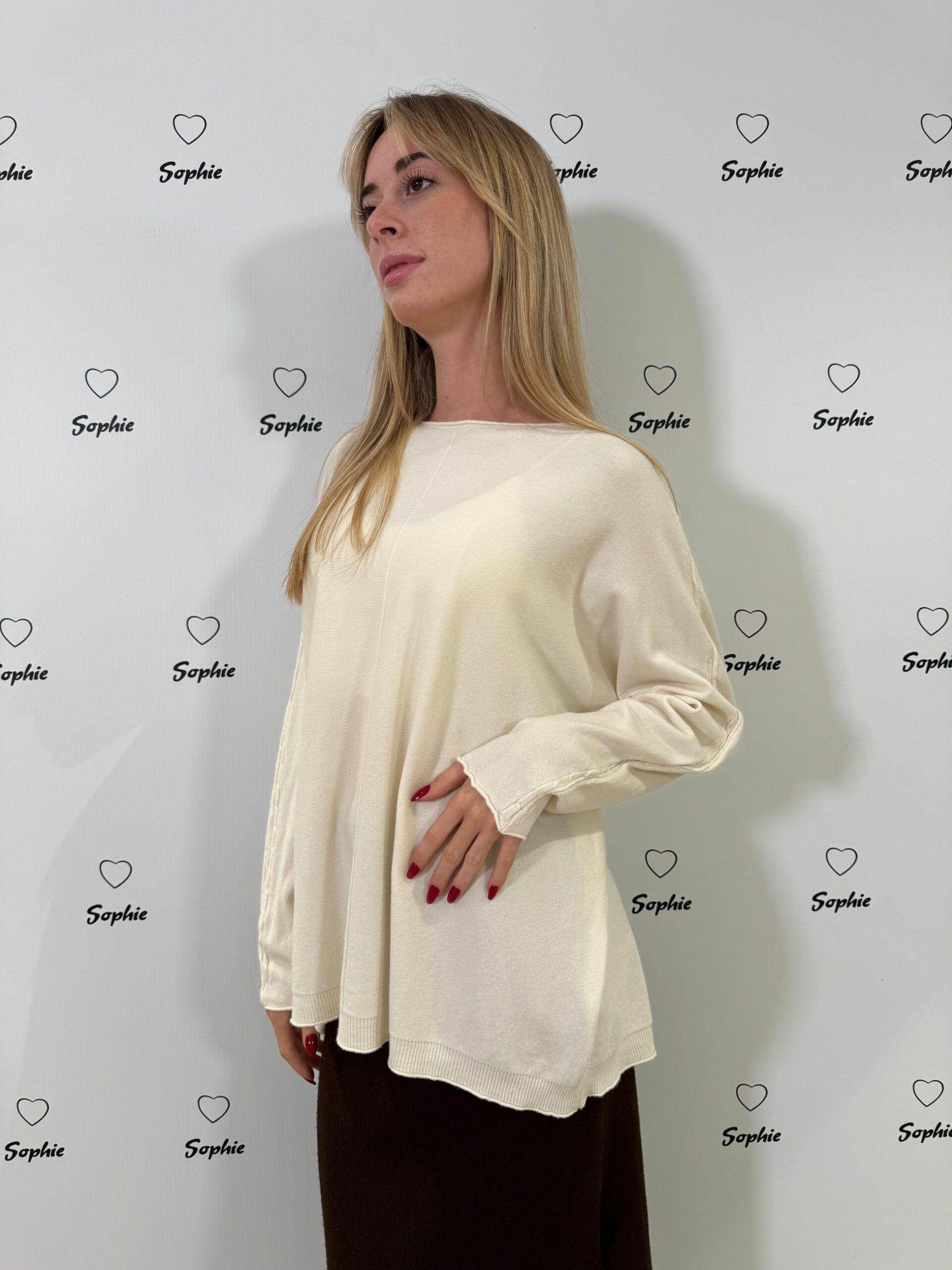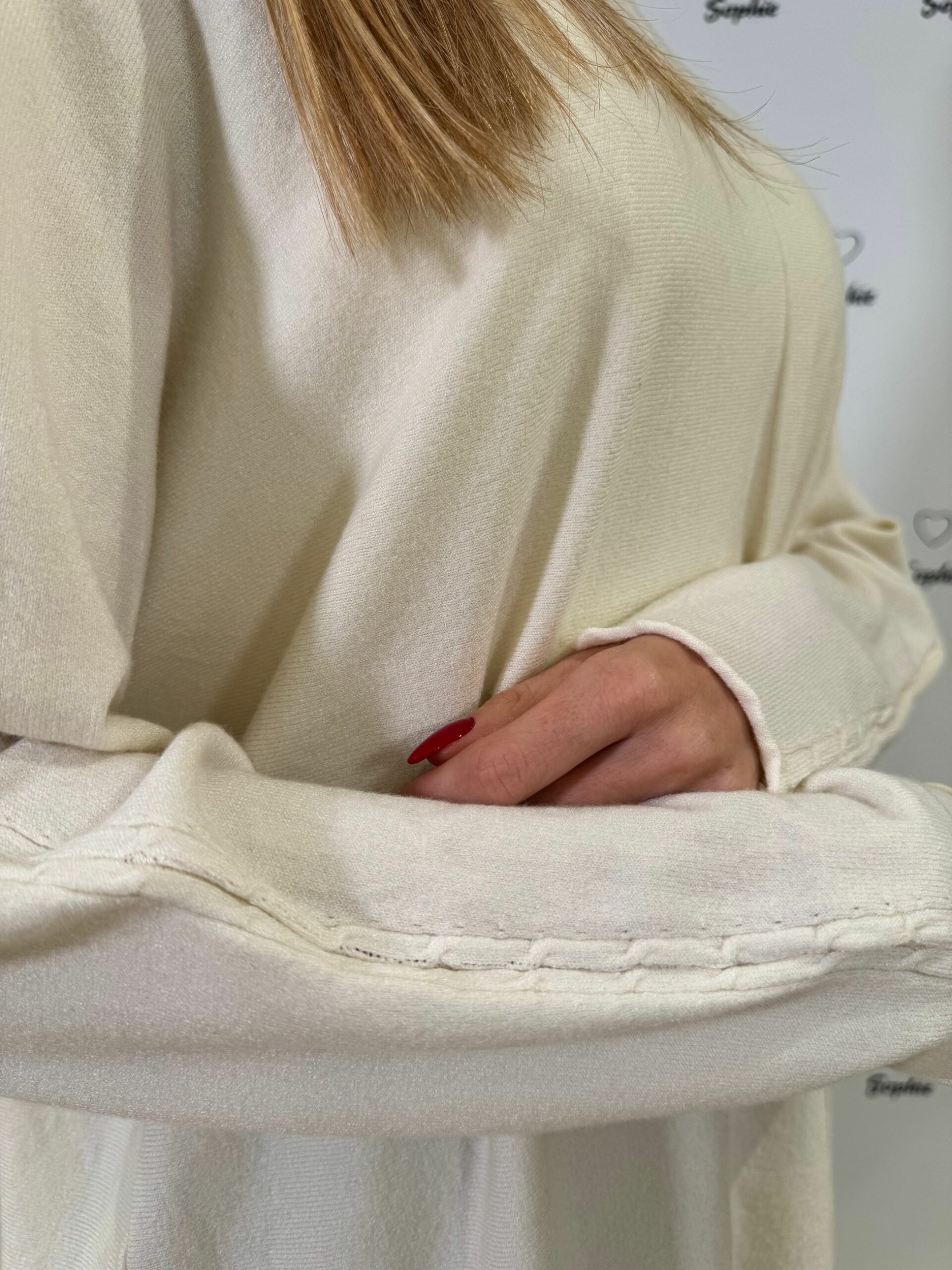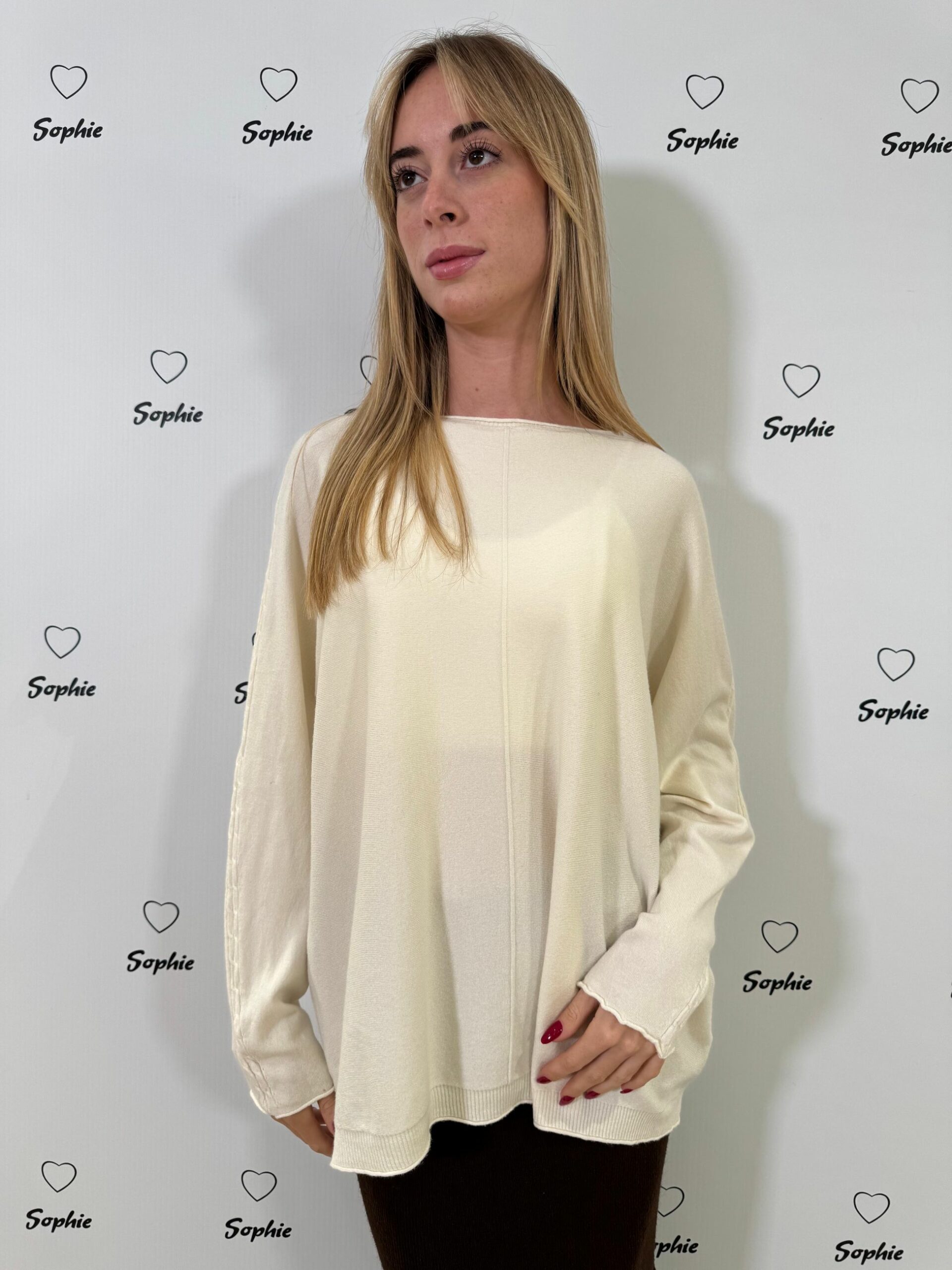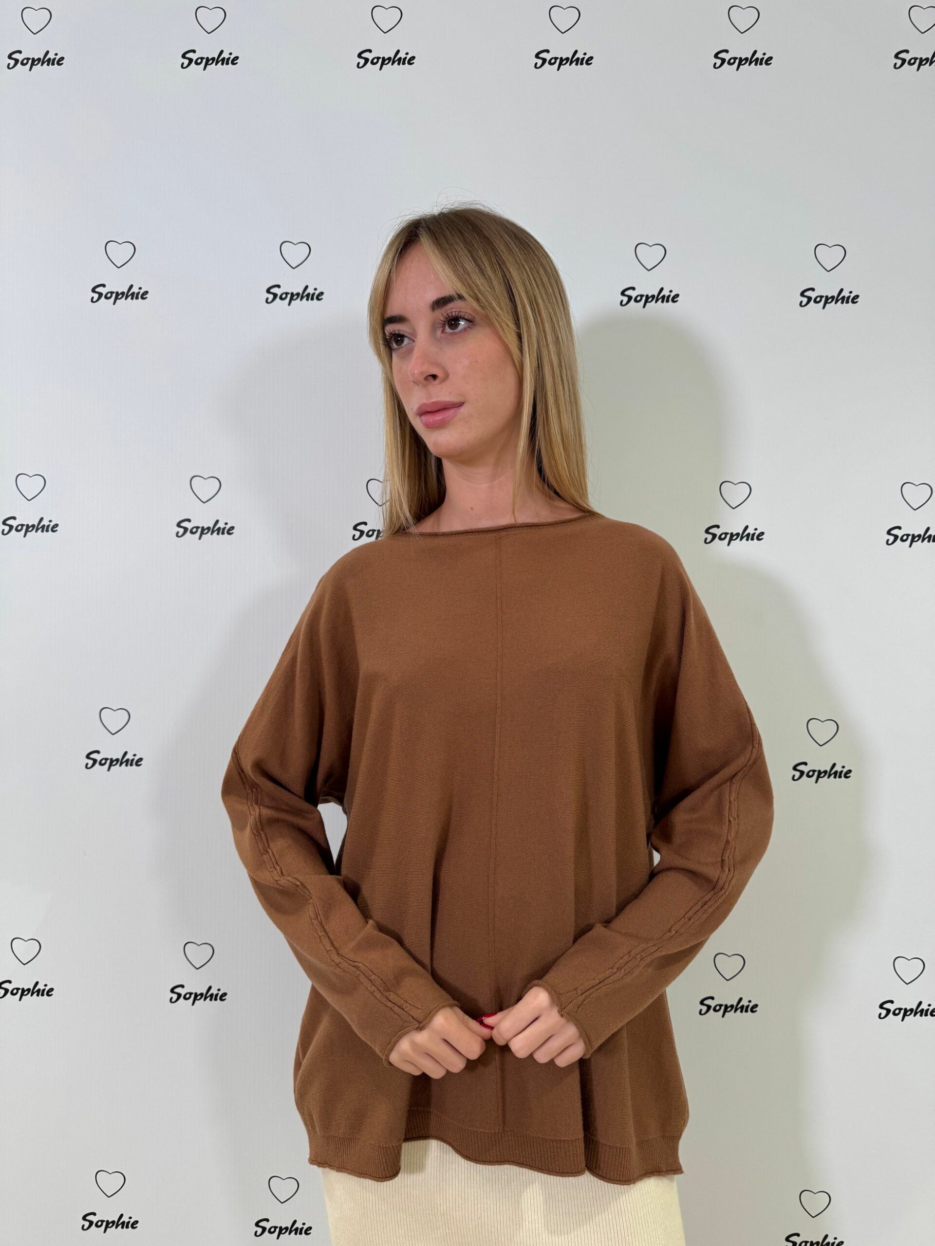 MAGLIA A VESTIBILITA’ OVER CON LAVORAZIONE A TORCIGLIONI SULLA LUNGHEZZA DELLA MANICA