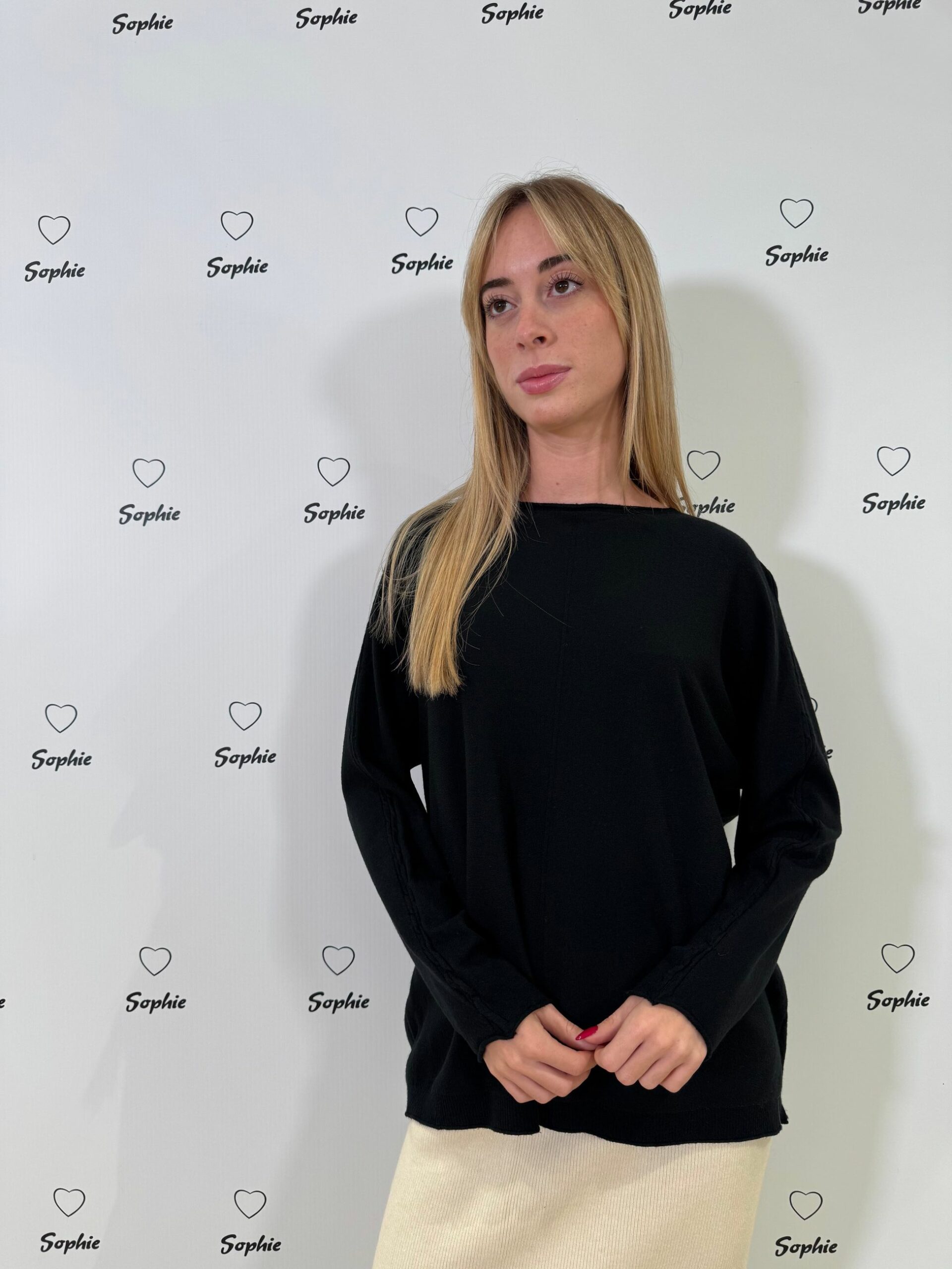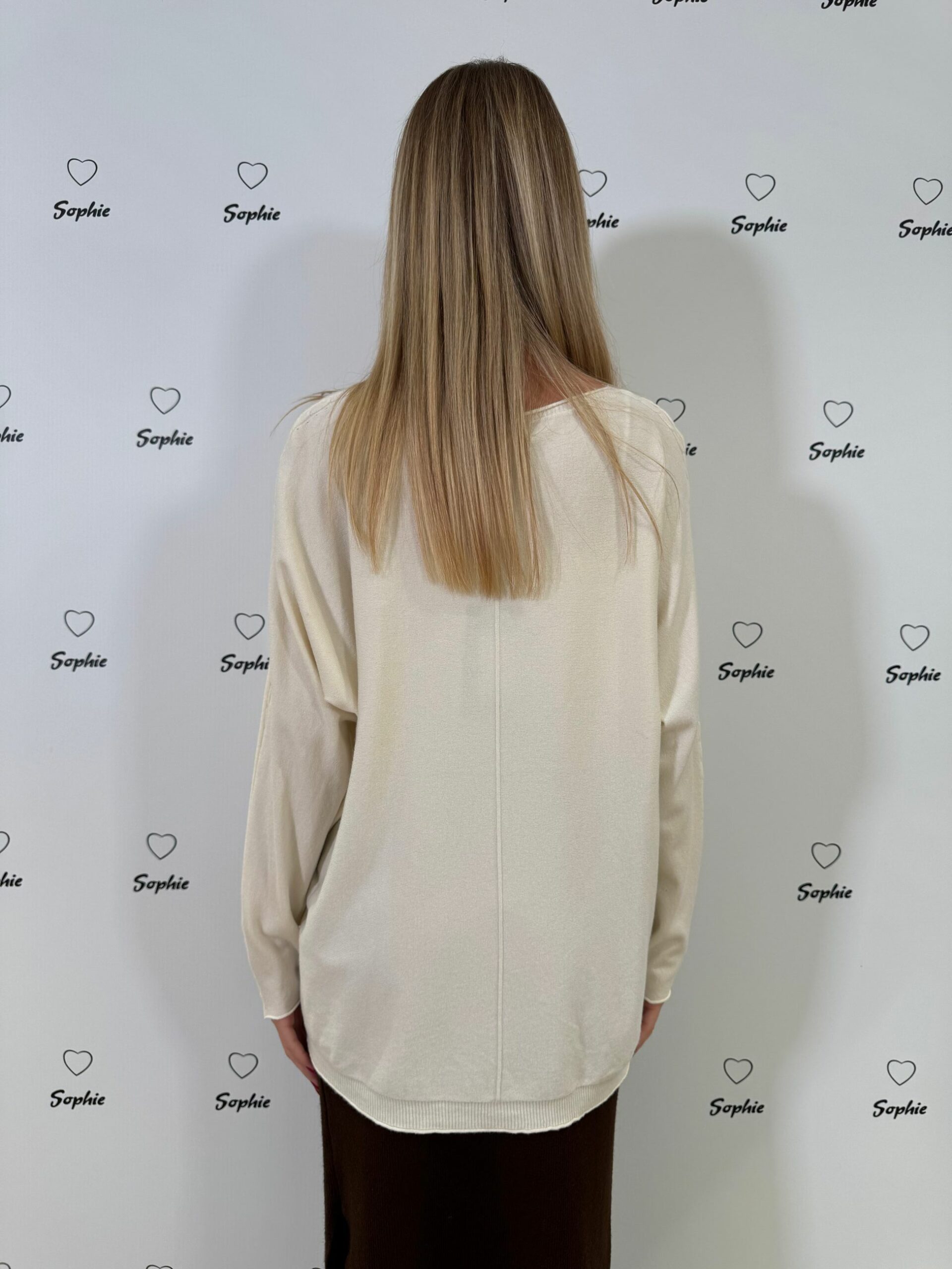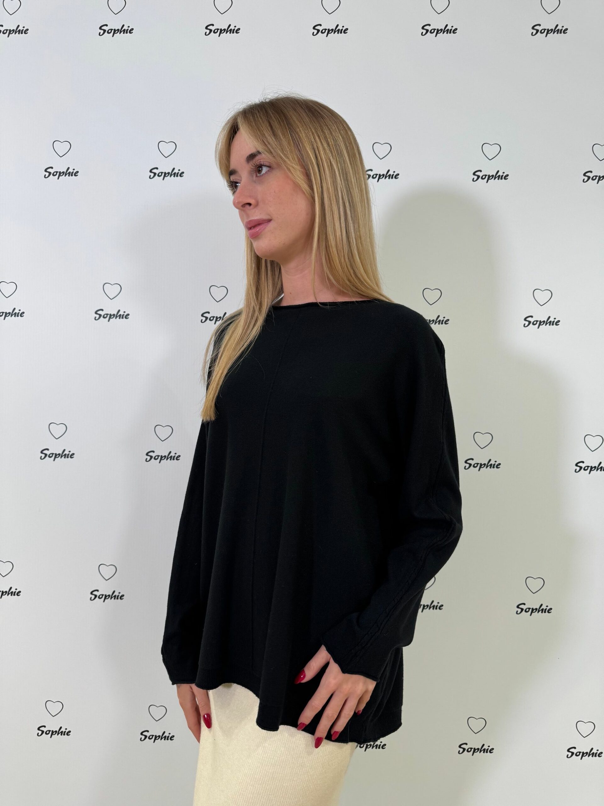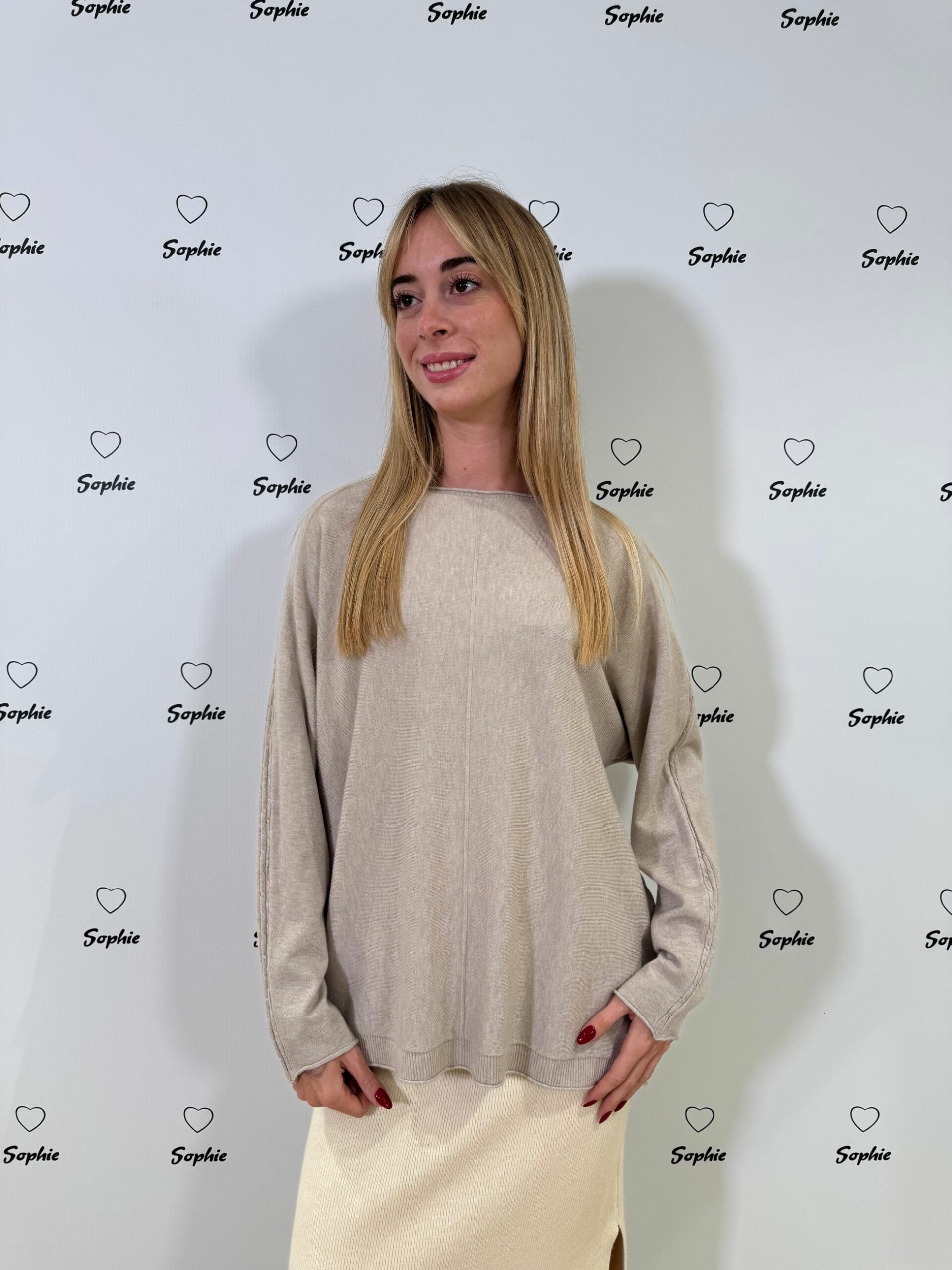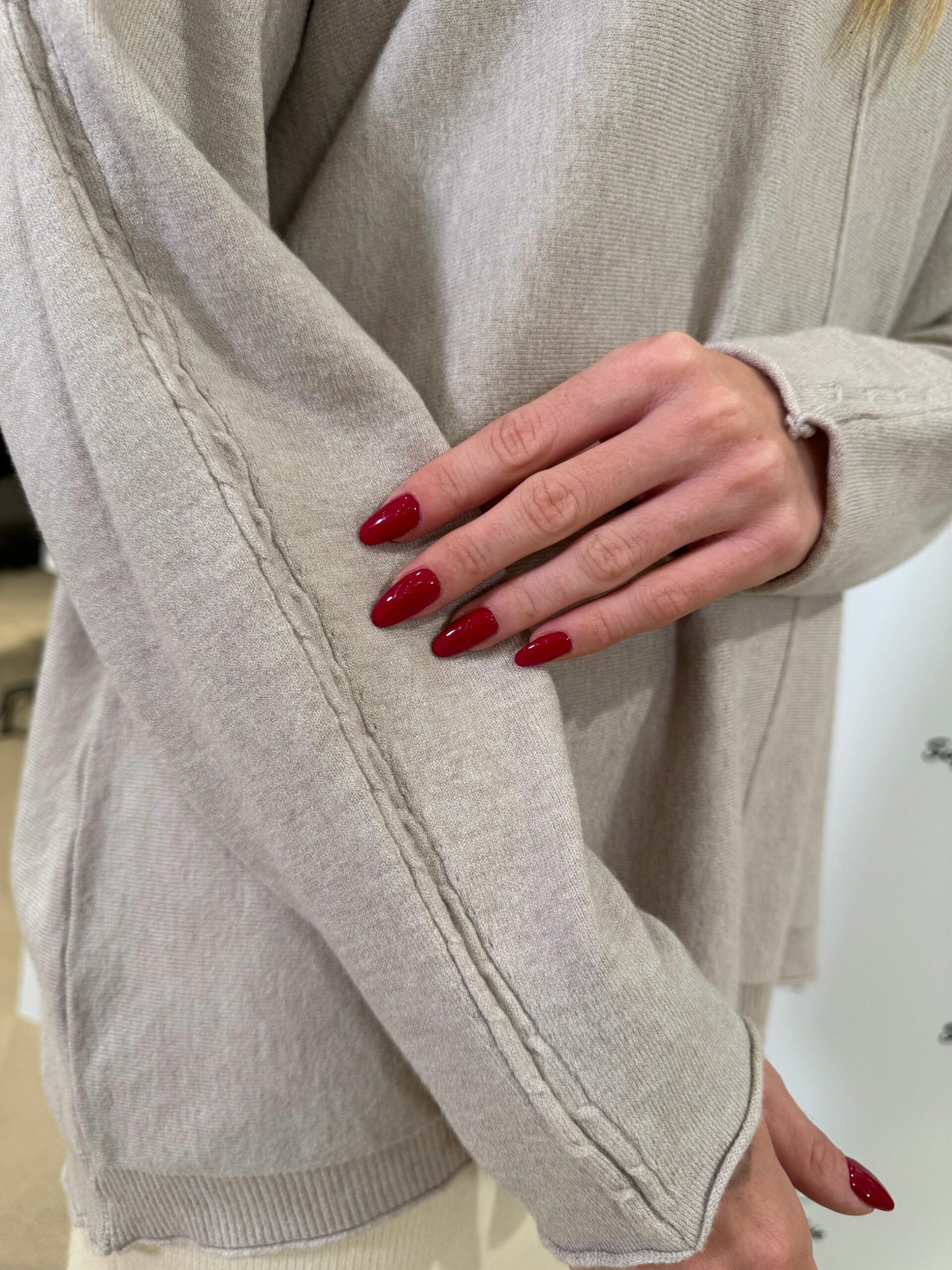 MAGLIA A VESTIBILITA’ OVER CON LAVORAZIONE A TORCIGLIONI SULLA LUNGHEZZA DELLA MANICA