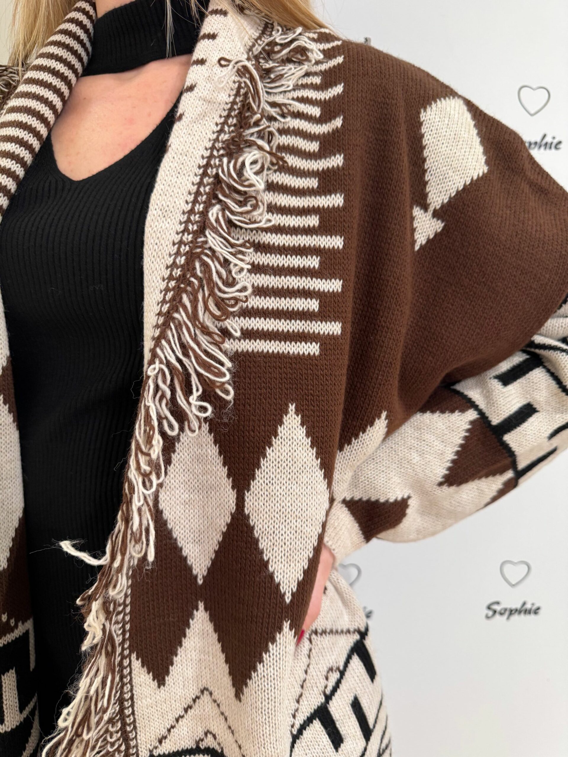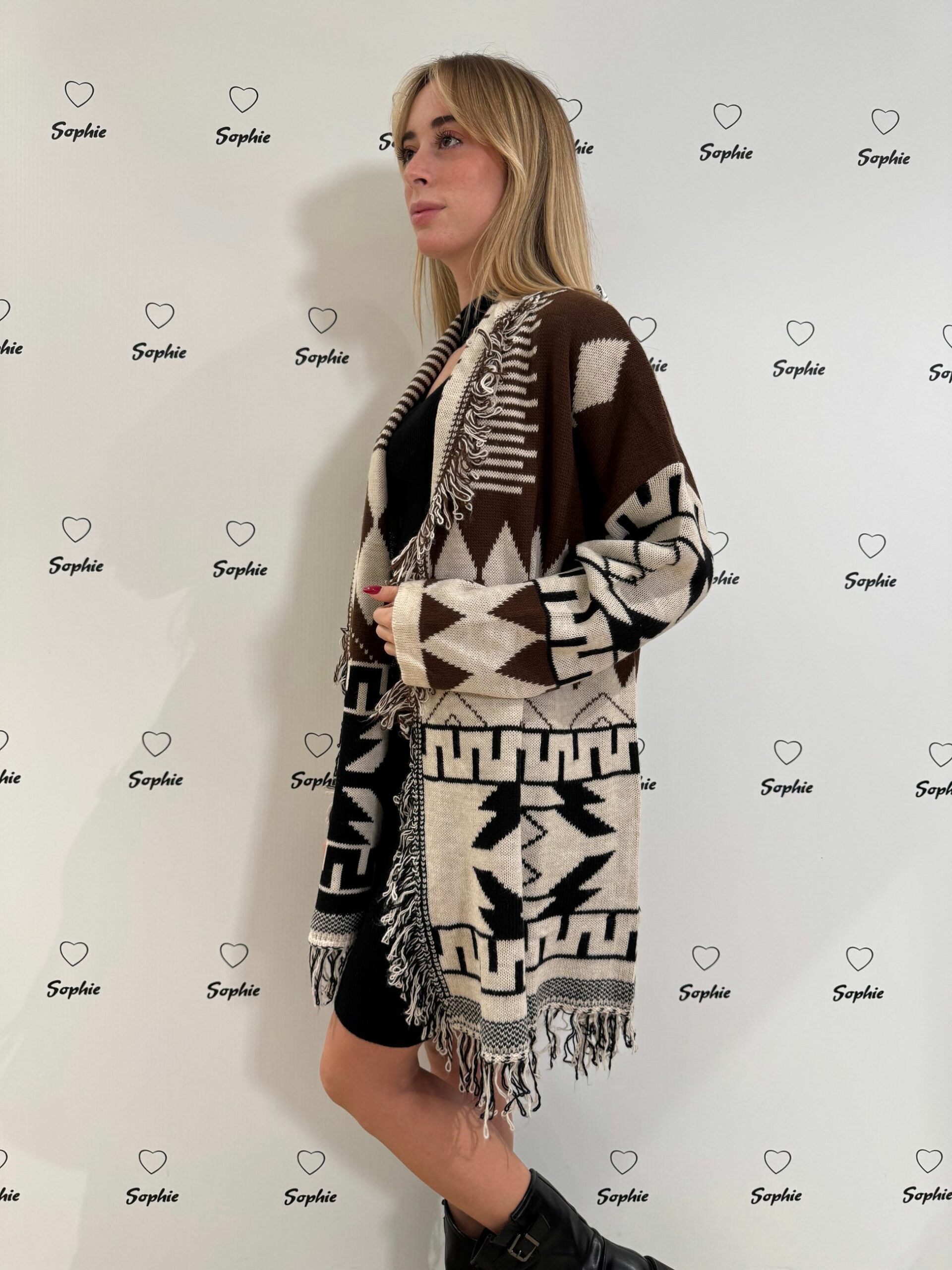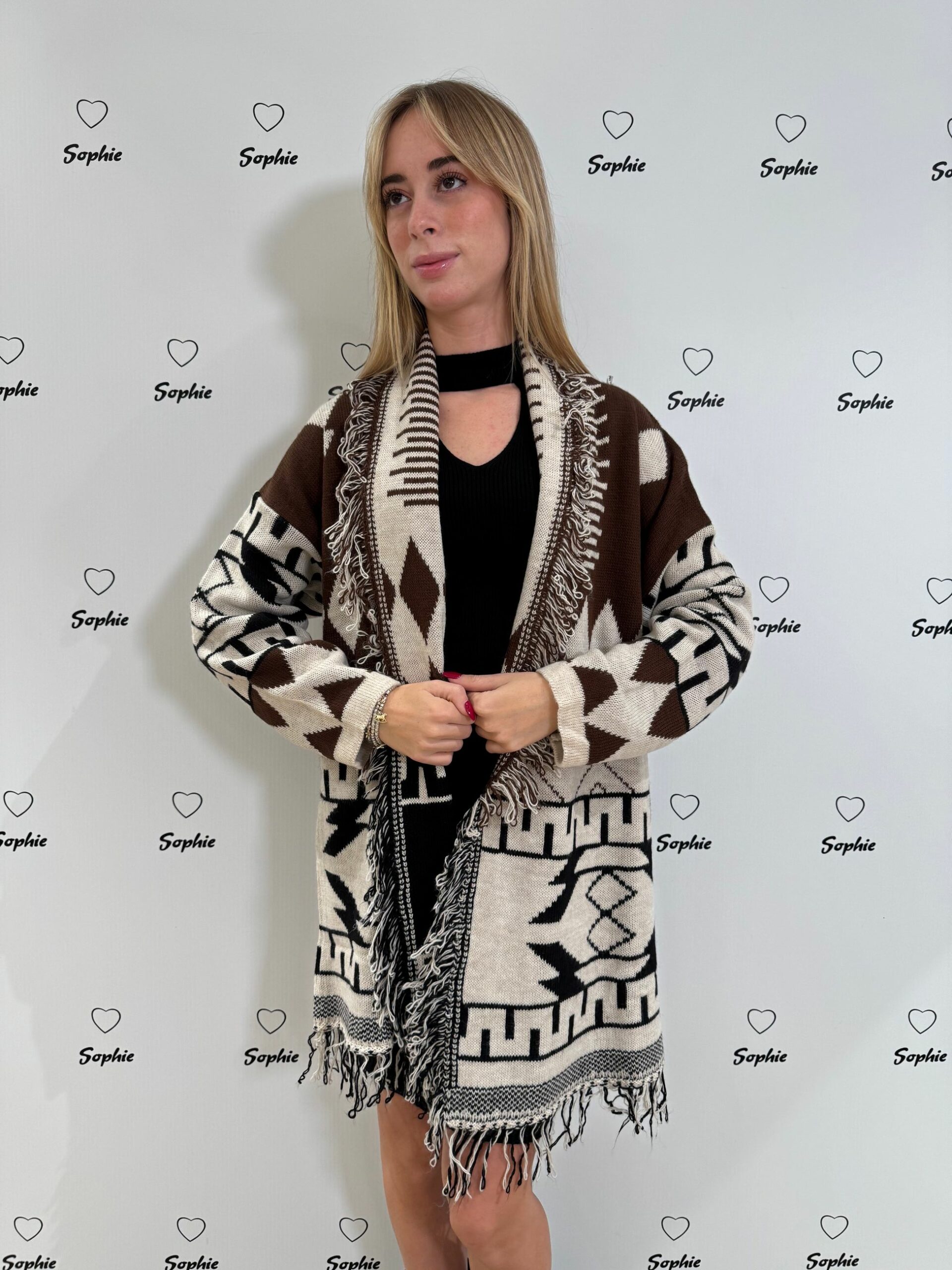 CARDIGAN IN FANTASIA BICOLORE CON FRANGE SUL BORDO