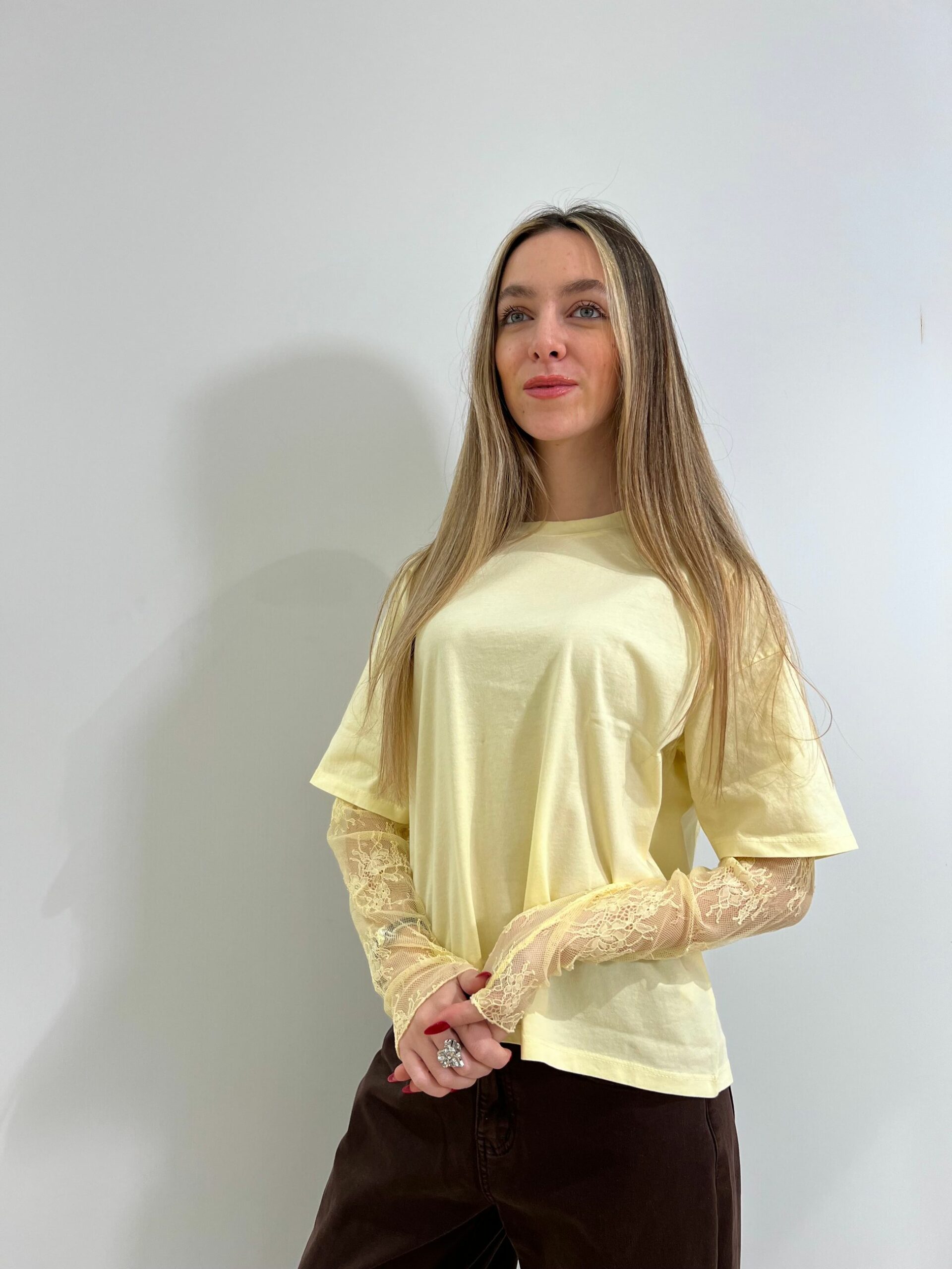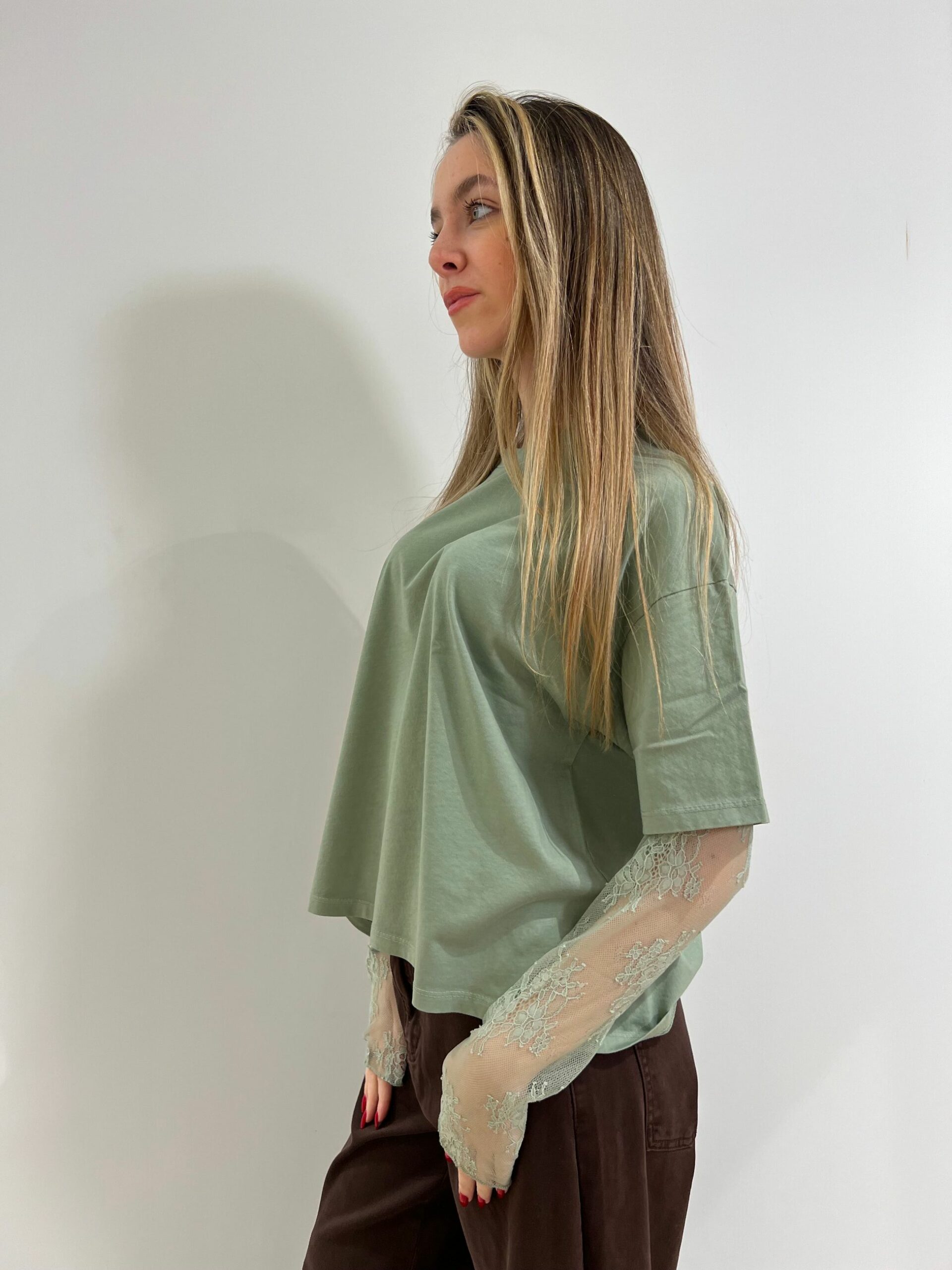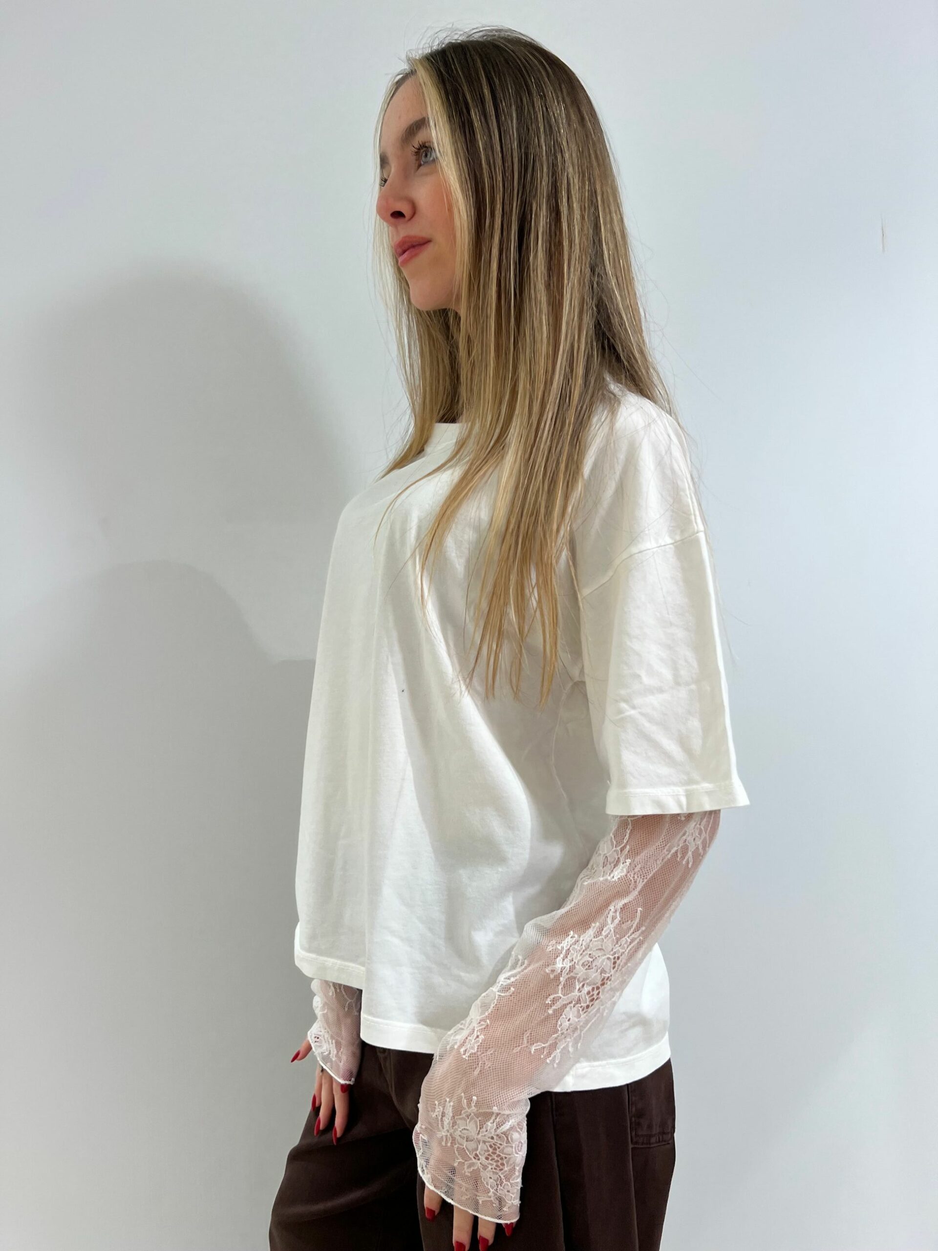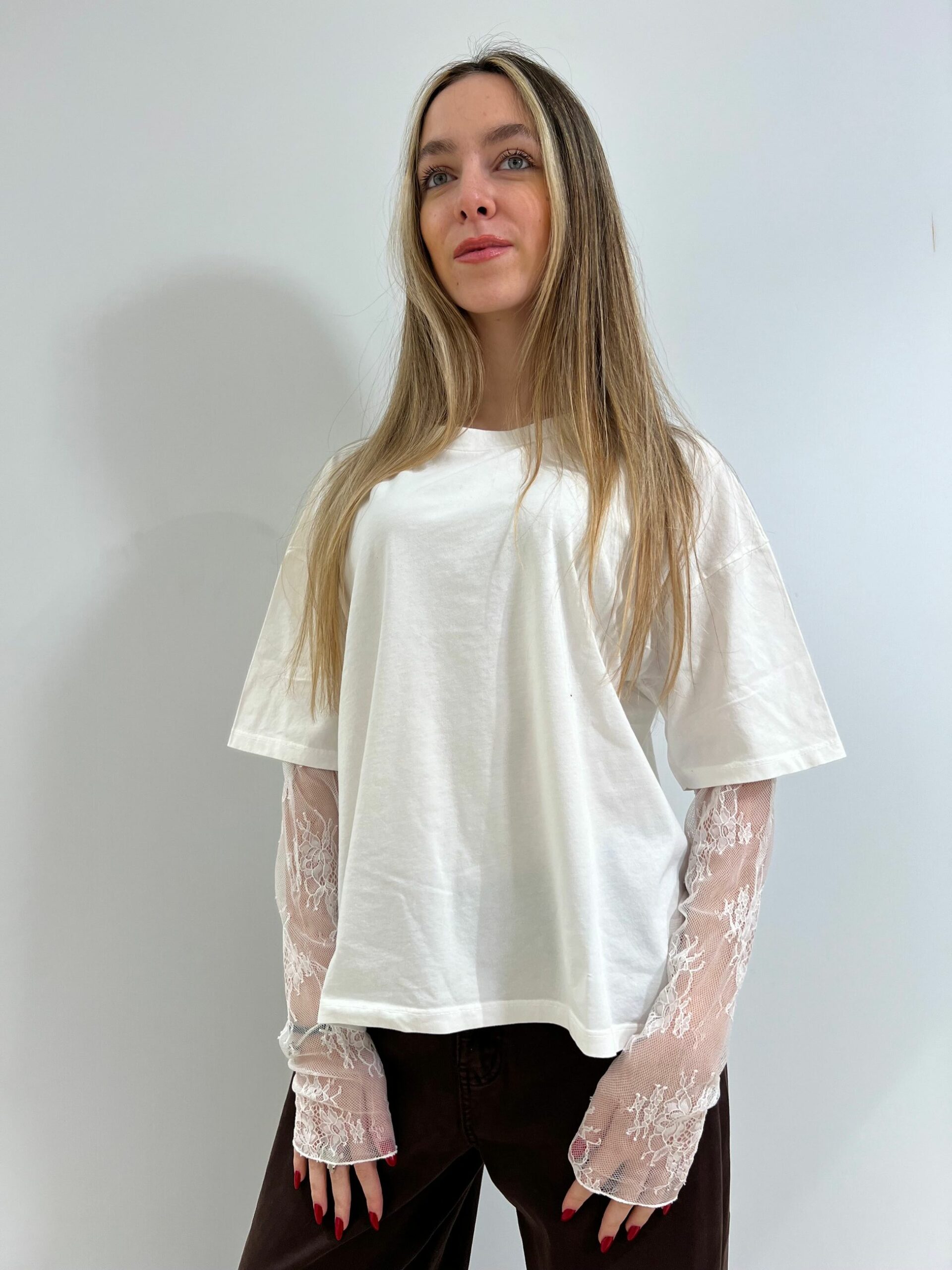 T-SHIRT MANICA CORTA IN COTONE + MANICA LUNGA IN PIZZO, GIROCOLLO