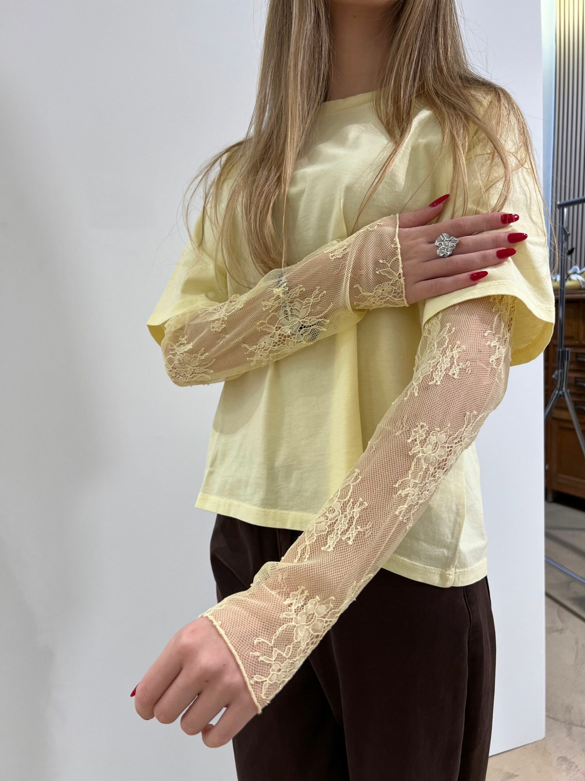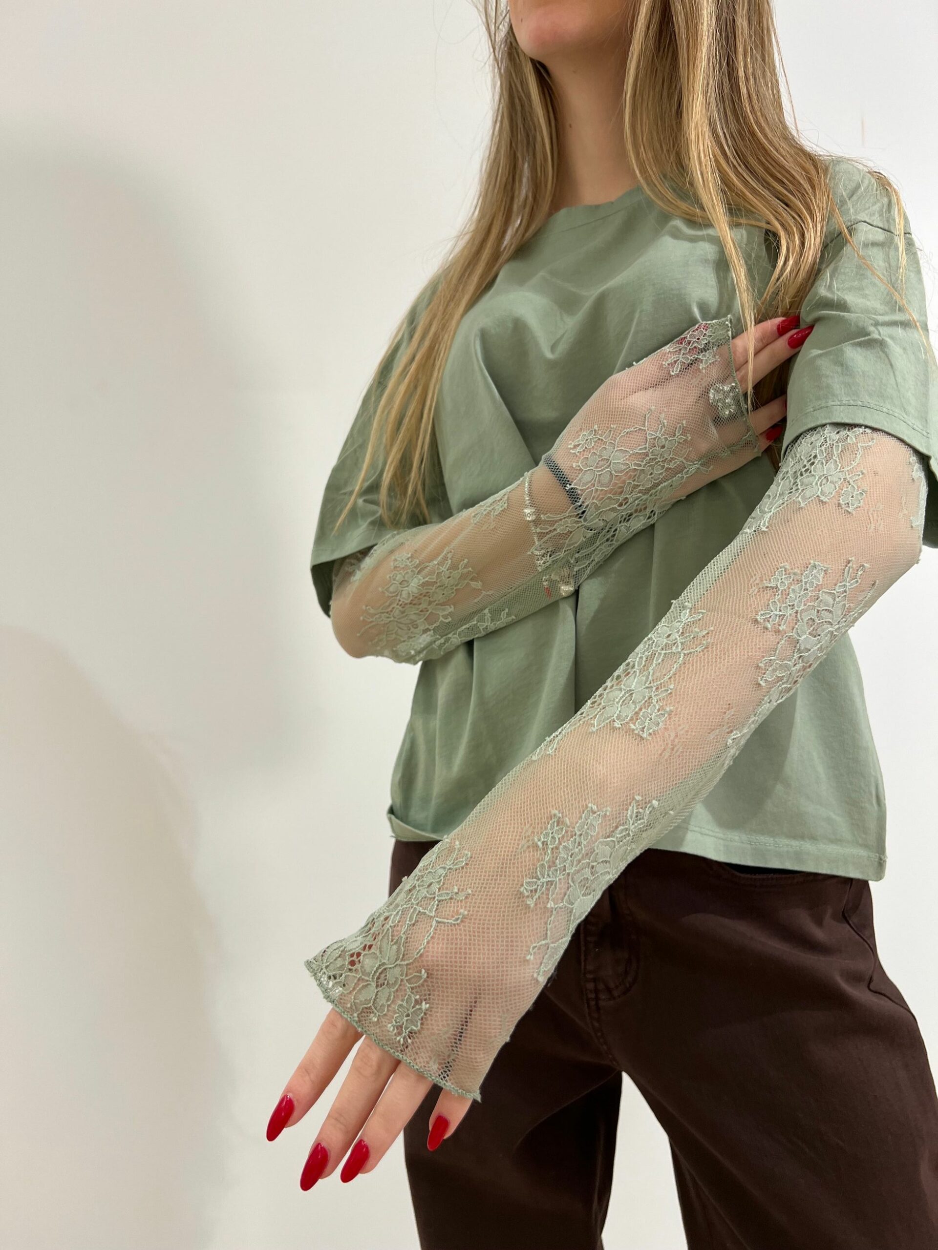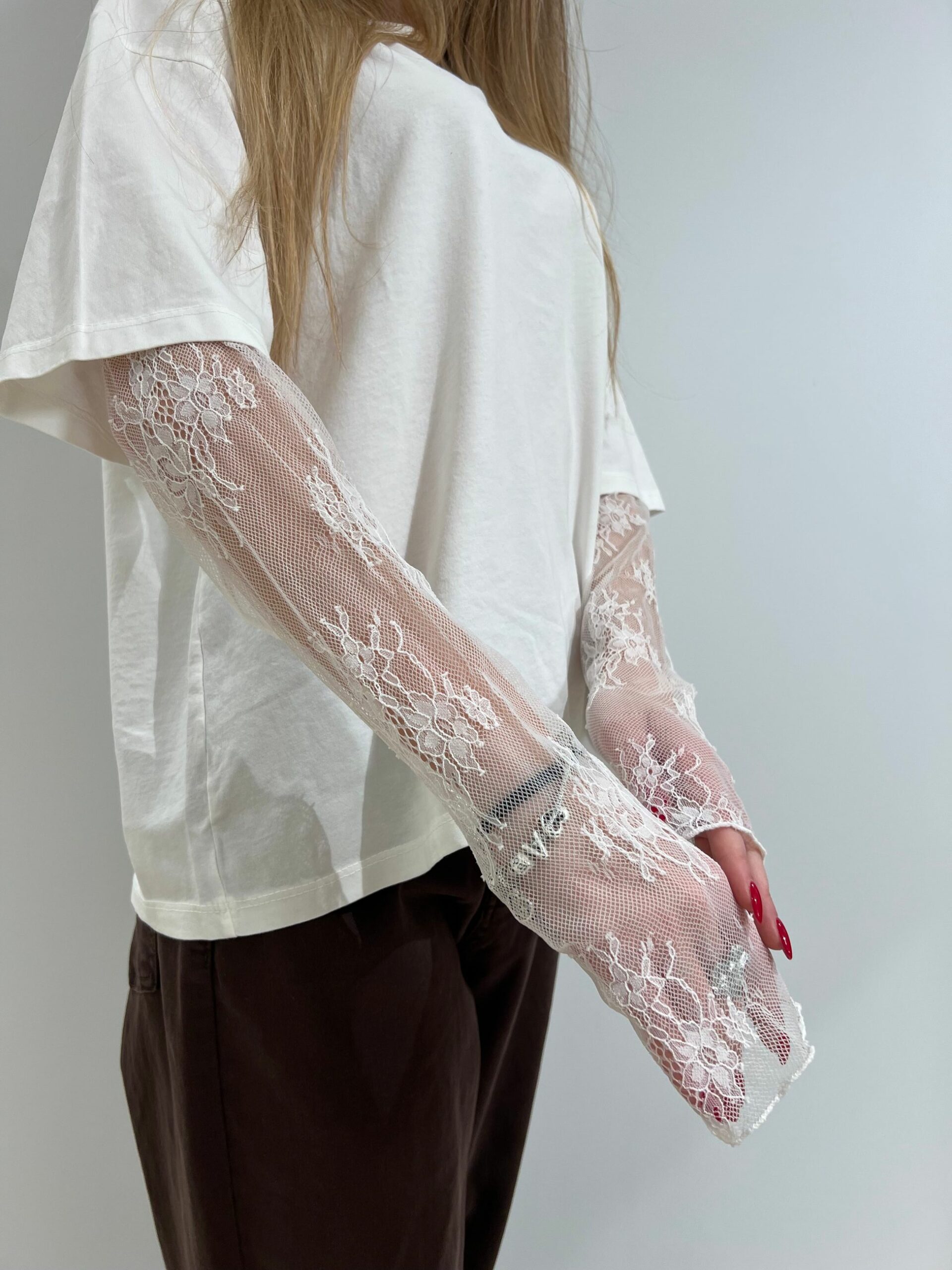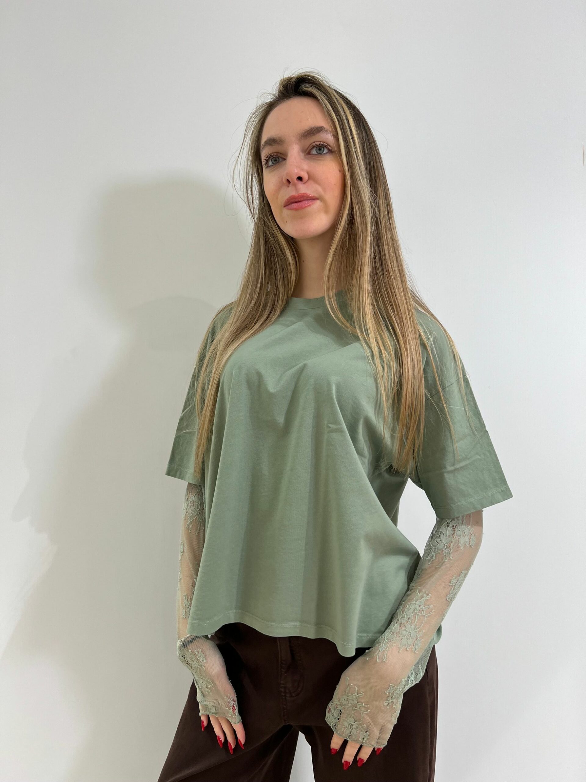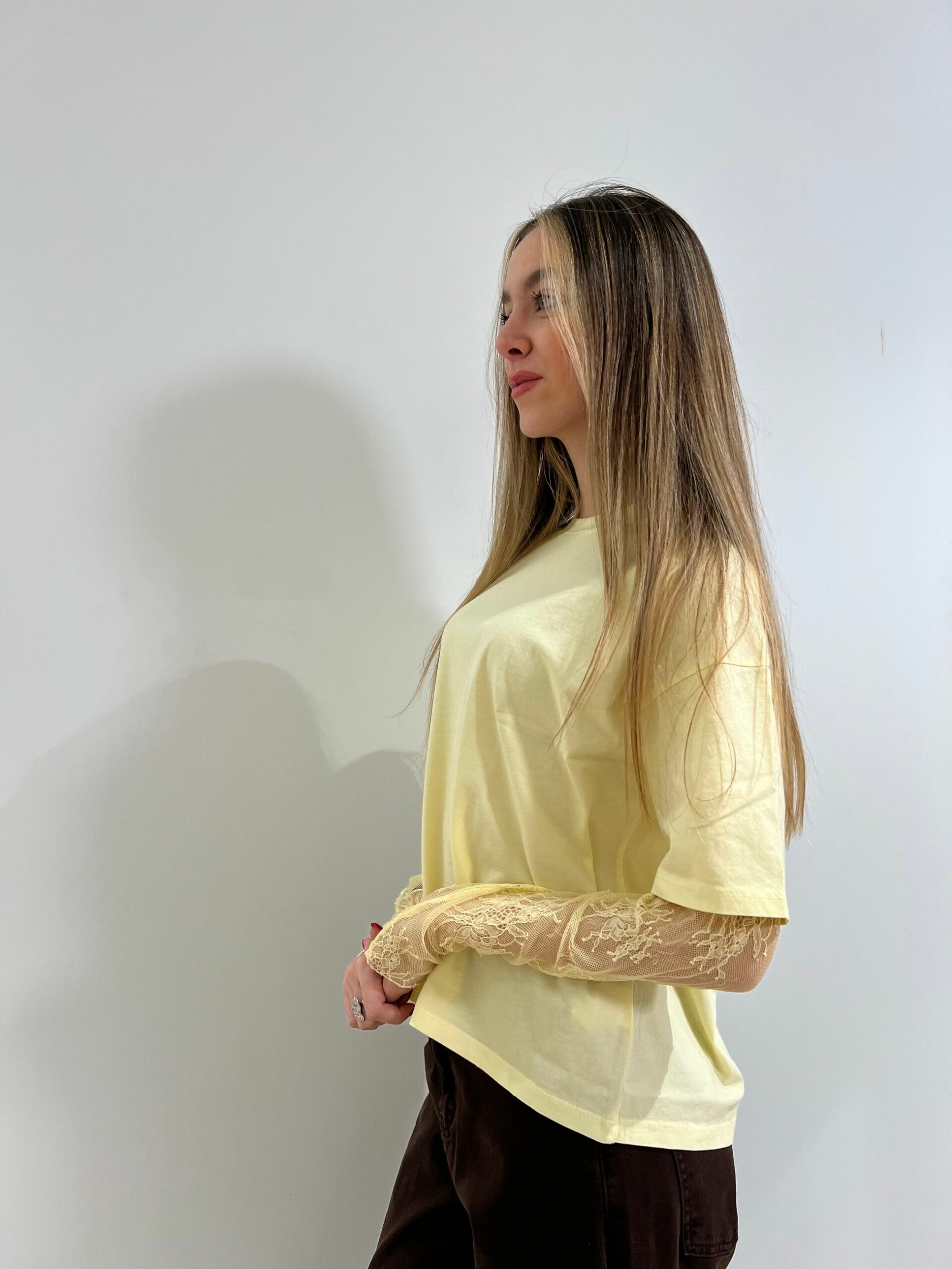 T-SHIRT MANICA CORTA IN COTONE + MANICA LUNGA IN PIZZO, GIROCOLLO