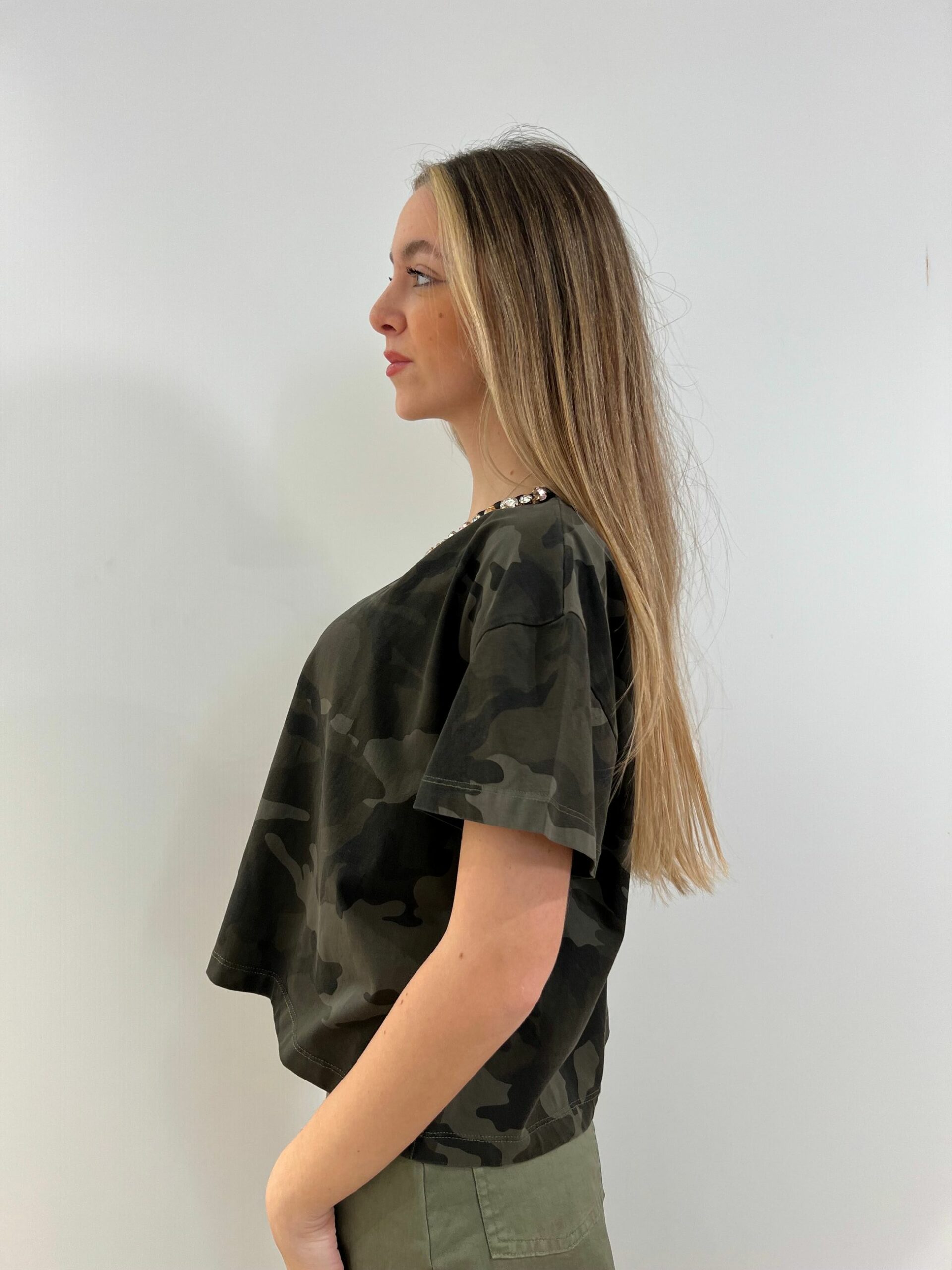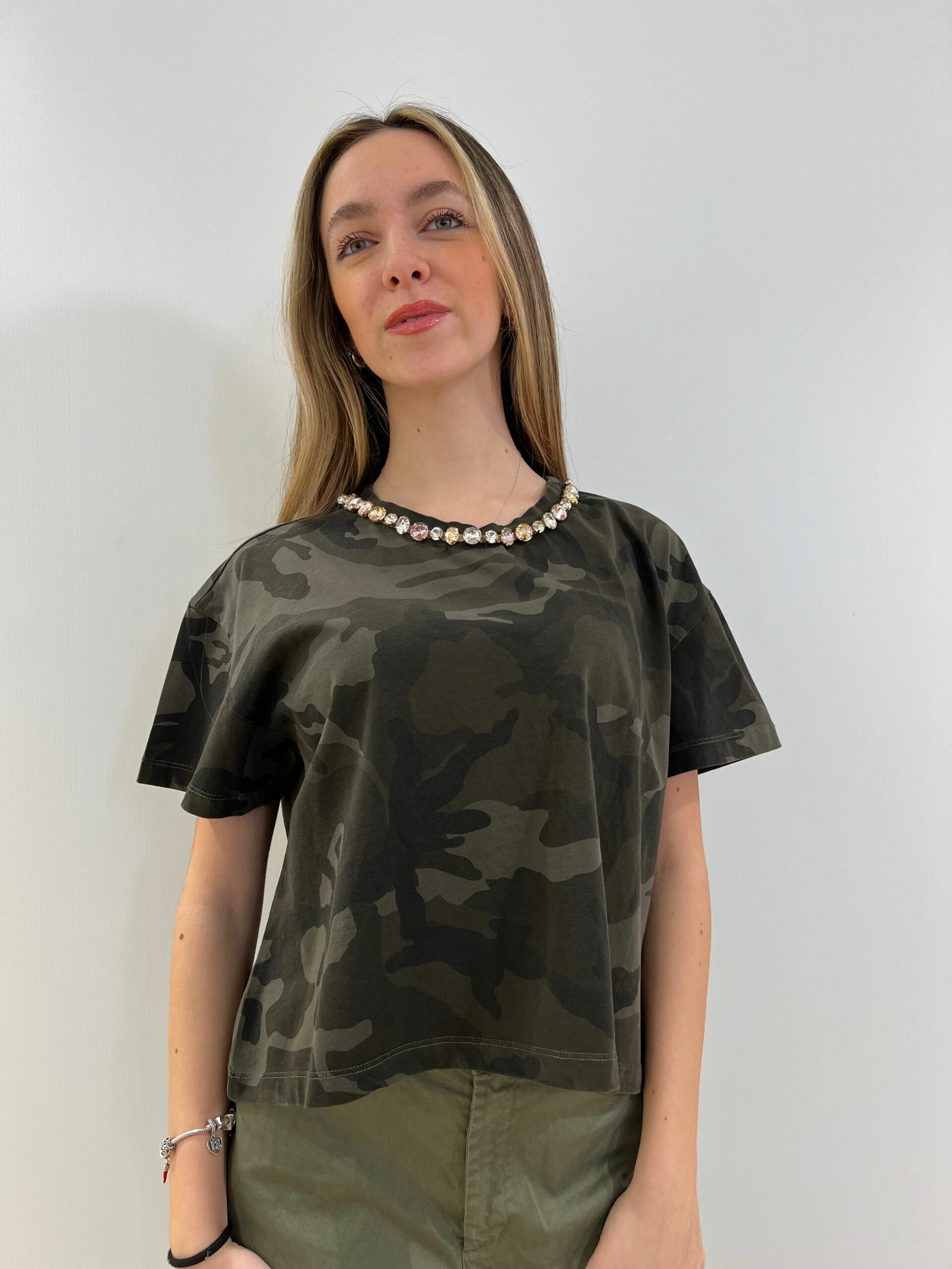 T-SHIRT CAMOUFLAGE CON GIRO DI STRASS NELLO SCOLLO