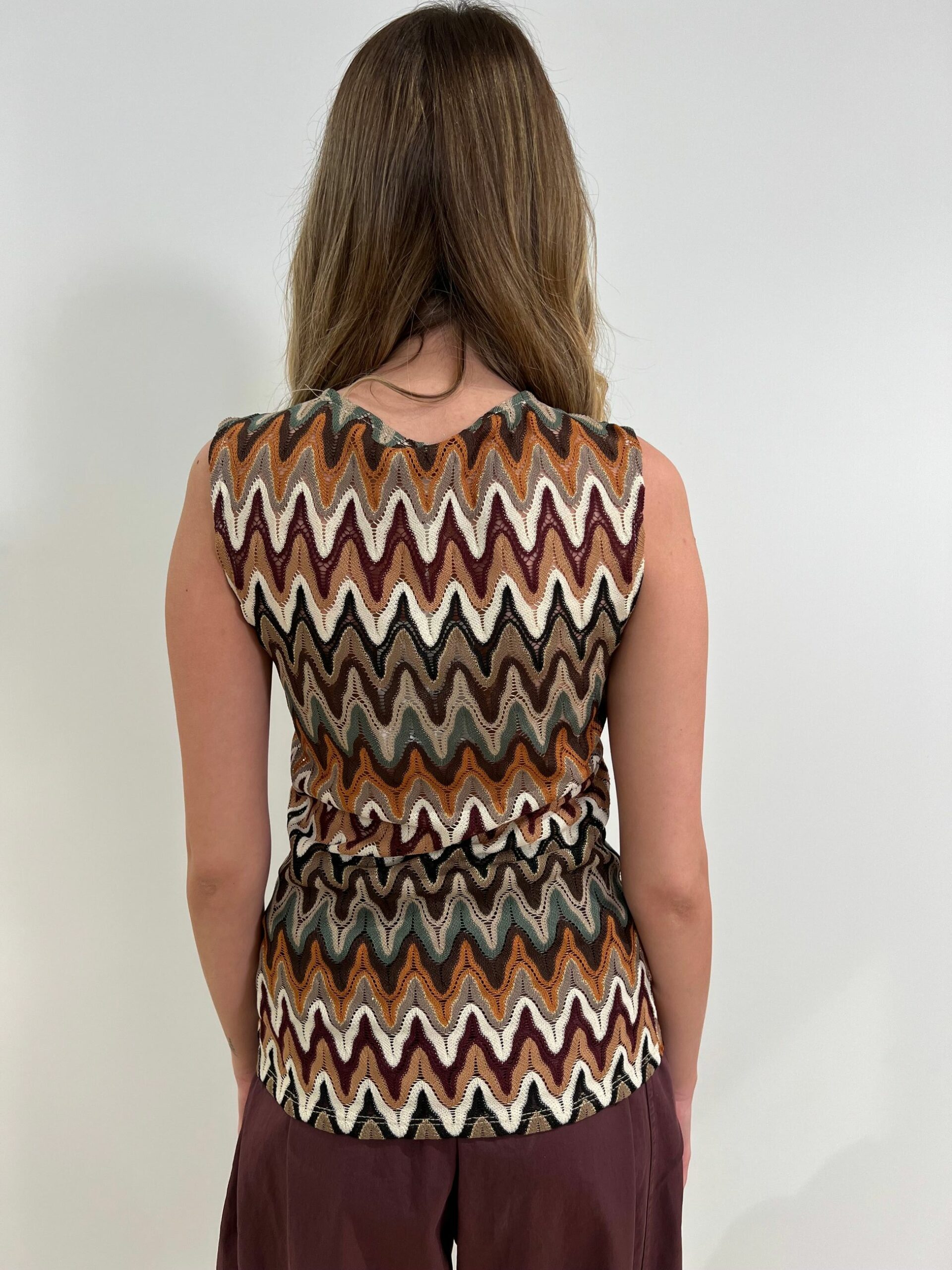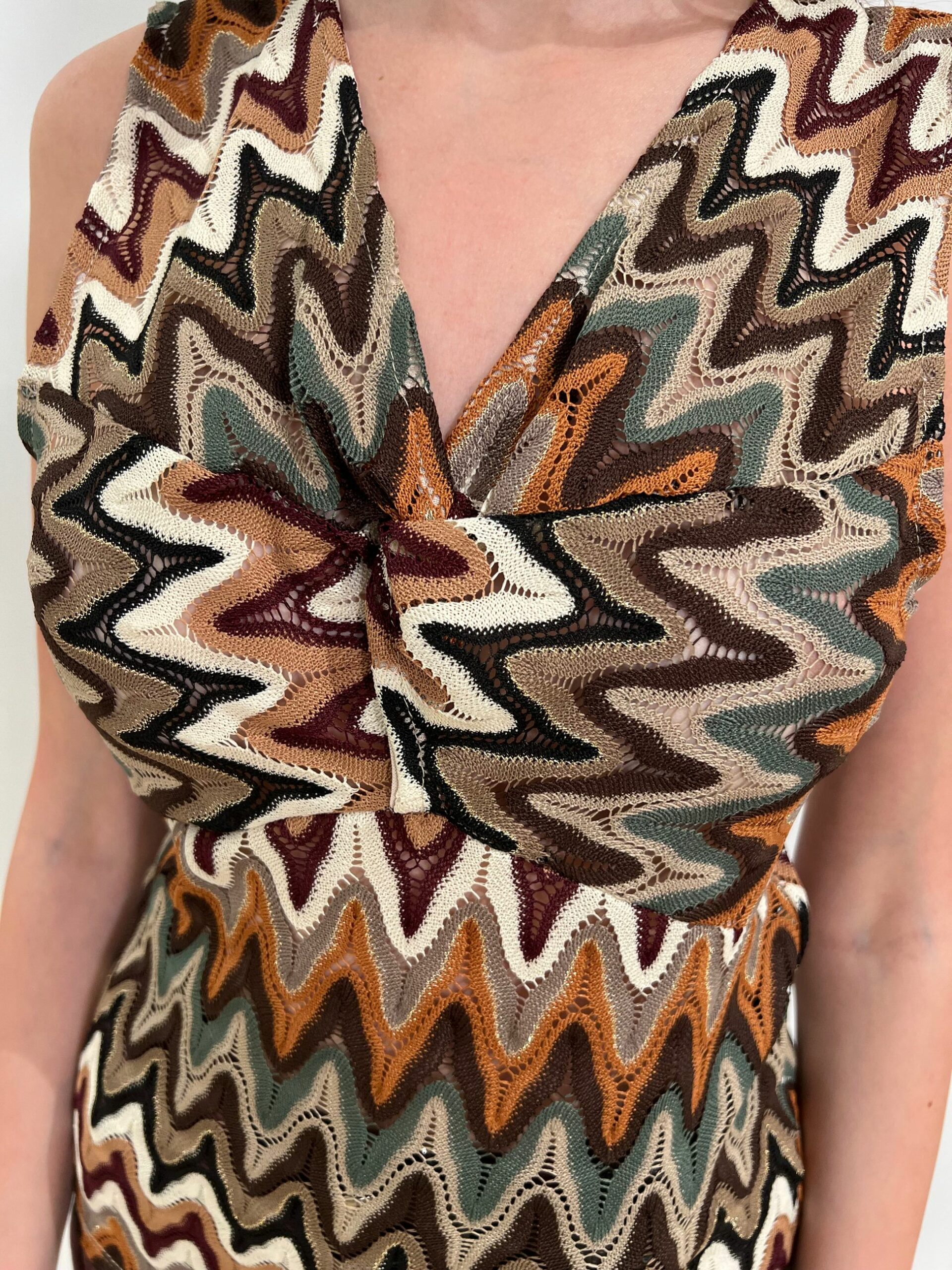 TOP A SPALLA LARGA CON MOTIVO A NODO SULLO SCOLLO IN FANTASIA TIPO MISSONI